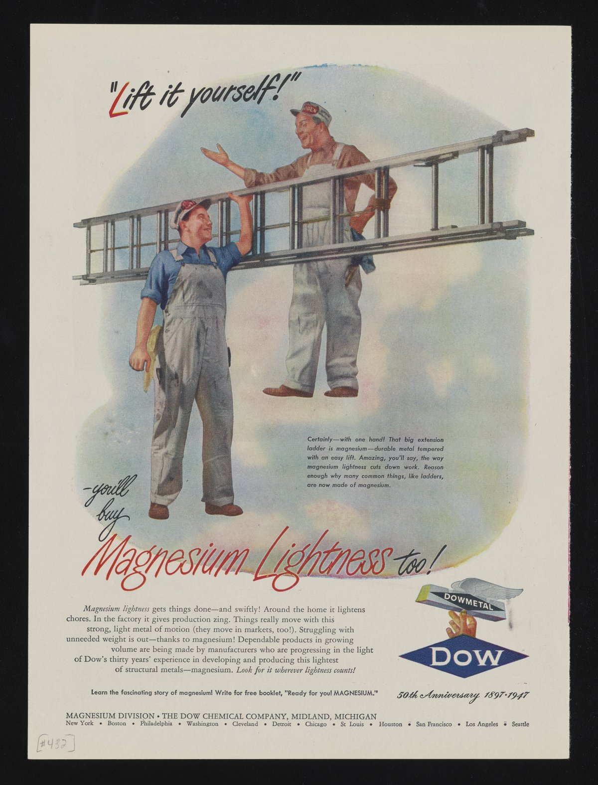 Color print advertisement for Dowmetal, a magnesium alloy manufactured and sold by the Dow Chemical Company. Depicts two men dressed in overalls, one holding a large ladder with one arm to demonstrate how lightweight materials manufactured with magnesium are.