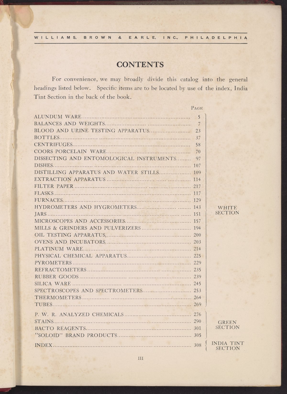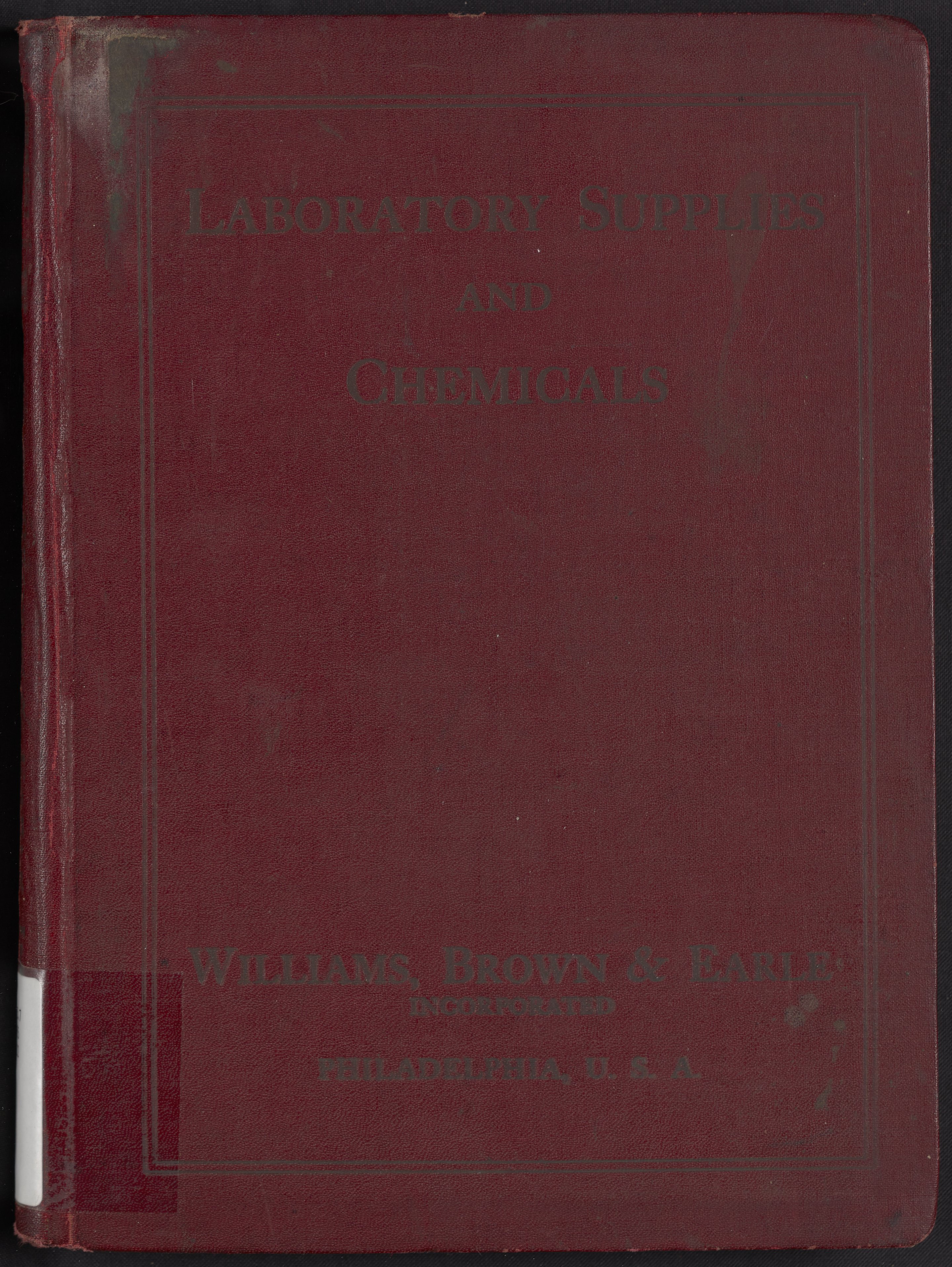 Williams, Brown. “Catalog of Laboratory Apparatus and Reagents for Industrial, Medical, Educational Laboratories.” Philadelphia, Pennsylvania: Brown Williams, 1922. Q185.7 .W55 1922. Science History Institute. Philadelphia. https://digital.sciencehistory.org/works/1jlzom2.