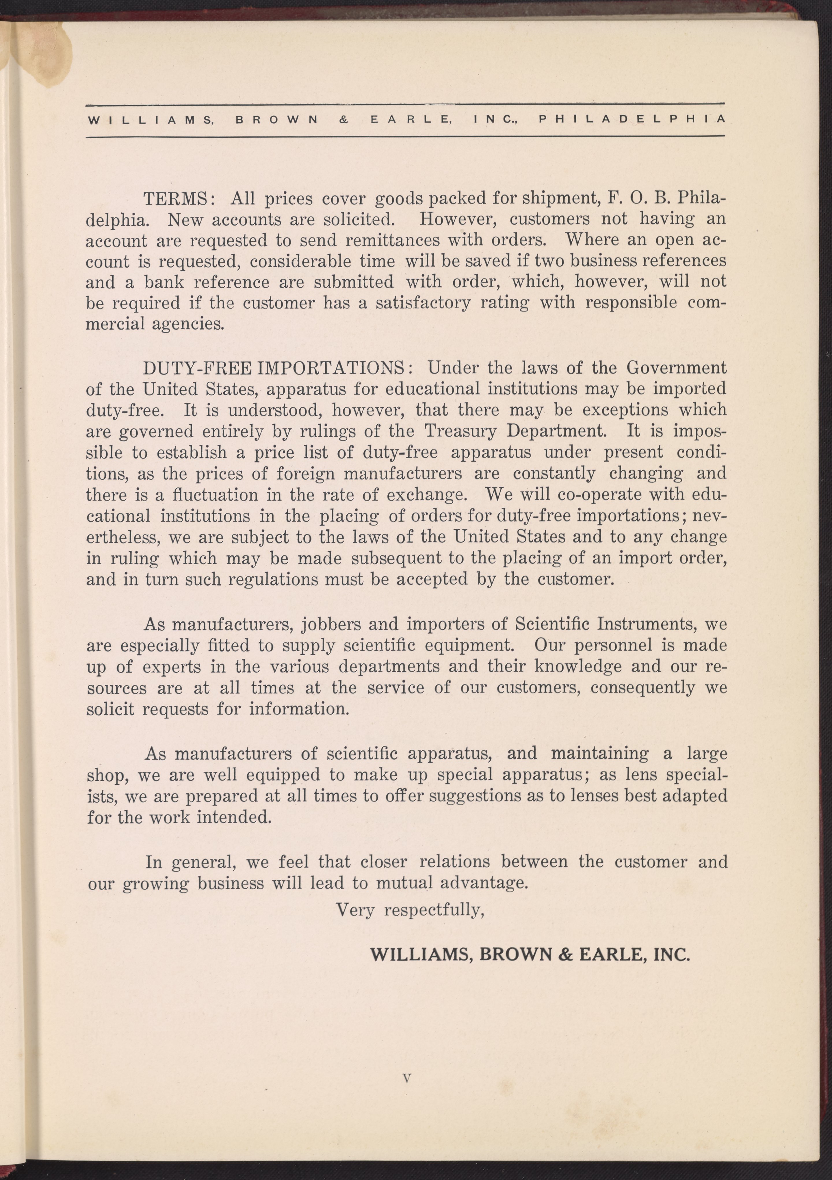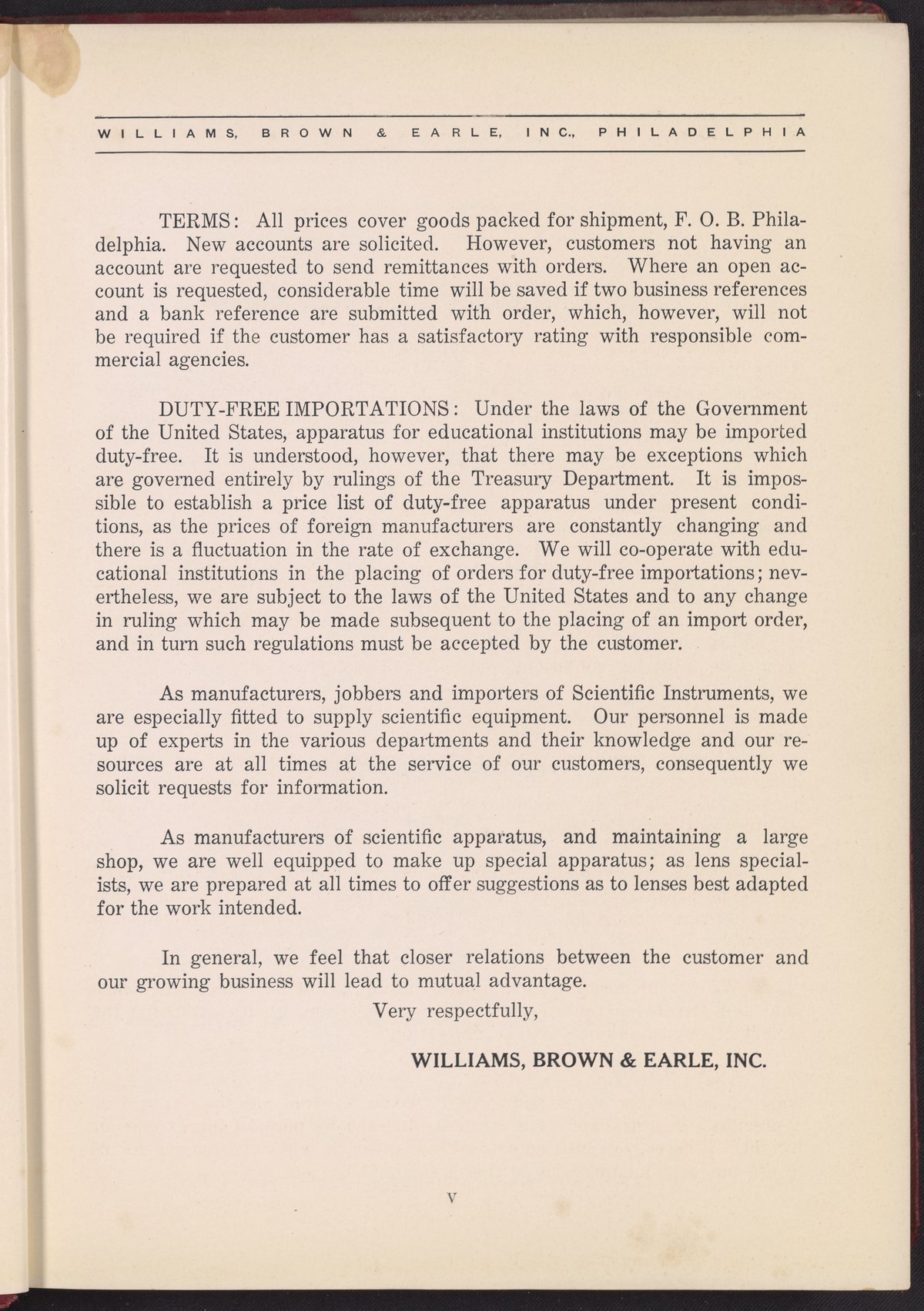 Williams, Brown & Earl was an American optical instrument and laboratory supply firm formed by H. S. Williams and N. H. Brown at 918 Chestnut Street, Philadelphia, Pennsylvania. This illustrated catalog includes the description and price of the instrument manufacturer's stock. Digitized content includes 9 illustrations and the work's front matter.