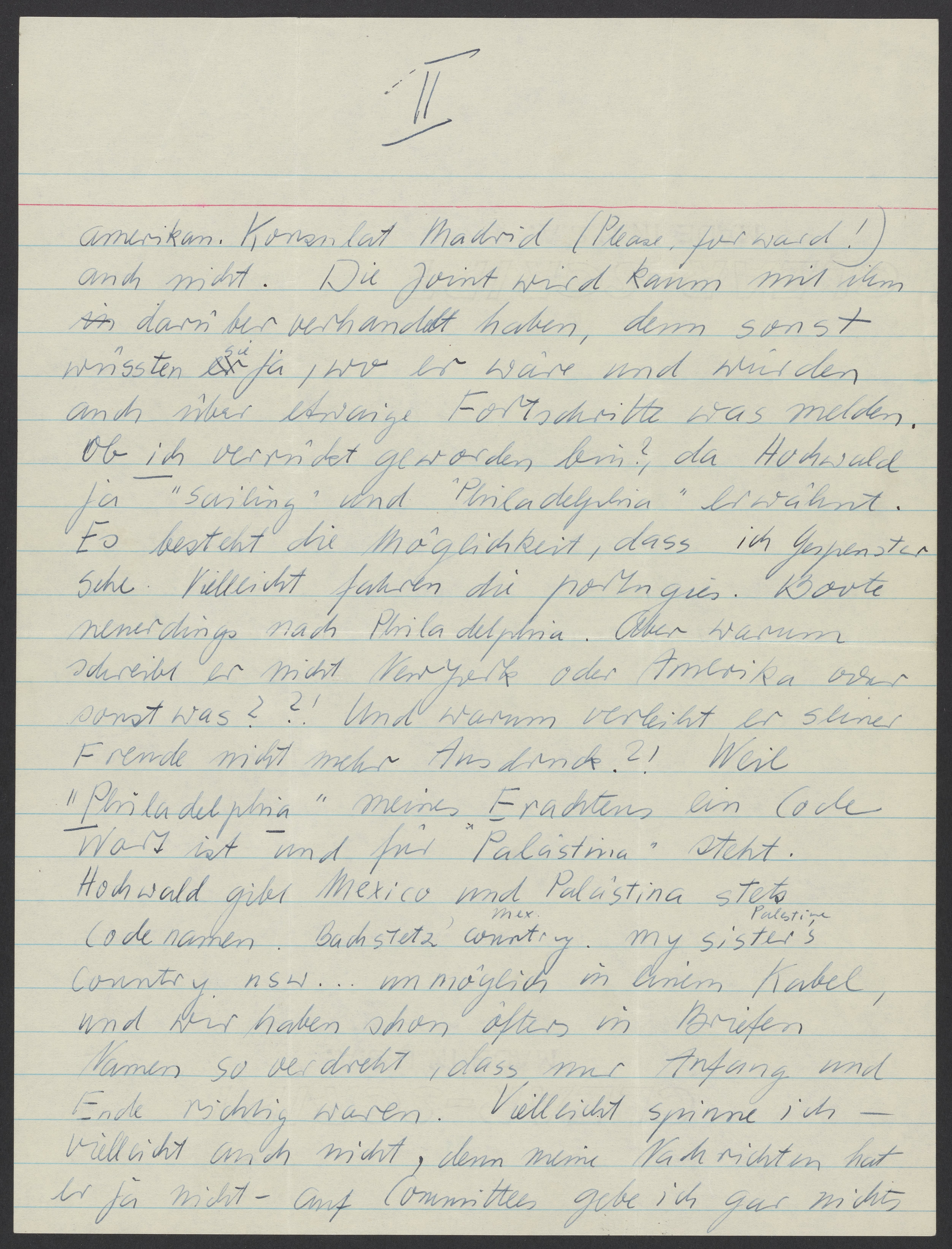 amerikan. Konsulat Madrid (Please forward!) auch nicht. Die Joint wird kaum mit ihm darüber verhandelt haben, denn sonst wüssten sie ja, wo er wäre und würden auch über etwaige Fortschritte was melden. Ob ich verrückt geworden bin?, da Hochwald ja sailing und "Philadelphia" erwähnt. Es besteht die Möglichkeit, dass ich Gespenster sehe. Vielleicht fahren die portgues. Boote neuerdings nach Philadelphia. Aber warum schreibt er nicht New York oder Amerika oder sonst was?? Und warum verleiht er seiner Freunde nicht mehr Ausdruck?! Weil "Philadelphia" meines Erachtens ein Code-Wort ist und für Palästina steht. Hochwald gibt Mexico und Palästinas stets Codenamen. Bachstetz Country Mex. My sister’s country Palestine u.s.w… unmöglich in einem Kabel, und wir haben öfters in Briefen Namen so verdreht, dass nur Anfang und Ende richtig waren. Vielleicht spinne ich – vielleicht auch nicht, denn meine Nachrichten hat er ja nicht – auf Committees gebe ich gar nichts