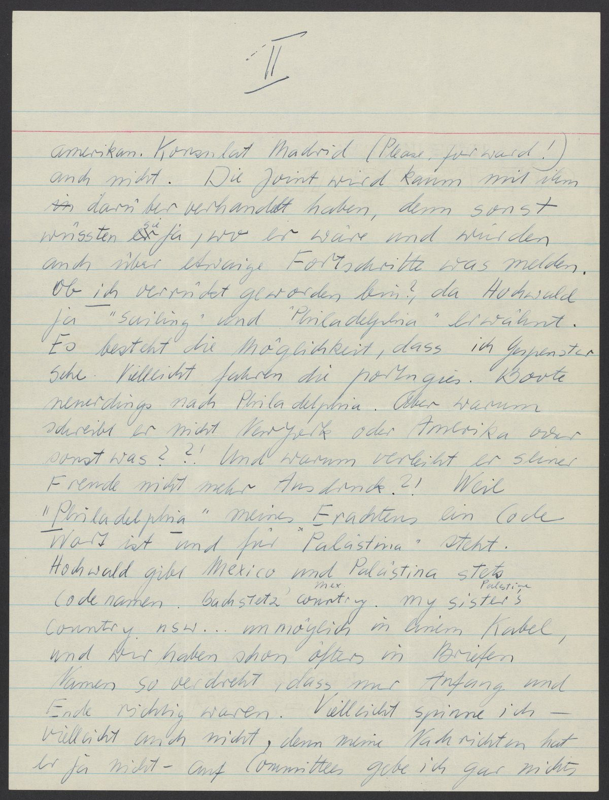 The same goes for my letters to the camp and the American Consulate in Madrid. Joint would not have handled this for him. Otherwise, they would know where he was and would also share news of any progress. Have I gone crazy? Especially since Hochwald mentions sailing and “Philadelphia.” Perhaps I am seeing ghosts. Maybe the Portuguese ships are now sailing to Philadelphia. However, why doesn’t he write New York or America or something similar? Moreover, why doesn’t he share more information with his friends? I think “Philadelphia” is a code word and stands for Palestine. Hochwald always gives codenames for Mexico and Palestine. “Bachstetz country” means Mexico. “My sister’s country” means Palestine. It’s impossible to write in a cable and we often got names mixed up in letters so that only the first and last letters were correct. Maybe I'm crazy - maybe not. He doesn’t have my messages and I don’t care about committees.