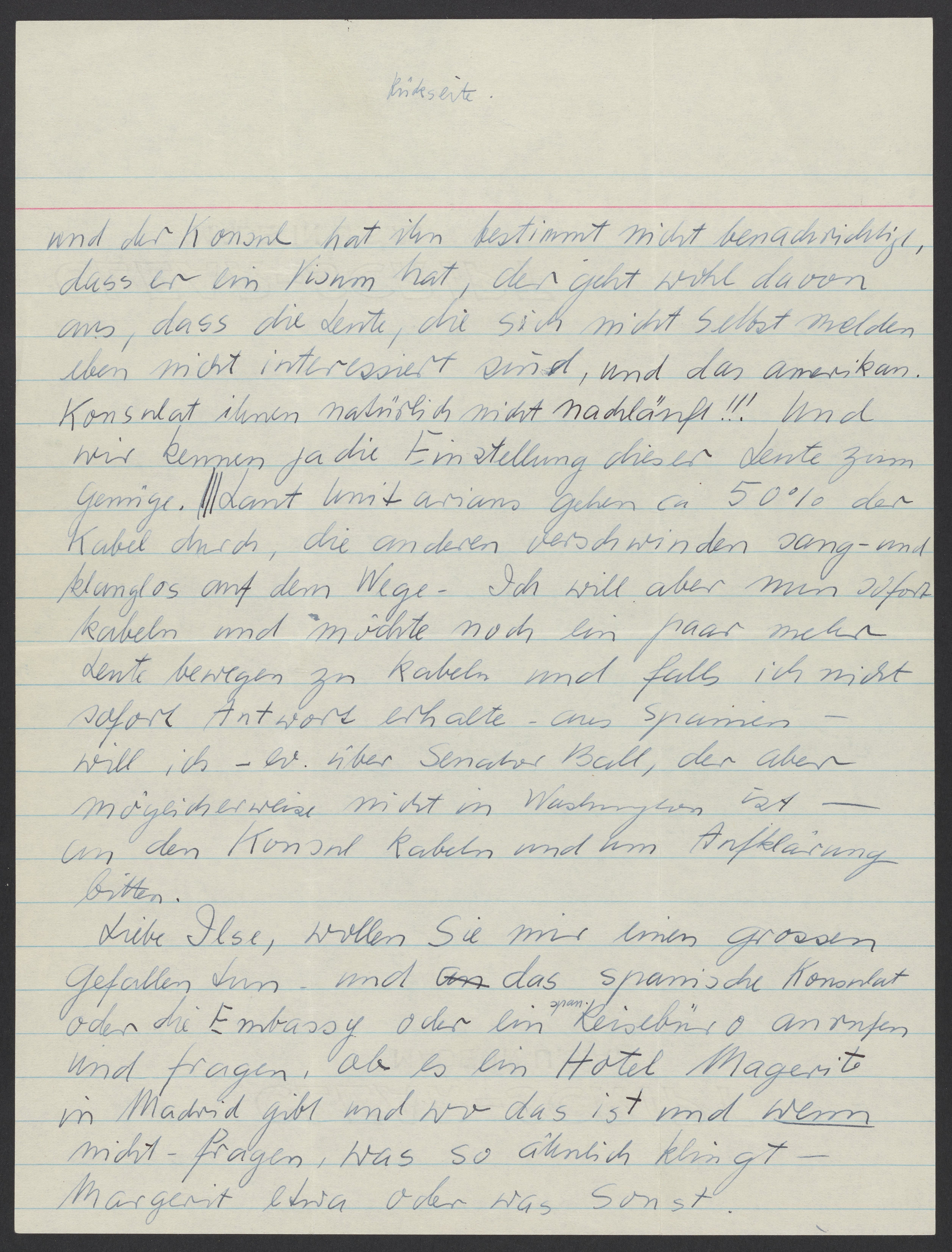 Liebe Ilse, wollen Sie mir einen grossen Gefallen tun und das spanische Konsulat oder die Embassy oder ein span. Reisebüro anrufen und fragen, ob es ein Hotel Margerit in Madrid gibt und wo das ist und wenn nicht – fragen, was so ähnlich kling – Margerit etwas oder was sonst.