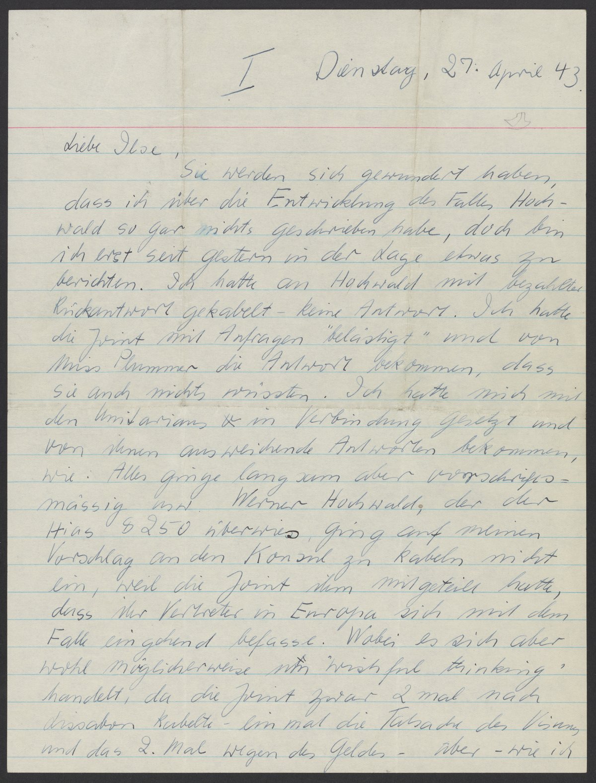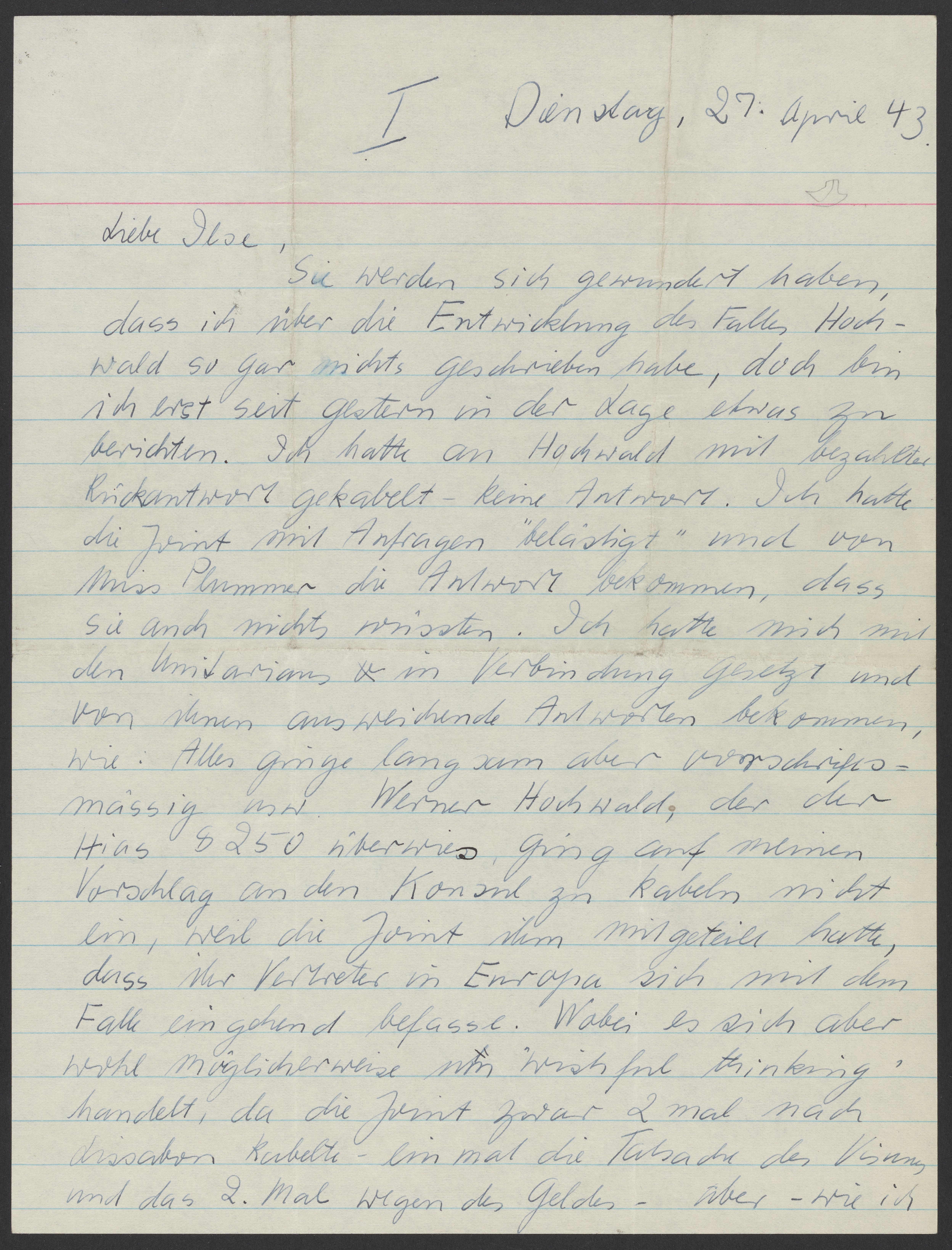 Sie werden sich gewundert haben, dass ich über die Entwickelung des Falls Hochwald so gar nichts geschrieben habe, doch bin ich erst seit gestern in der Lage etwas zu berichten. Ich hatte an Hochwald mit bezahlter Rückantwort gekabelt – keine Antwort. Ich hatte die Joint mit Anfragen „belästigt“ und von Miss Plummer die Antwort bekommen, dass sie auch nichts wüssten. Ich hatte mich mit den Unitarians in Verbindung gesetzt und von ihnen ausweichende Antworten bekommen, wie: Alles ginge langsam aber vorschriftsmäßig usw. Werner Hochwald, der der Hias $250 überwies, ging auf meinen Vorschlag an den Konsul zu kabeln nicht ein, weil die Joint ihm mitgeteilt hatte, dass ihr Vertreter in Europa sich mit dem Fall eingehend befasse. Wobei es sich aber wohl möglicherweise um "wishful thinking" handelt, da die Joint zwar 2mal nach Lissabon kabelte – einmal die Tatsache des Visums und das 2. Mal wegen des Geldes – aber – wie ich