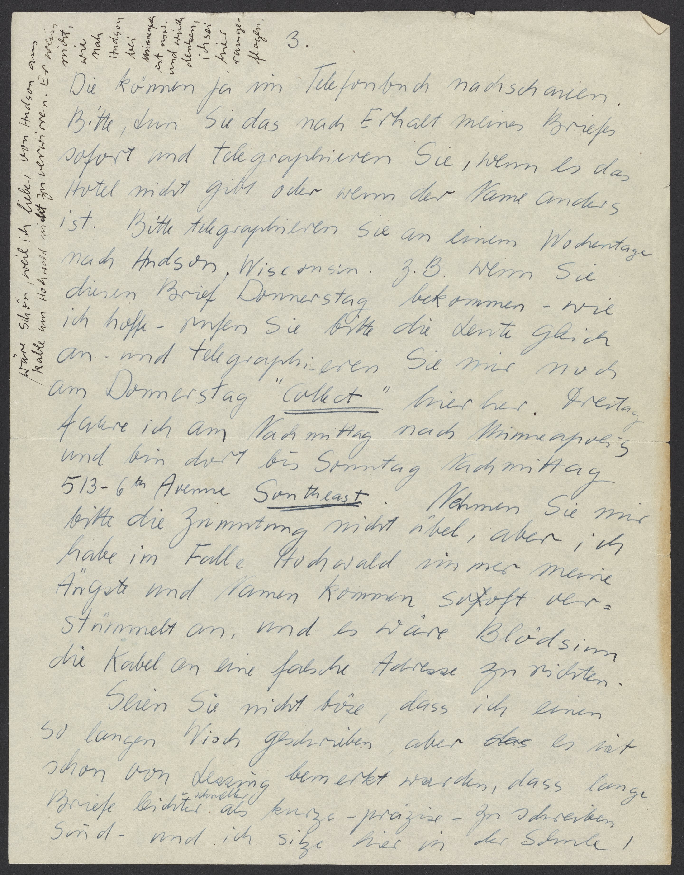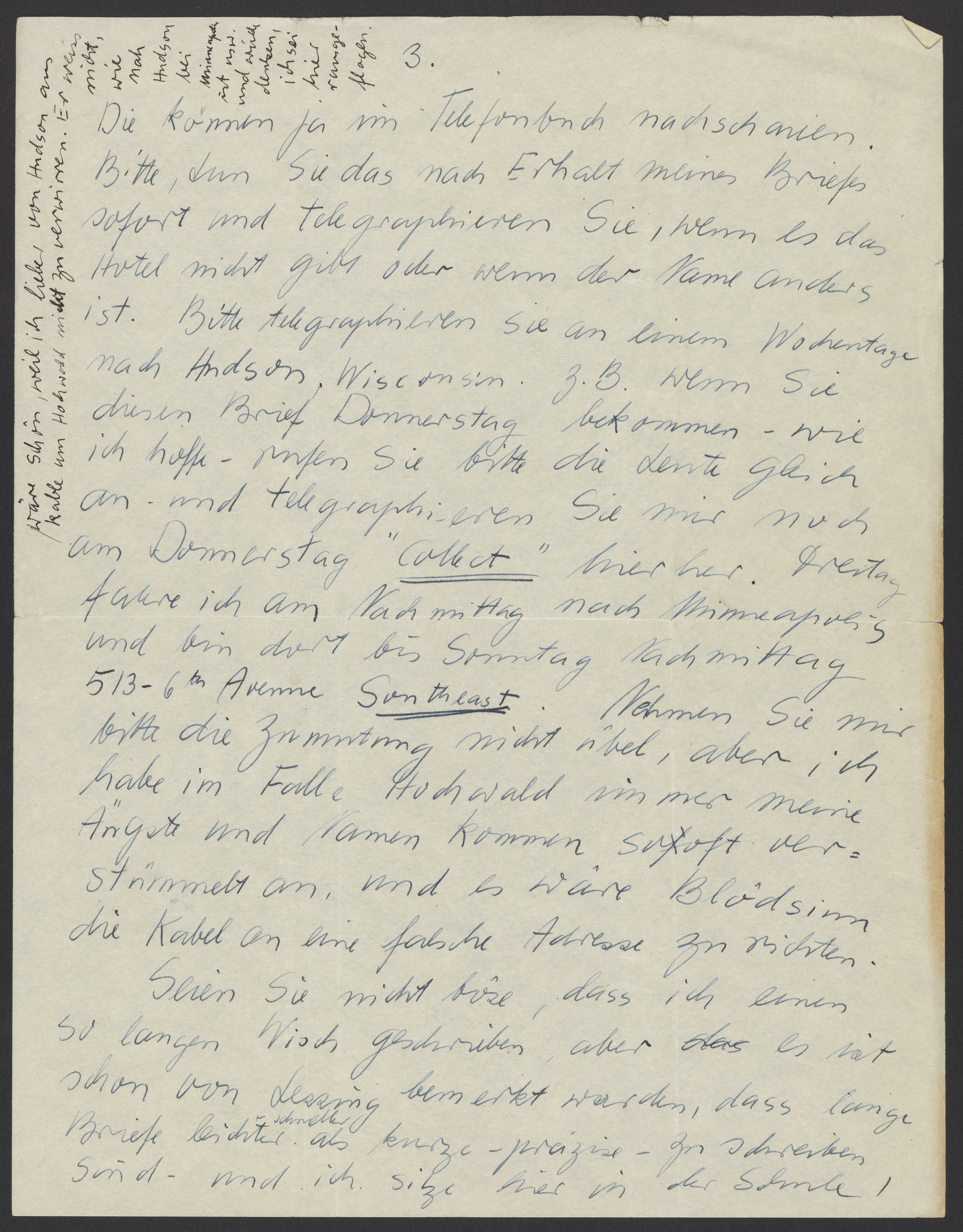 Die können im Telefonbuch nachschauen. Bitte tun Sie das nach Erhalt meines Briefes sofort und telegraphieren Sie, wenn es das Hotel nicht gibt oder wenn der Name anders ist. Bitte telegraphieren Sie an einem Wochentage nach Hudson, Wisconsin z.B. wenn Sie diesen Brief Donnerstag bekommen – wie ich hoffe – rufen Sie bitte die Leute gleich an – und telegraphieren Sie mir noch am Donnerstag „collect“ hierher. Dienstag fahre ich am Mittag nach Minneapolis und bin dort bis Sonntag Nachmittag 513-6th Avenue Southeast. Nehmen Sie mir bitte die Zumutung nicht übel, aber ich habe im Falle Hochwalds immer meine Ängste und Namen kommen sofort verstümmelt an, und es wäre Blödsinn die Kabel an eine falsche Adresse zu richten.