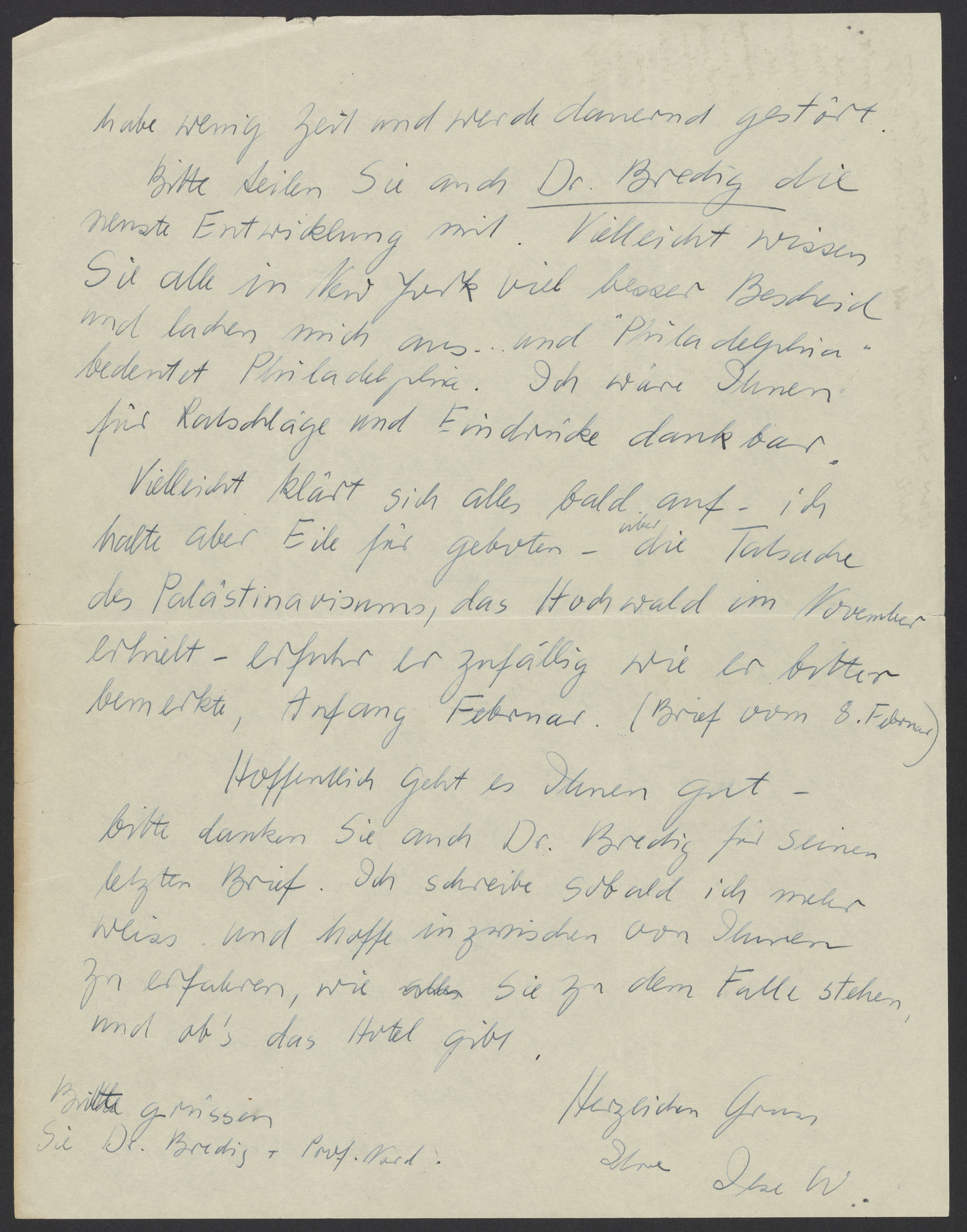 Bitten teilen Sie Dr. Bredig die neueste Entwicklung mit. Vielleicht wissen Sie alle in New York viel besser Bescheid und lachen mich aus… und "Philadelphia" bedeutet Philadelphia. Ich wäre Ihnen für Ratschläge und Eindrucke dankbar.