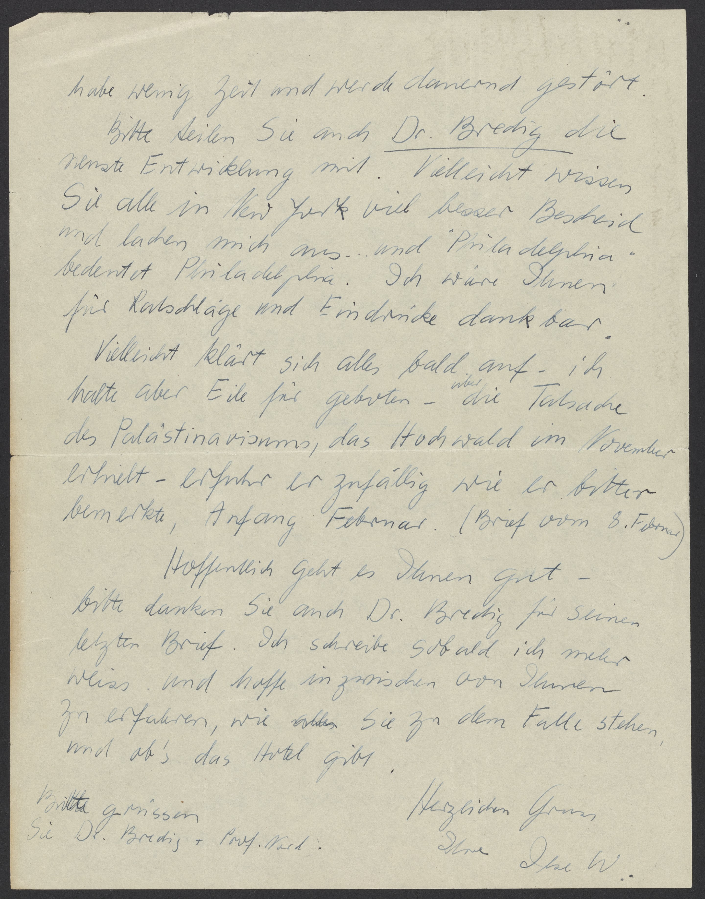 Vielleicht klärt sich alles bald auf – ich halte aber Eile für geboten – über die Tatsache des Palästinavisums, das Hochwald im November erhielt – erfuhr er zufällig wie er bitter bemerkte, Anfang Februars. (Brief vom 8. Februar)