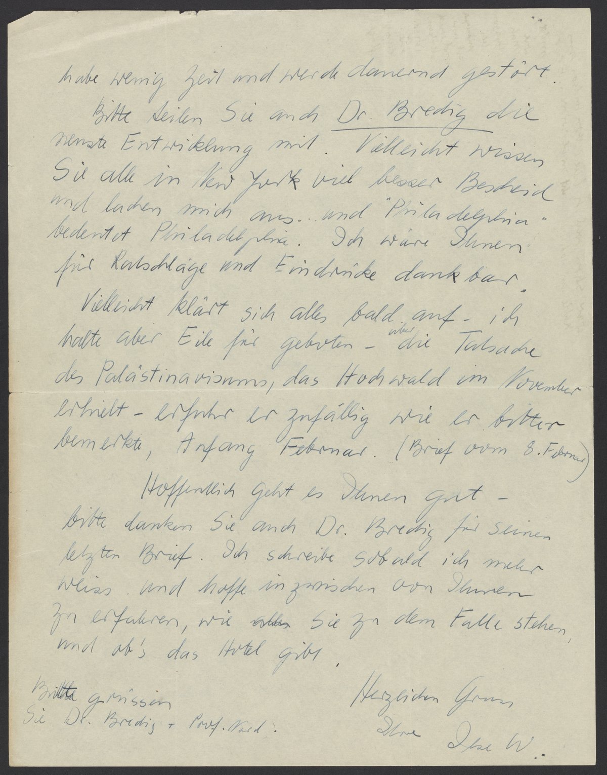 Hoffentlich geht es Ihnen gut – bitten danken Sie auch Dr. Bredig für seinen letzten Brief. Ich schreibe sobald ich mehr weiss und hoffe inzwischen von Ihnen zu erfahren, wie Sie zu dem Falle stehen und ob’s das Hotel gibt.