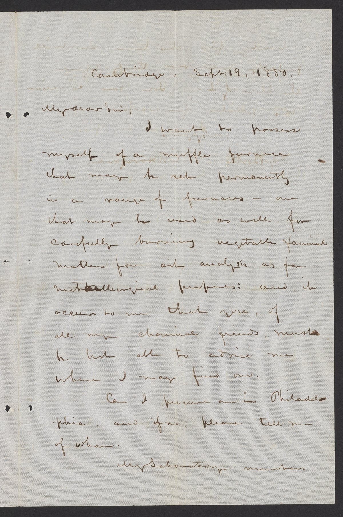 Small JPG1200 x 1806px — 554 KBFull-sized JPG2261 x 3402px — 1.8 MBOriginal fileTIFF — 2261 x 3402px — 22.1 MBEben Norton Horsford (1818-1893) requests information concerning a muffle furnace from James Curtis Booth (1810-1888). Horsford was an American scientist who taught agricultural chemistry in the Lawrence Scientific School at Harvard from 1847 to 1863.