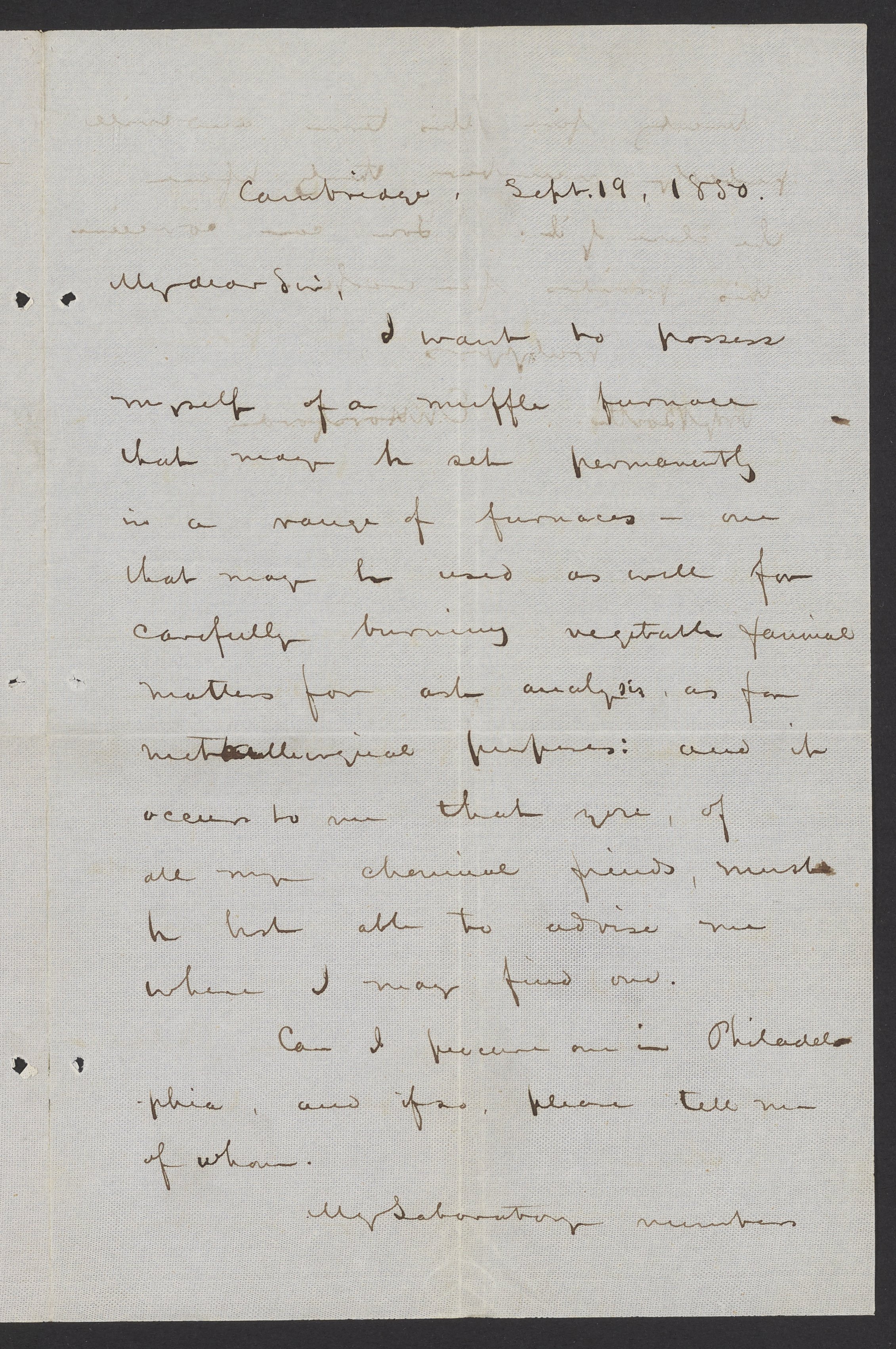 Small JPG1200 x 1806px — 554 KBFull-sized JPG2261 x 3402px — 1.8 MBOriginal fileTIFF — 2261 x 3402px — 22.1 MBEben Norton Horsford (1818-1893) requests information concerning a muffle furnace from James Curtis Booth (1810-1888). Horsford was an American scientist who taught agricultural chemistry in the Lawrence Scientific School at Harvard from 1847 to 1863.