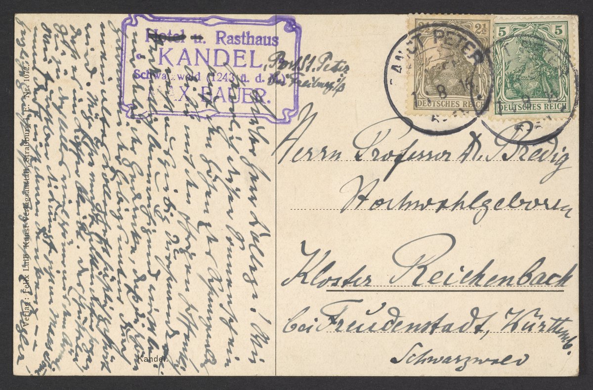 Lieber Herr Kollege! Wie herrlich dieser Sonnenschein mit den Höhen des Schwarzwalds, die Sie mit den Ihrigen hoffentlich noch ausgiebig durchwandern. Ordentlich beruhigend wirkt bei mir dabei der Gedanke, daß die schöne Harmonie der Gebirgsnatur durch mein altes Kollegstift füglich gekürt wird. Möge Ihre nächste Hüttentour sogar, daß es im Koffer bleibt. Das schütteln Sie ja doch alles nie schöner aus dem Ärmel. Wie fruchtbar die Kunst jetzt an Malers Sonne; man darf nicht daran denken. - - -