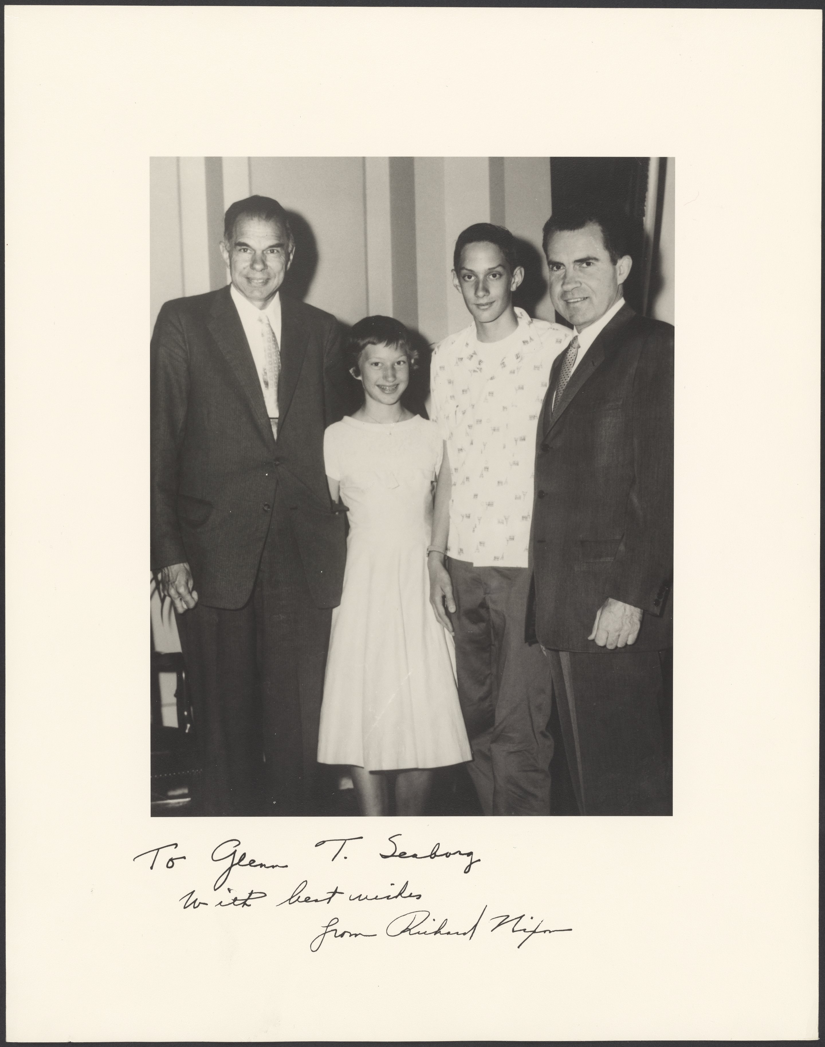 Nixon inscribed the photograph with a note and his signature, "To Glenn T. Seaborg with best wishes from Richard Nixon."