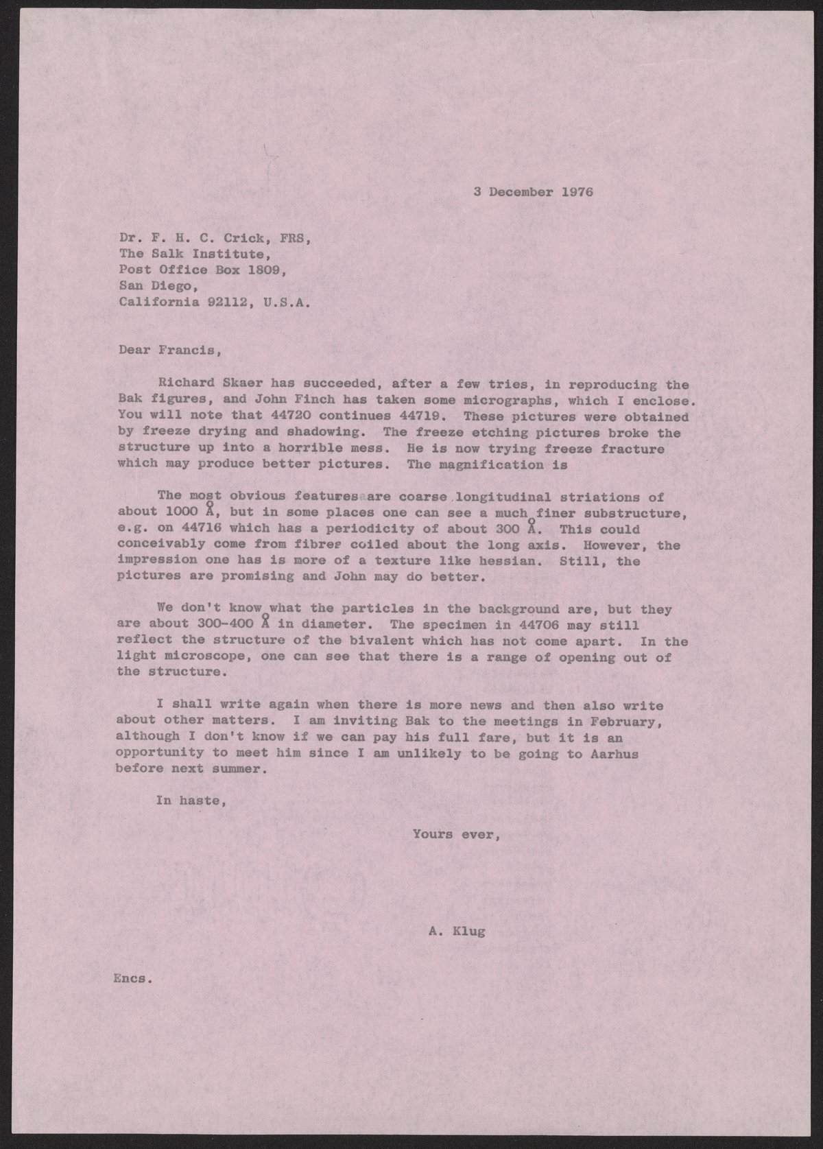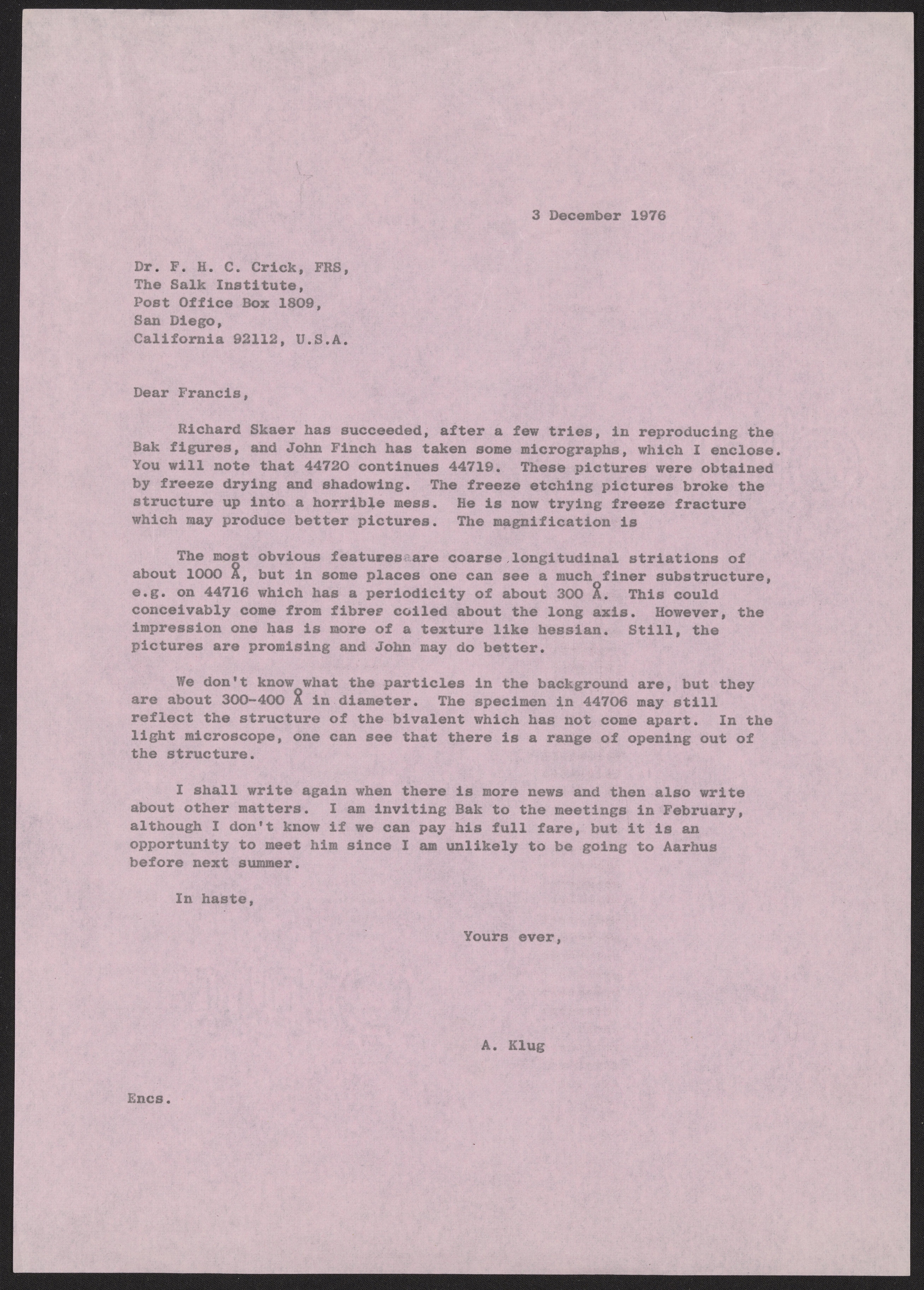 Klug, A. (Aaron), Sir. “Letter from Francis Crick to Aaron Klug, December 3, 1976,” December 3, 1976. History of Molecular Biology Collection, Box 10, Folder 25. Science History Institute. Philadelphia. https://digital.sciencehistory.org/works/1m5biba.