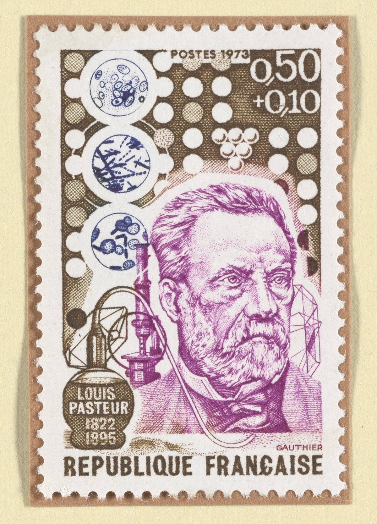 Gauthier, Jacques. “French Semipostal Stamp Commemorating Louis Pasteur.” France, 1973. Witco Stamp Collection, Box 1. Science History Institute. Philadelphia. https://digital.sciencehistory.org/works/1n79h434j.