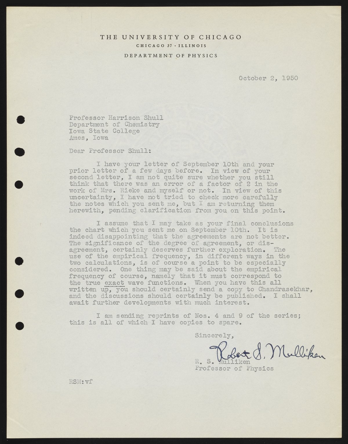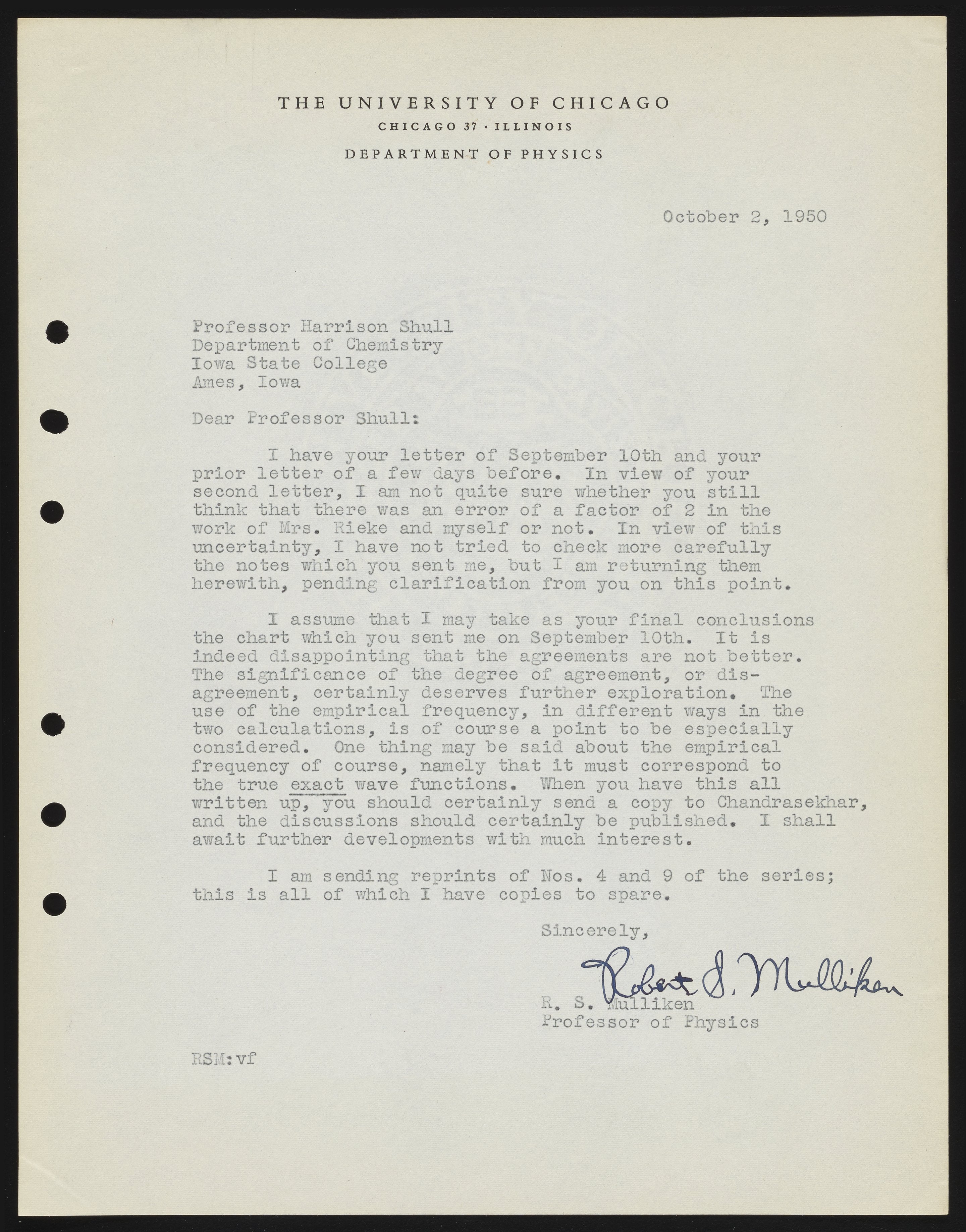Letter from Robert S. Mulliken to Harrison Shull, 1950