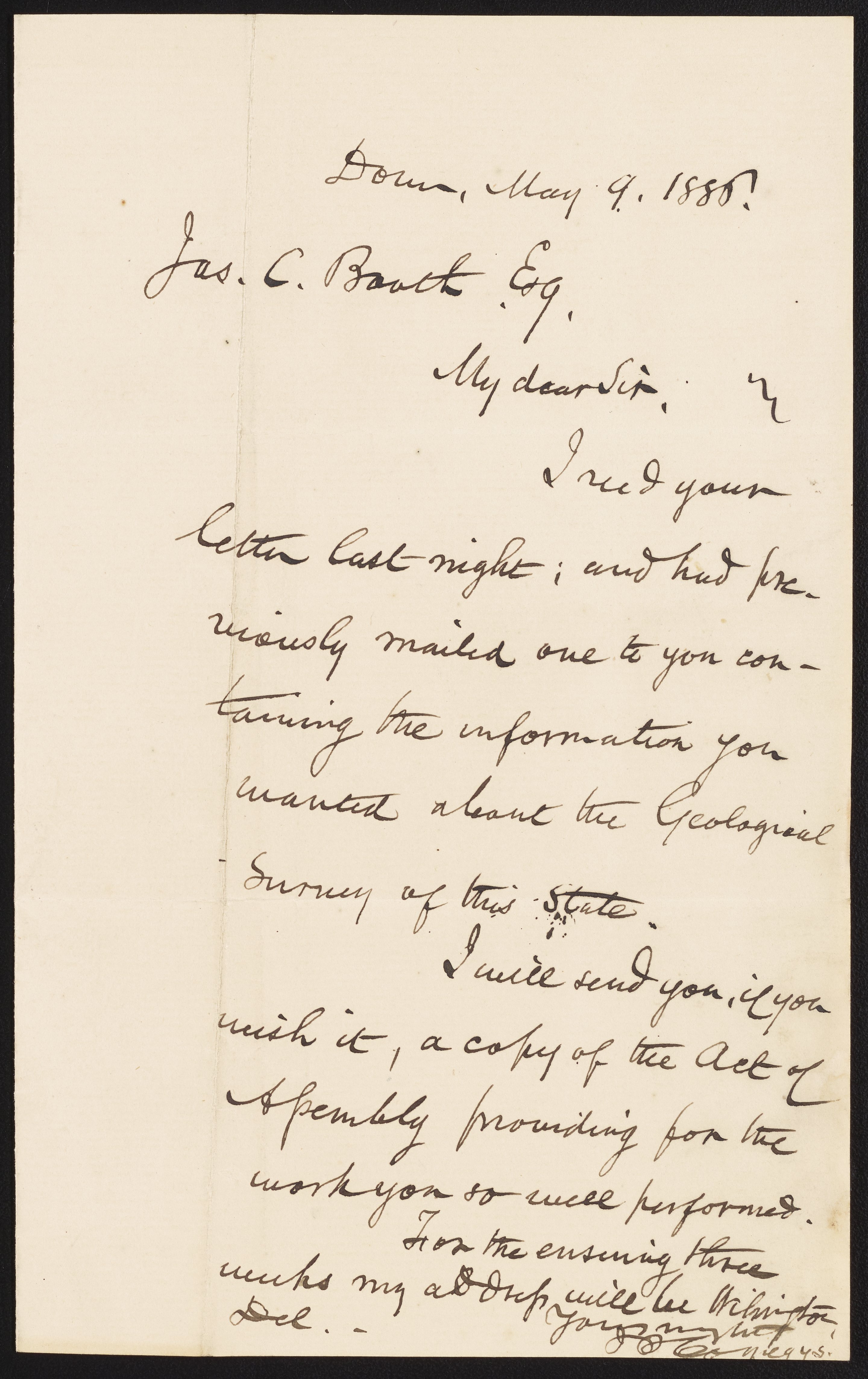Joseph P. Comegys (1813-1893), an American judge, lawyer, and politician from Dover, Delaware, provides James Curtis Booth (1810-1888) with information on the Geological Survey of the State of Delaware.