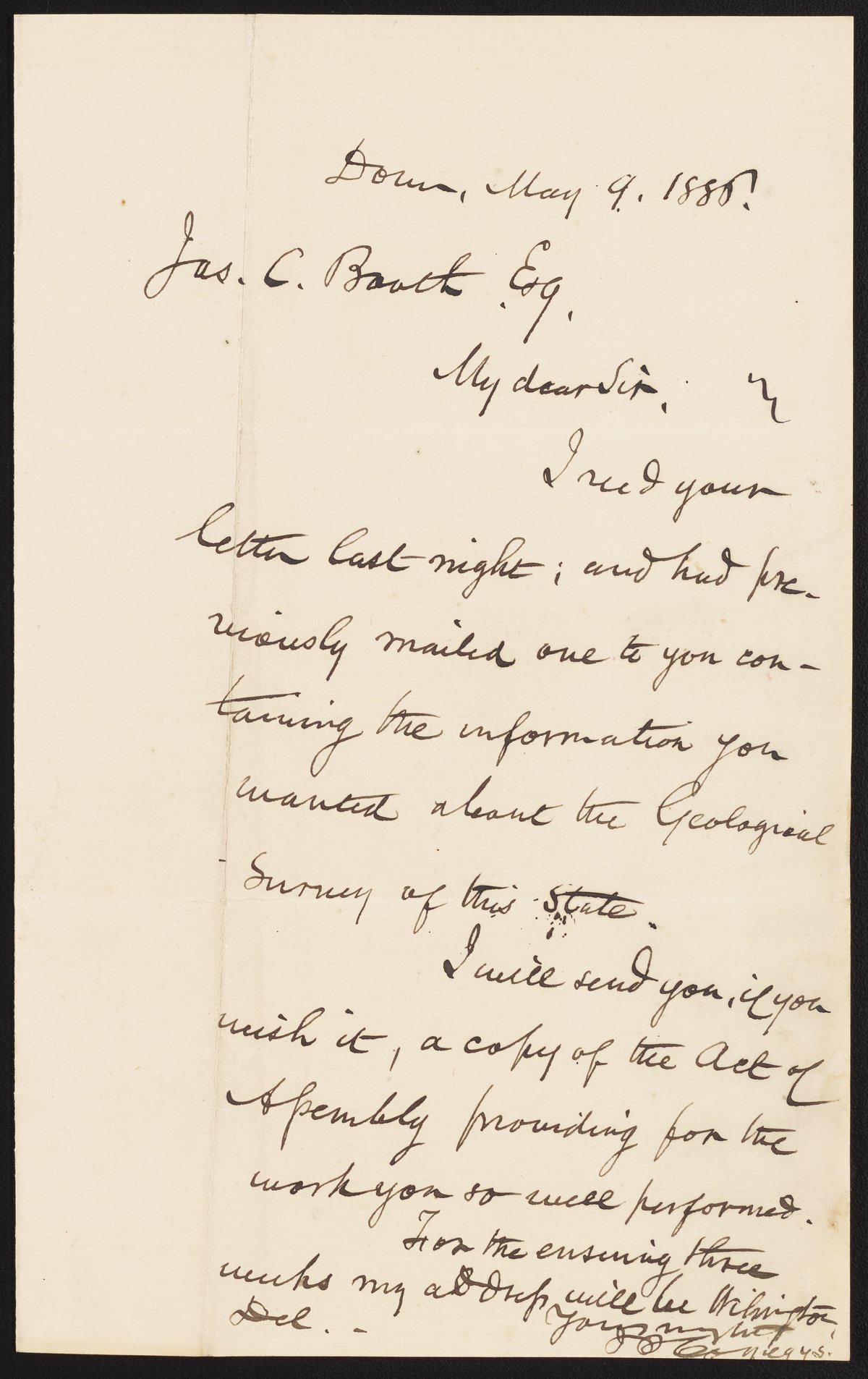Letter from Joseph P. Comegys to James Curtis Booth, May 9, 1885