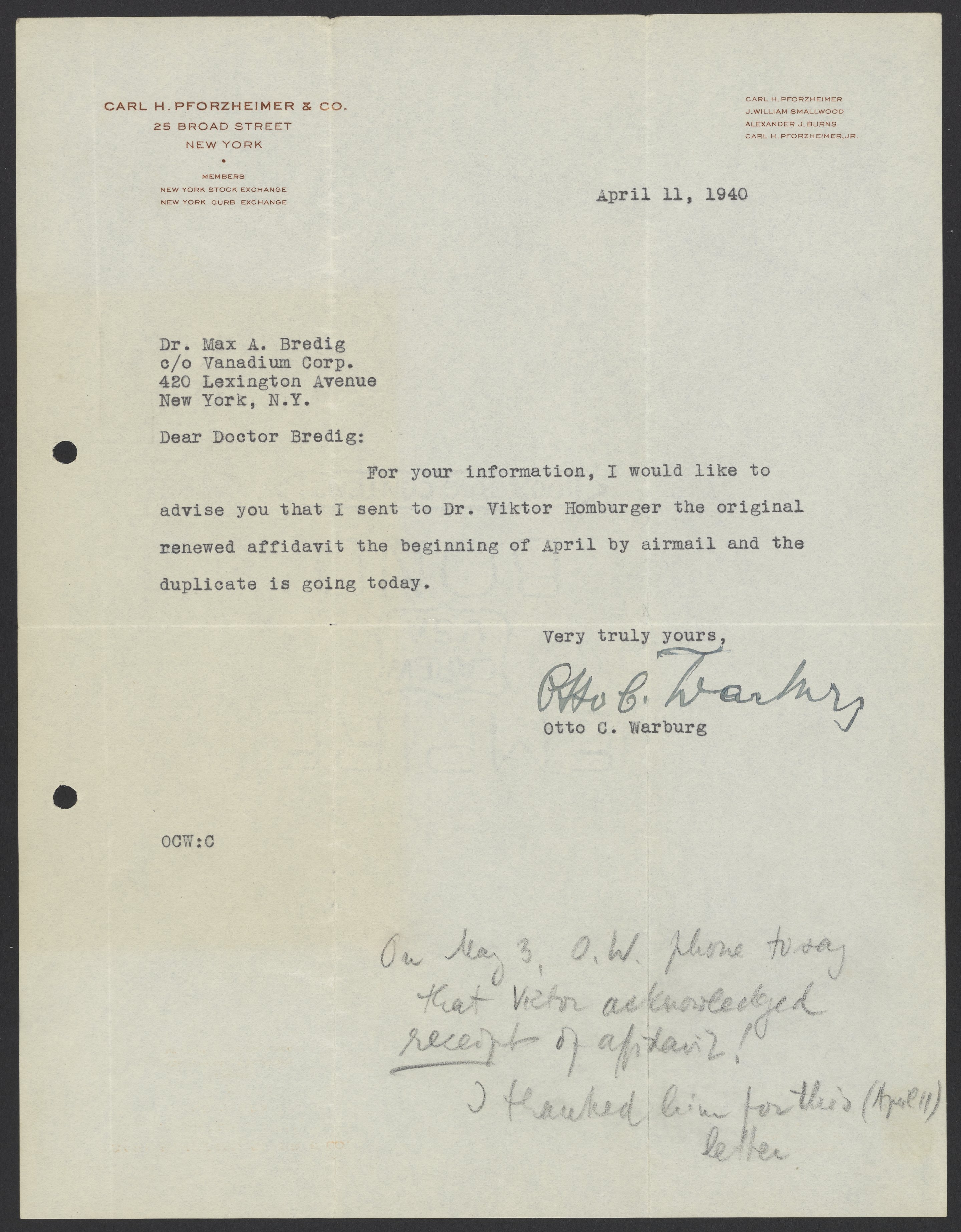 Otto Warburg informs Max Bredig (1902-1977) that he has mailed a duplicate affidavit to vouch for the immigration of Viktor Homburger (1888-1968).