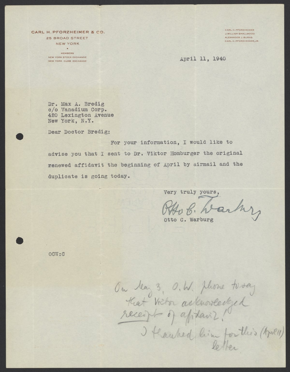 Letter from Otto C. Warburg to Max Bredig, April 11, 1940