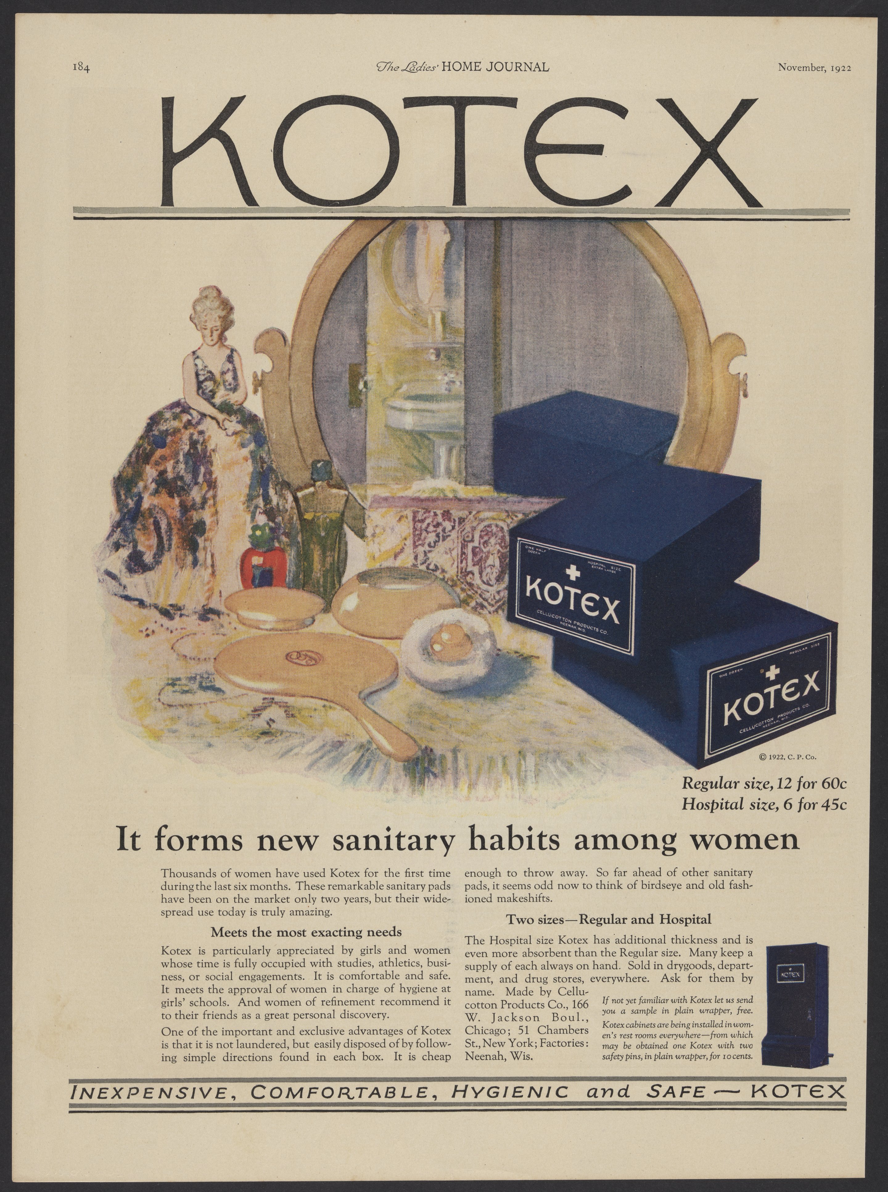 Kotex sanitary pad advertisement from a November 1922 issue of Ladies' Home Journal. The ad asserts that disposable Kotex pads are inexpensive, comfortable, hygienic, and safe.