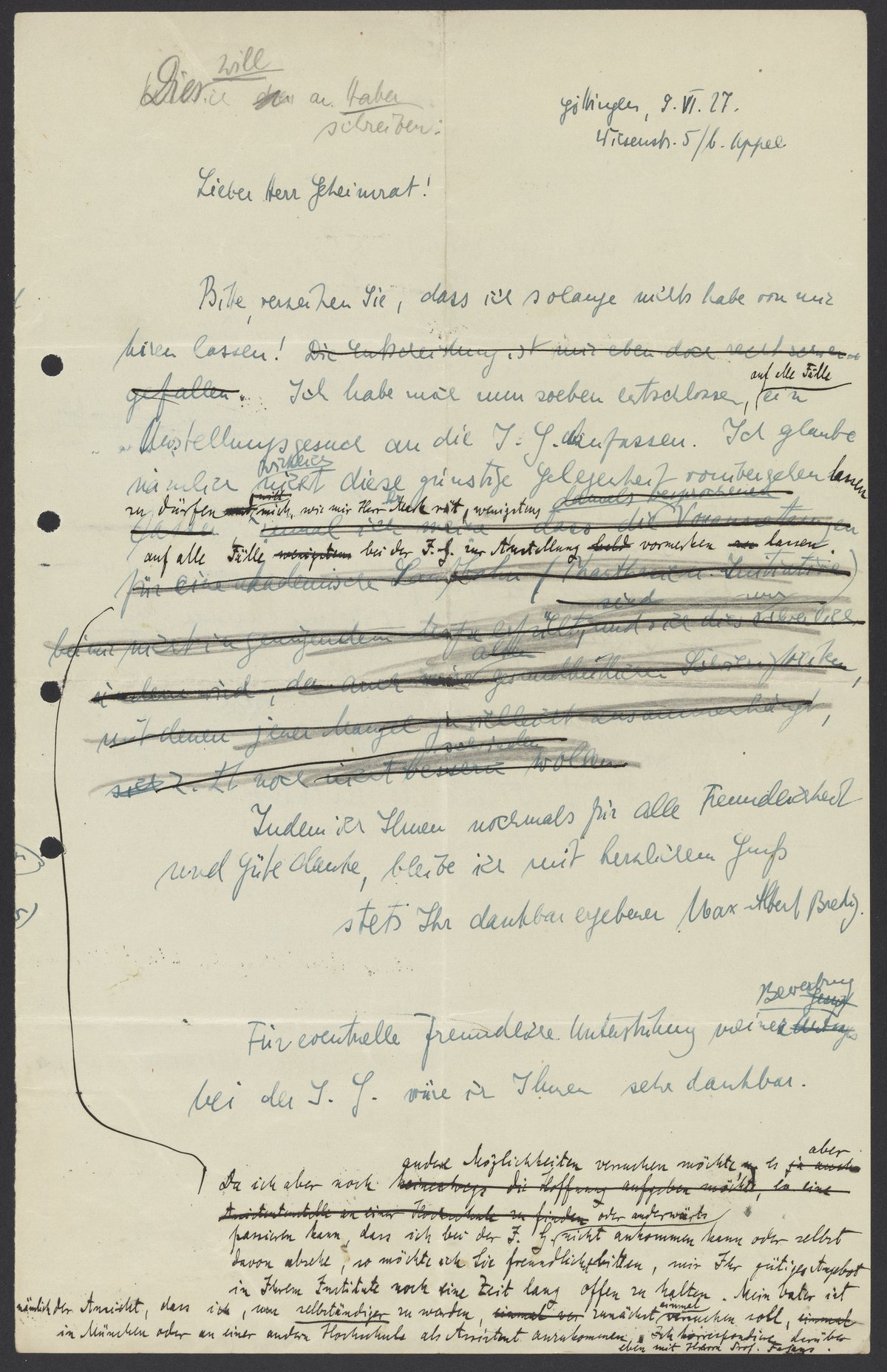 Max Bredig (1902-1977) drafts a letter to Fritz Haber (1868-1934) regarding potential employment in his laboratory.