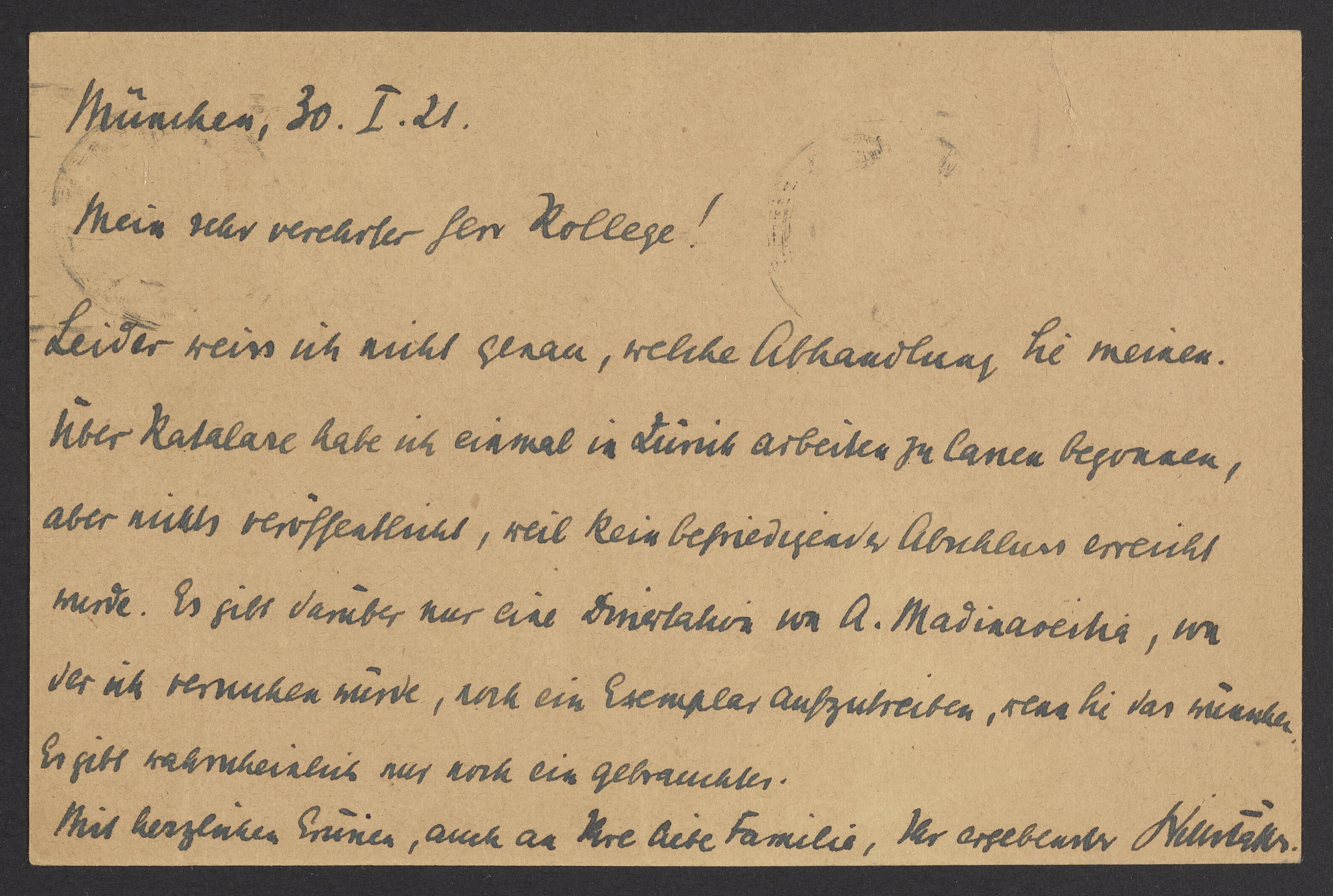 Willstätter, Richard. “Postcard from Richard Willstätter to Georg Bredig, January 1921,” January 30, 1921. Papers of Georg and Max Bredig, Box 2, Folder 28. Science History Institute. Philadelphia. https://digital.sciencehistory.org/works/1quqxwp.