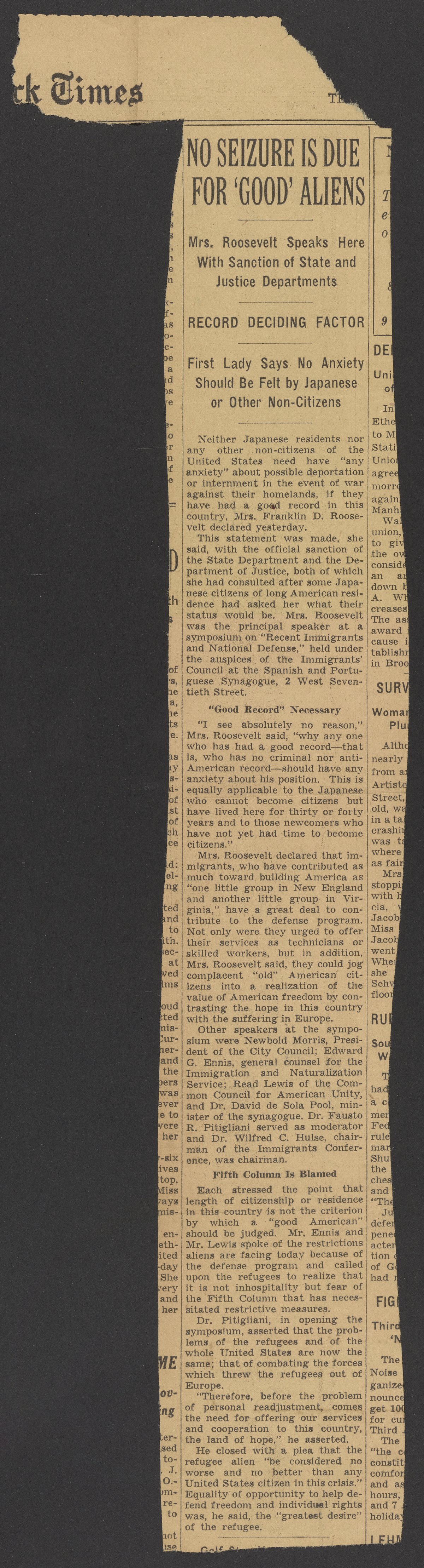 “No Seizure Is Due for 'Good' Aliens.” New York, New York: New York times, circa 1940. Papers of Georg and Max Bredig, Box 10, Folder 26. Science History Institute. Philadelphia. https://digital.sciencehistory.org/works/1ro0sl9.