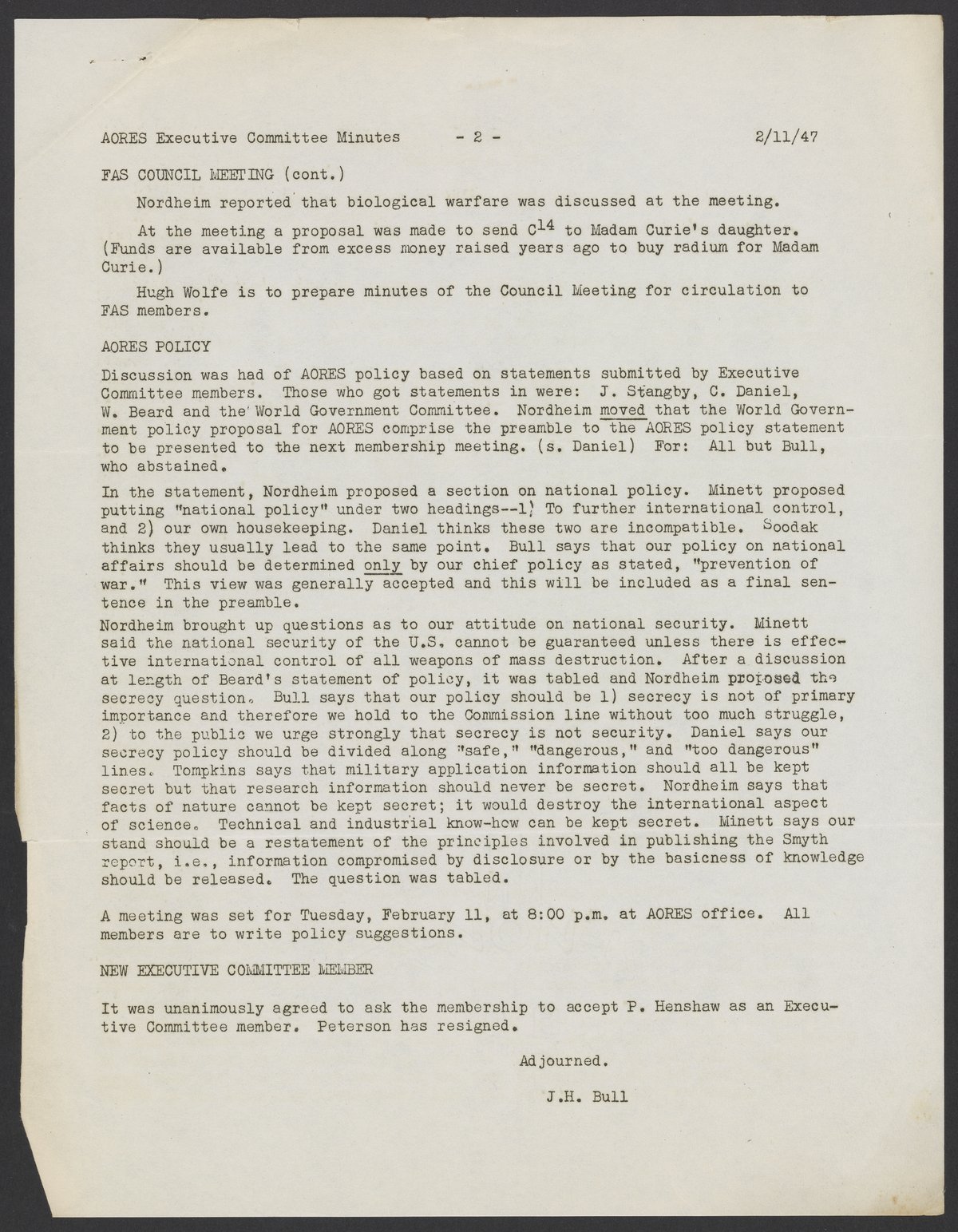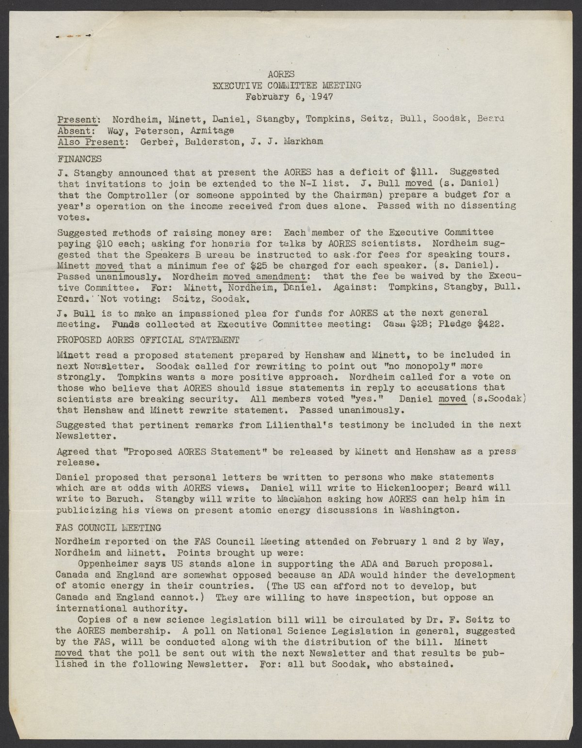 Association of Oak Ridge Engineers and Scientists (AORES) meeting minutes, February 6, 1947