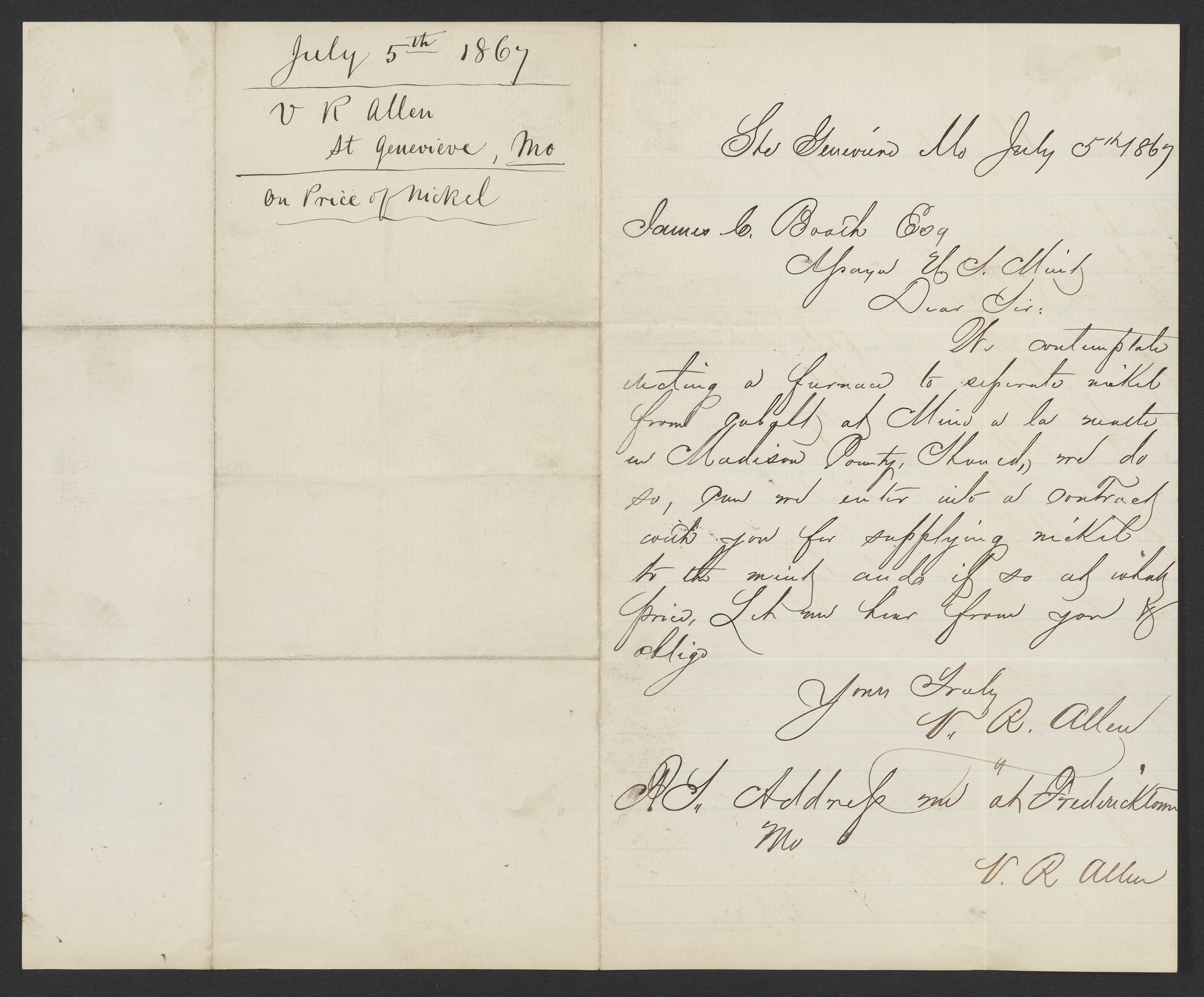 Letter to James Curtis Booth (1810-1888) from V. R. Allen regarding the price of Nickel.