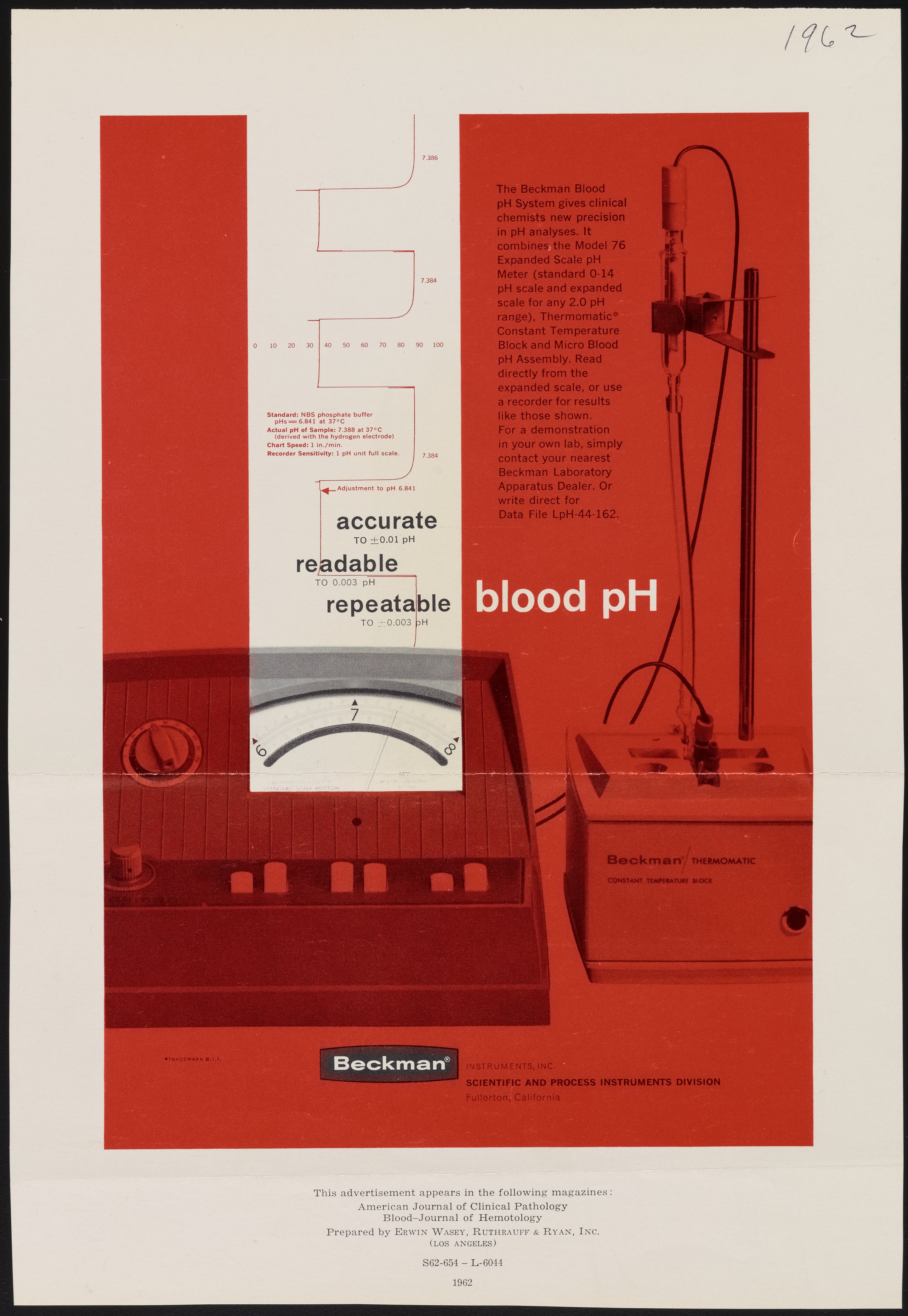 Beckman Instruments, Inc. “Accurate, Readable, Repeatable Blood PH,” 1962. Beckman Historical Collection, Box 49, Folder 20. Science History Institute. Philadelphia. https://digital.sciencehistory.org/works/1v53jw97x.