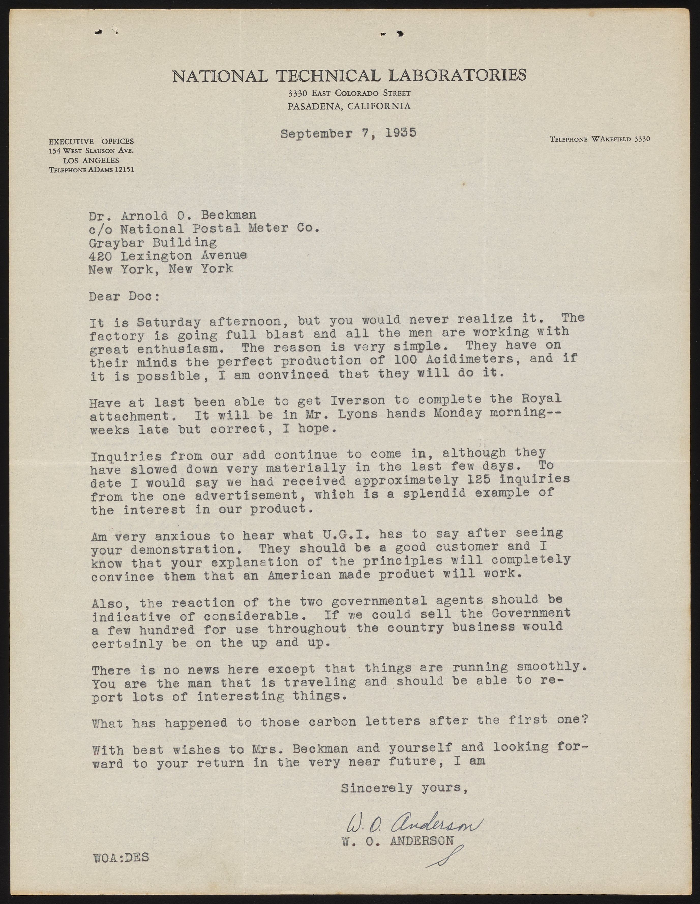 Anderson writes from National Technical Labatories to Arnold Beckman, providing him with an update about "acidimeter" production and pre-sales interest while Beckman is away in New York City. He notes that the first advertisement placed for the new pH meter has resulted in approximately 125 inquiries from potential customers and is optimistic about government purchases. The U.G.I. referred to in this letter is most likely the United Gas Improvement Company of Philadelphia.