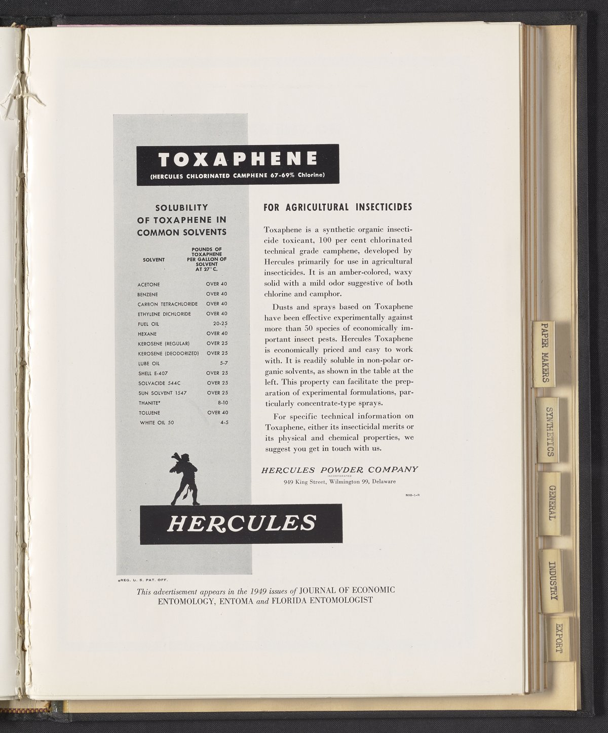 Hercules Incorporated. “Toxaphene for Agricultural Insecticides.” 1949 Hercules Advertisements, 1949. Records of Hercules Incorporated, Volume 1949. Science History Institute. Philadelphia. https://digital.sciencehistory.org/works/1v53jx77n.