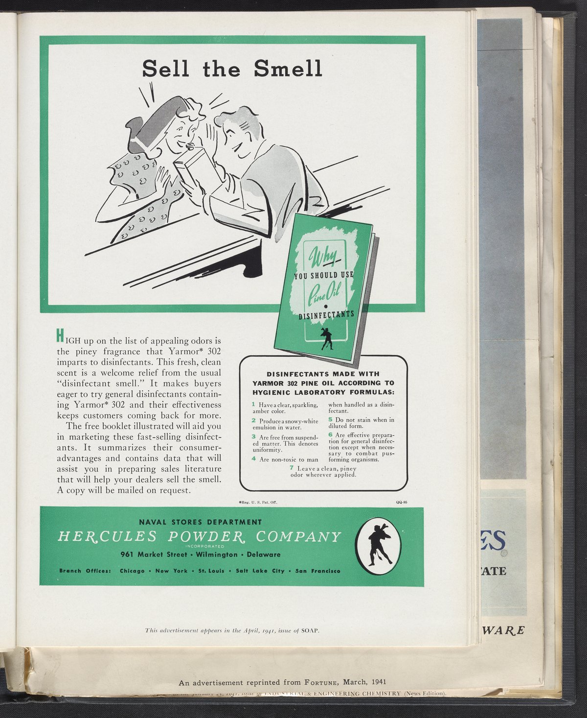 Hercules Incorporated. “Sell the Smell.” 1941 Hercules Advertisements, 1941. Records of Hercules Incorporated, Volume 1941. Science History Institute. Philadelphia. https://digital.sciencehistory.org/works/1v53jx83s.