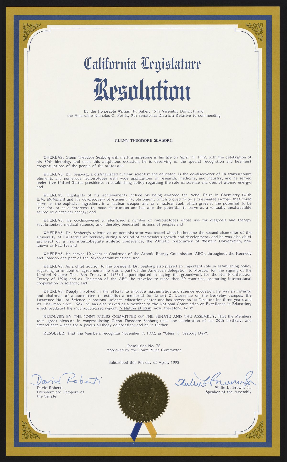 California. Legislature. “Resolution of the California Legislature Honoring Glenn Seaborg,” November 9, 1992. Records of the Lawrence Berkeley National Laboratory - Nuclear Division. Science History Institute. Philadelphia. https://digital.sciencehistory.org/works/1z40ks87x.