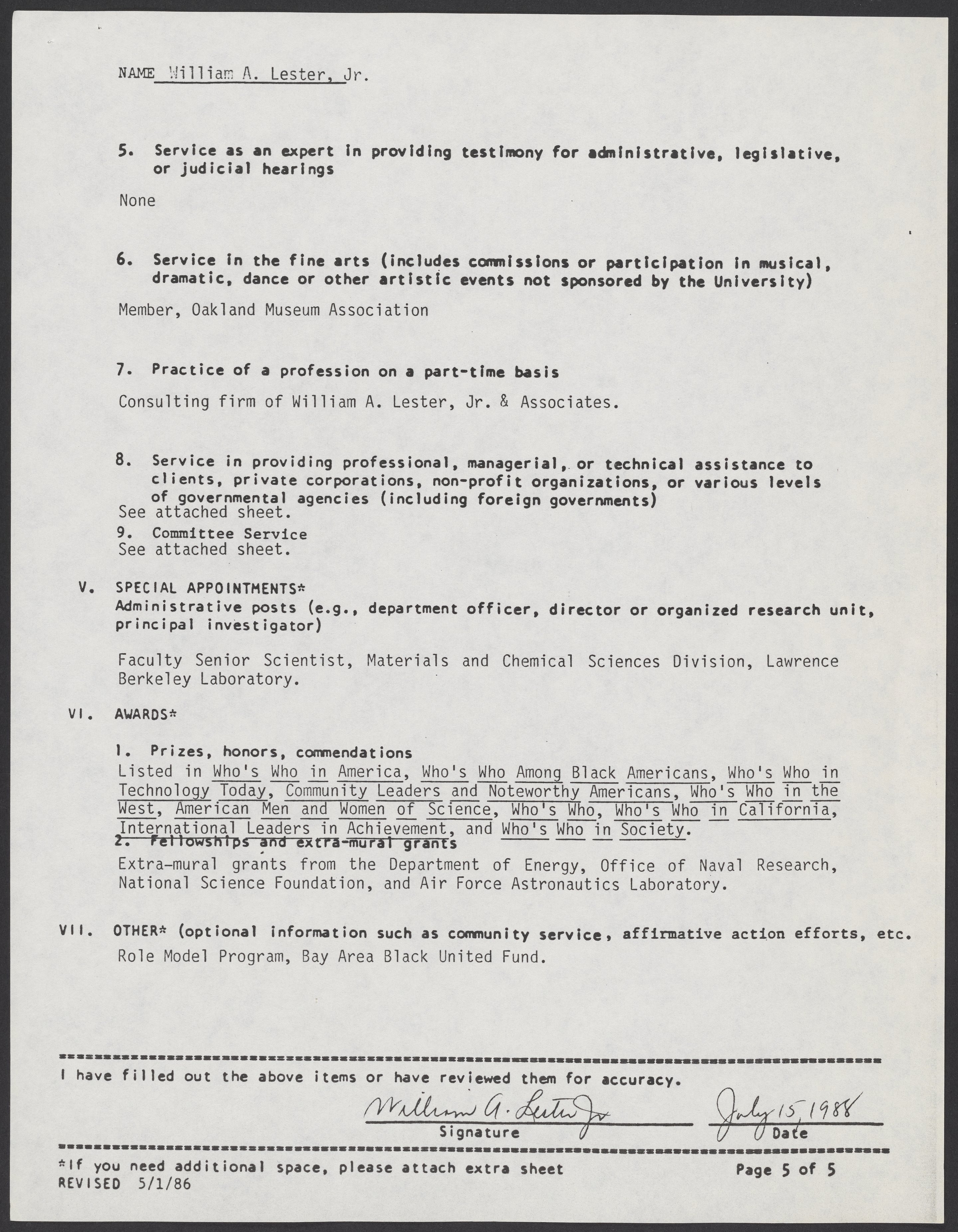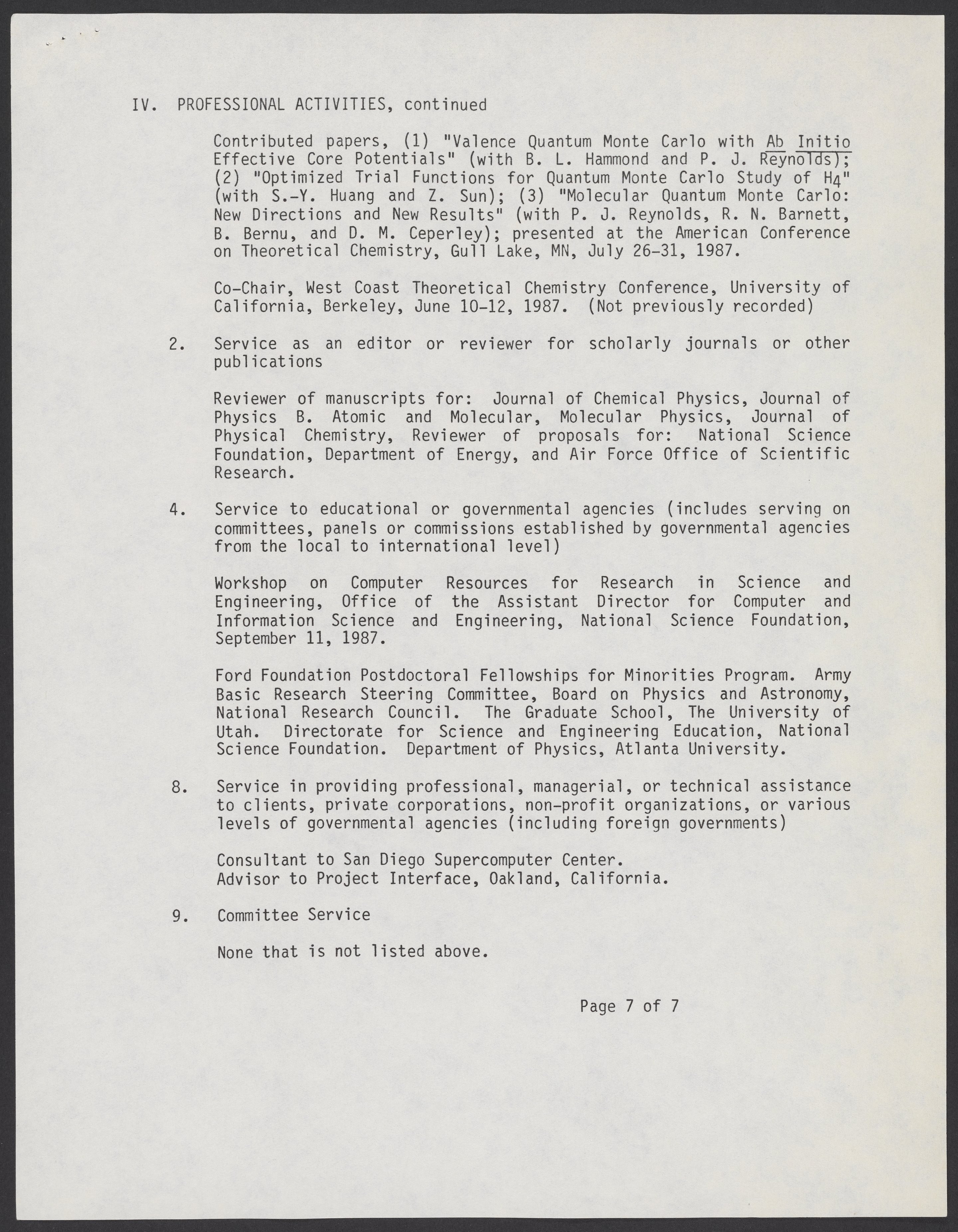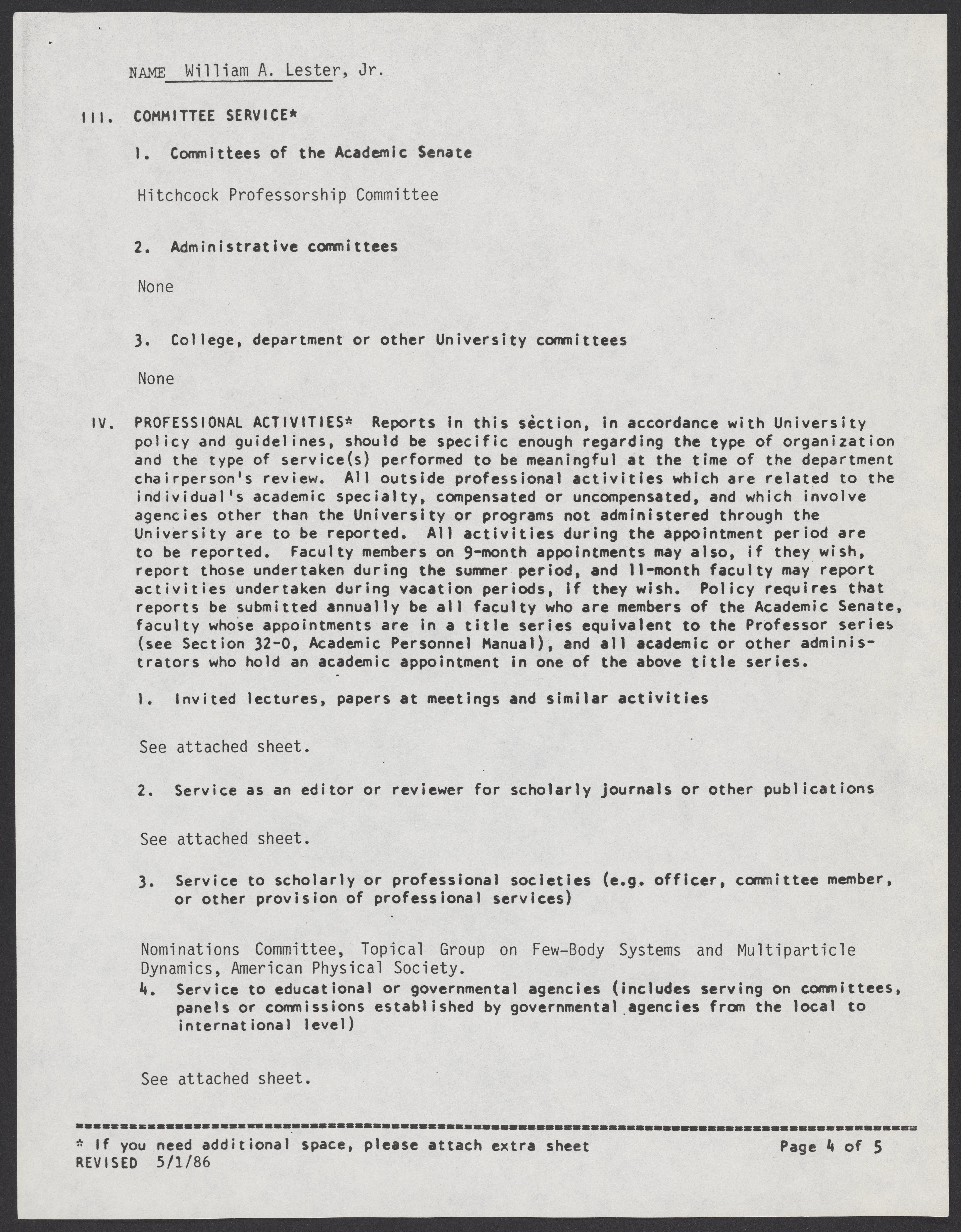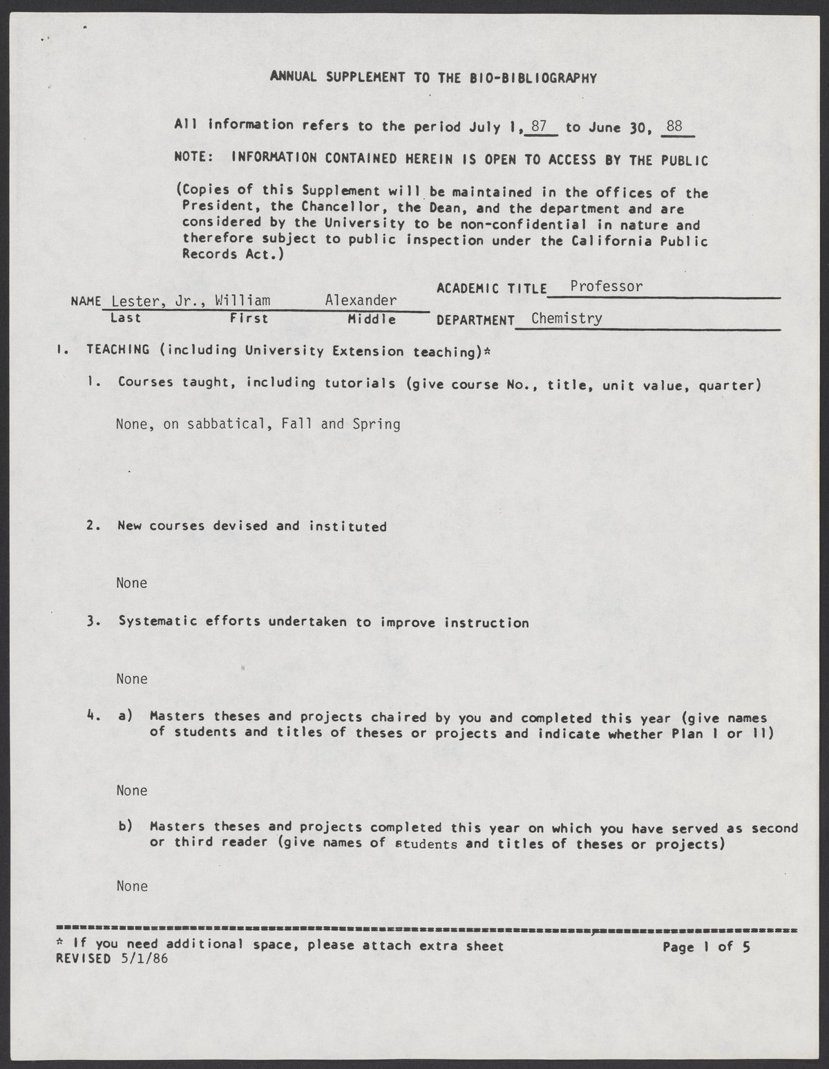 William A. Lester, Jr.'s bio-bibliography supplement form, 1988