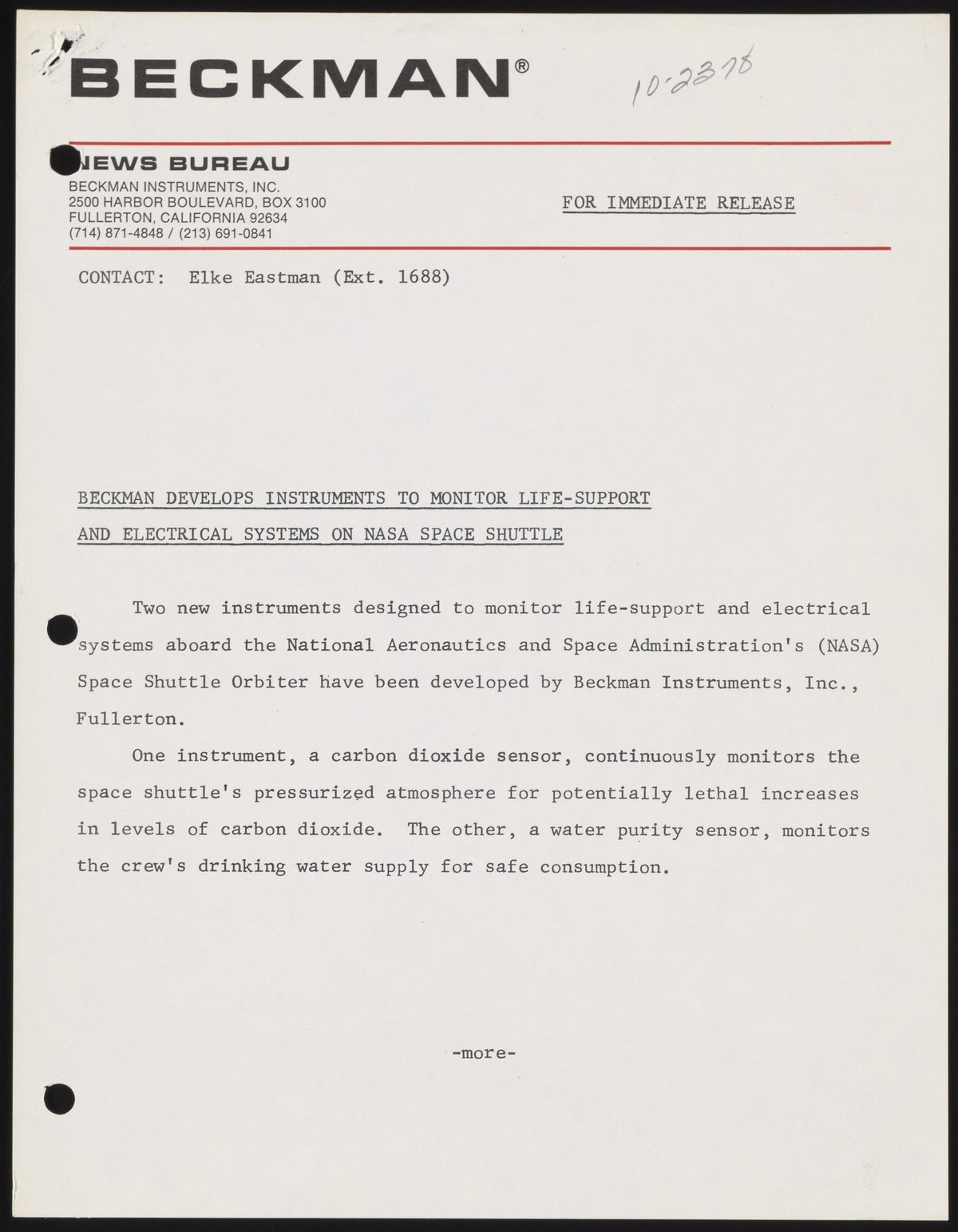 Eastman, Elke. “Beckman Develops Instruments to Monitor Life-Support and Electrical Systems on NASA Space Shuttle,” October 23, 1978. Beckman Historical Collection, Box 58, Folder 67. Science History Institute. Philadelphia. https://digital.sciencehistory.org/works/2227mq16q.