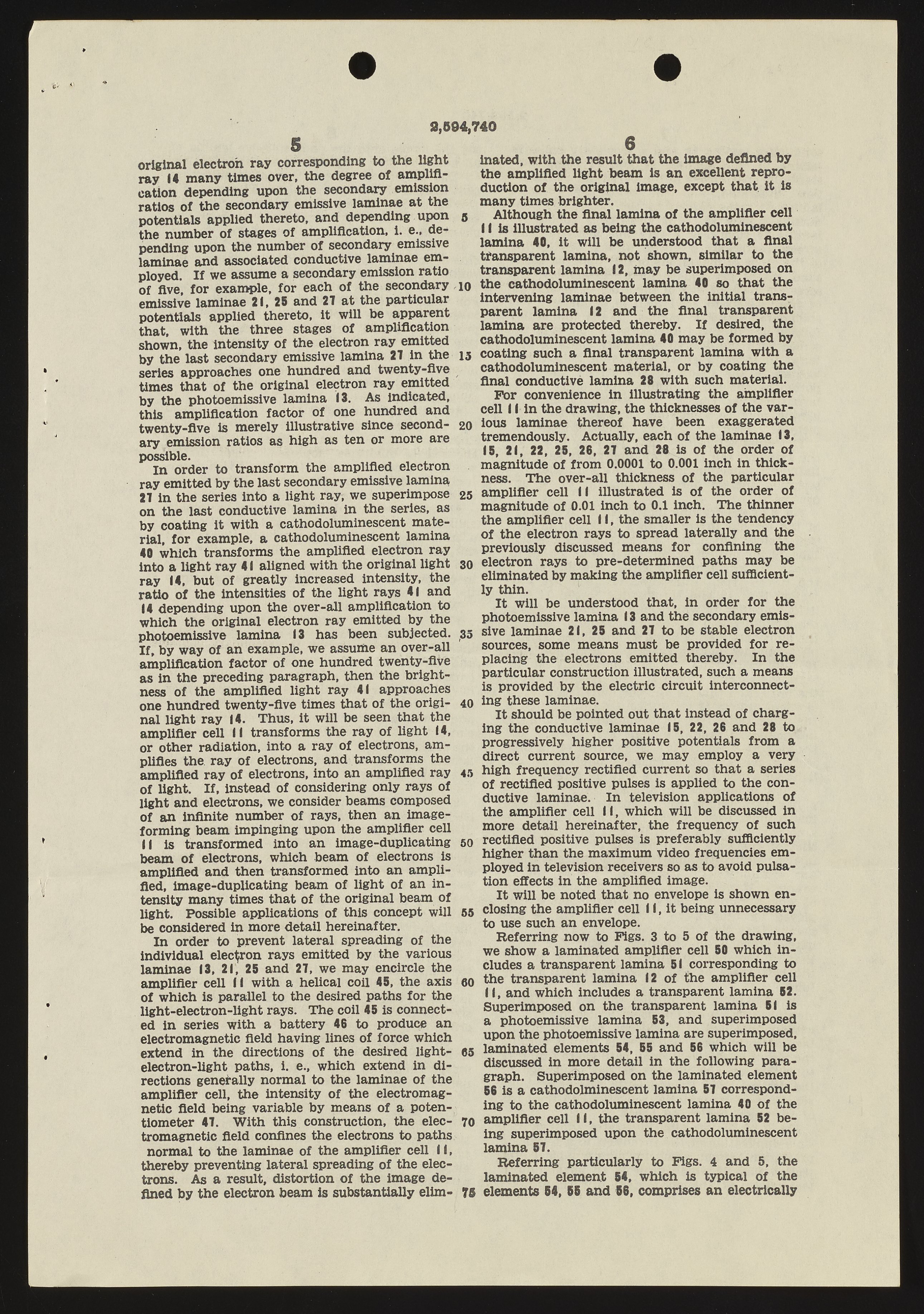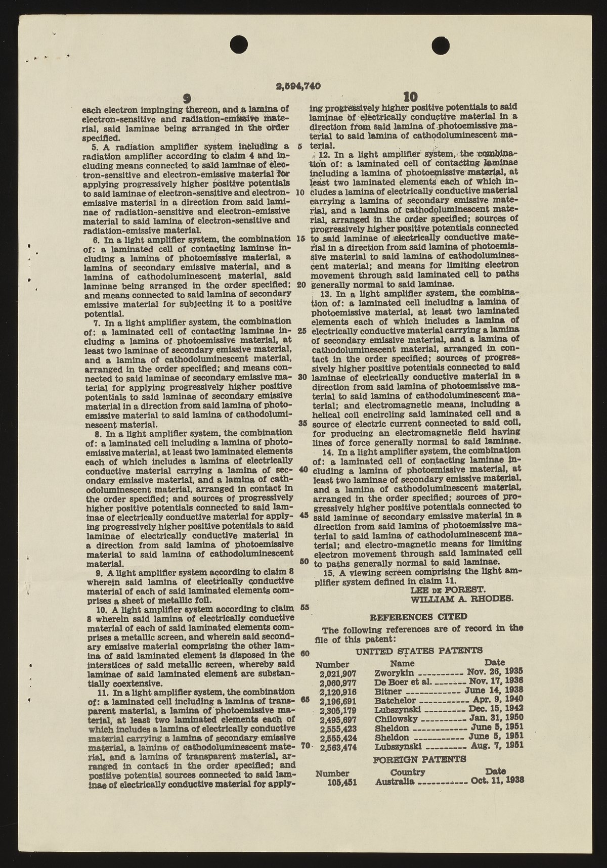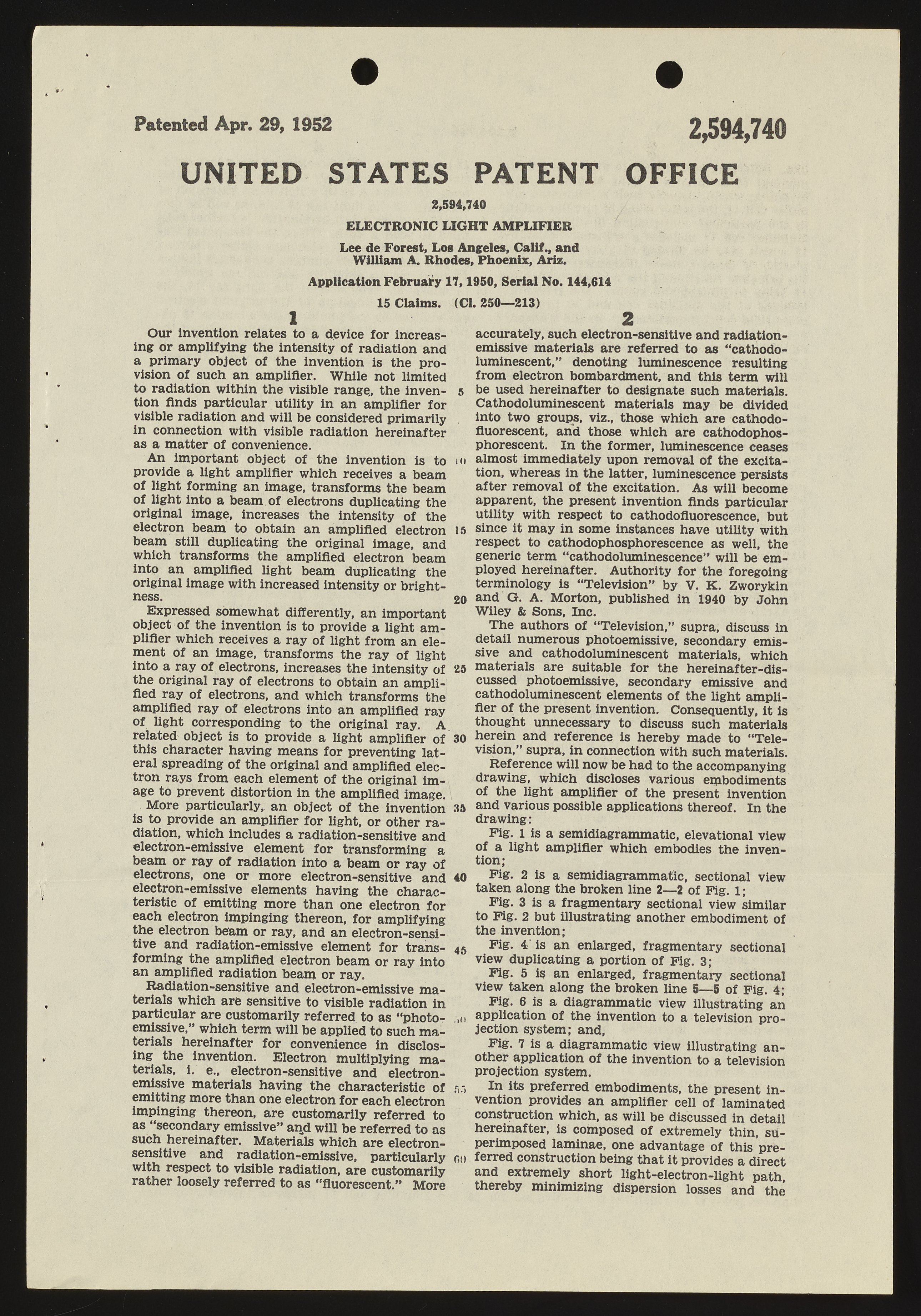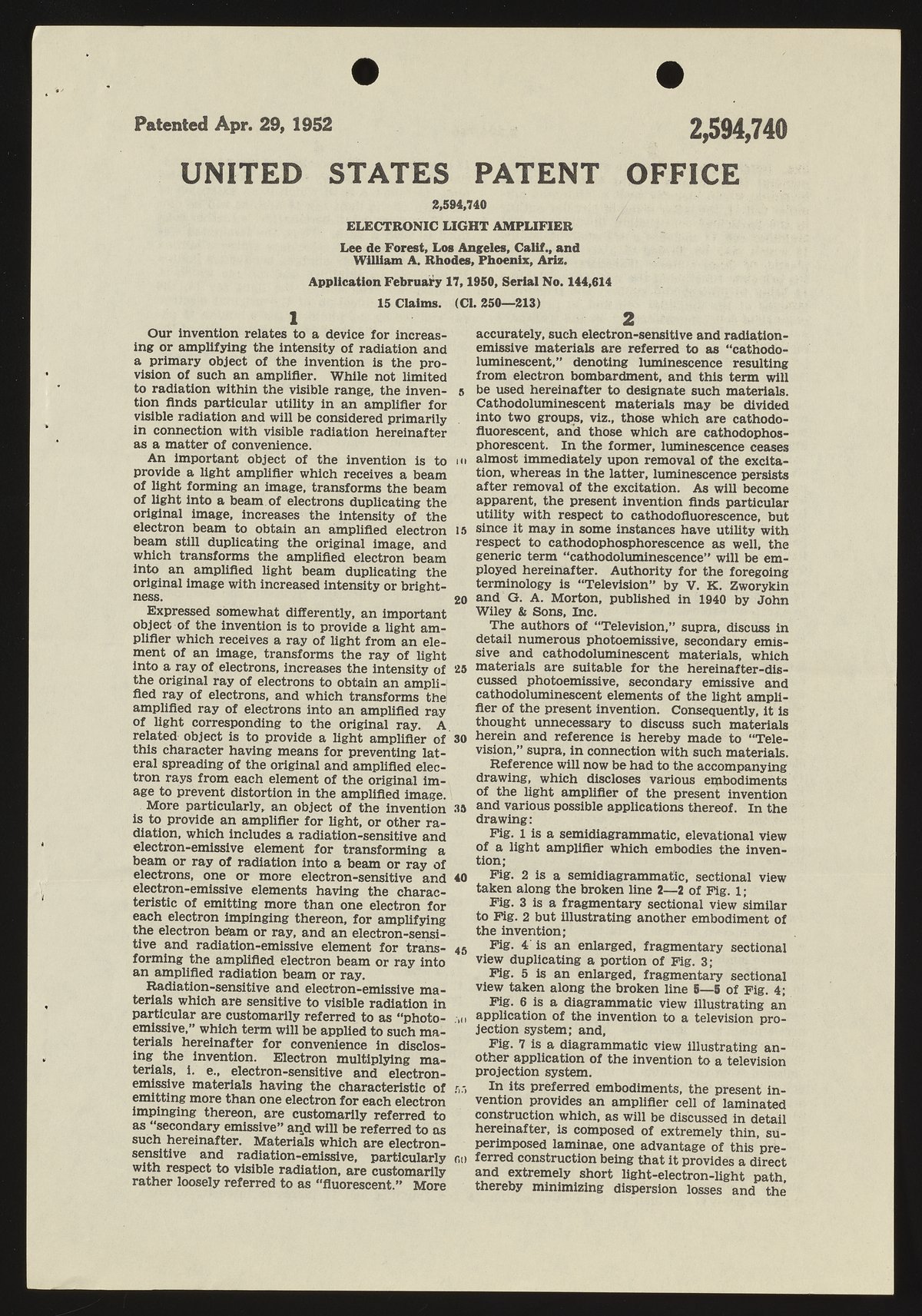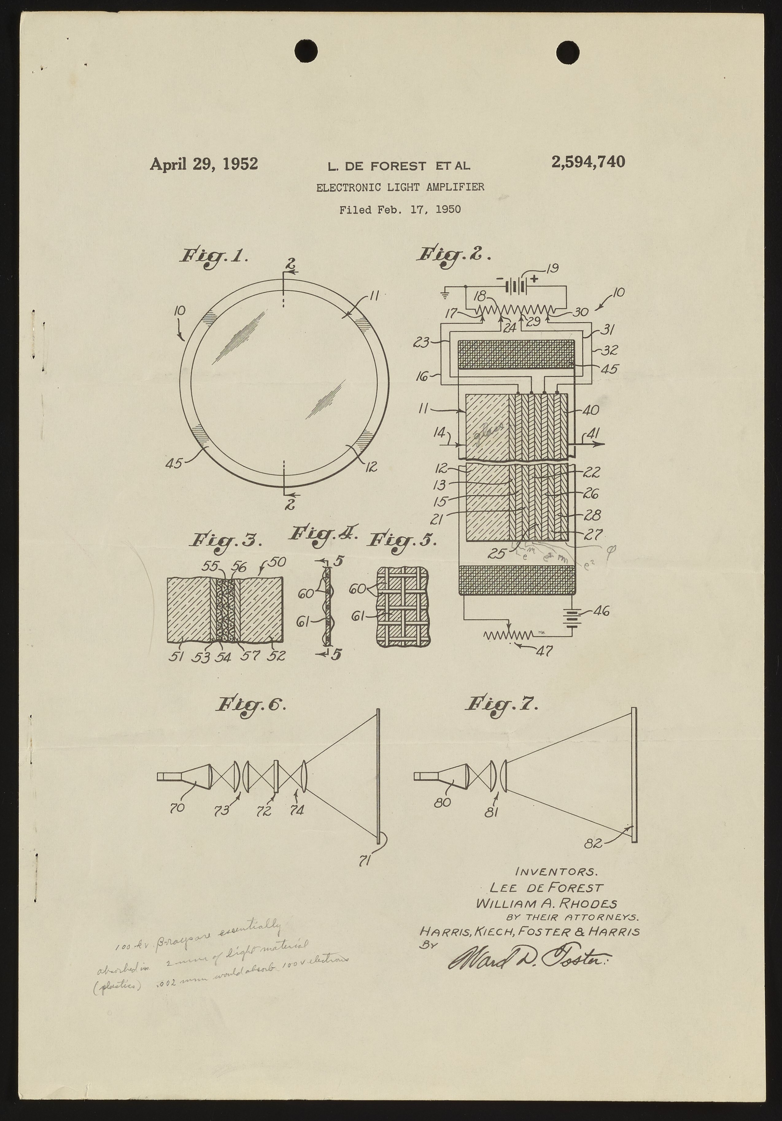 Small JPG1200 x 1720px — 247 KBFull-sized JPG2548 x 3653px — 1003 KBOriginal fileTIFF — 2548 x 3653px — 26.7 MBU.S. Patent 2,594,740, filed on behalf of Lee de Forest and William A. Rhodes, describes a device for amplifying the intensity of radiation.