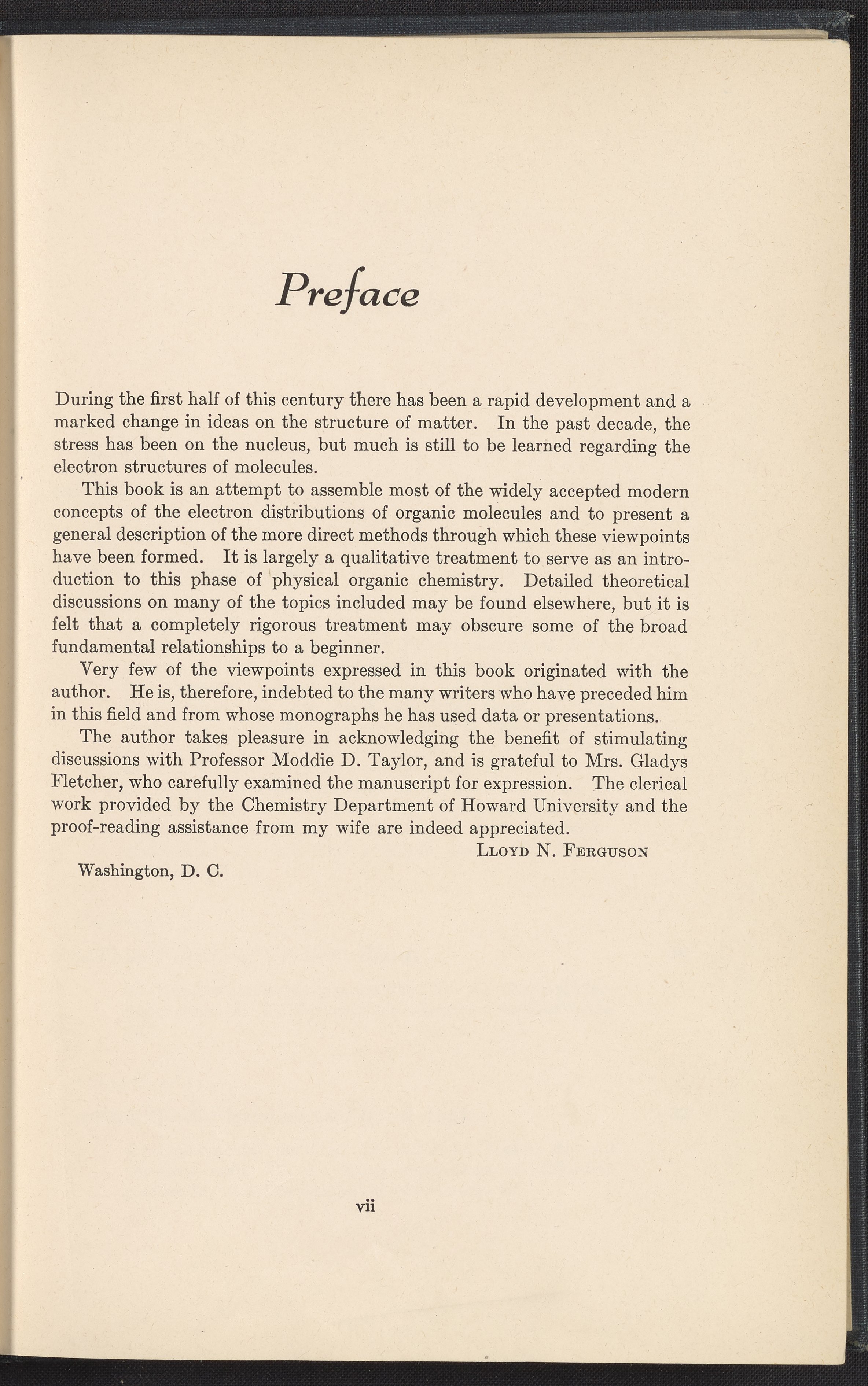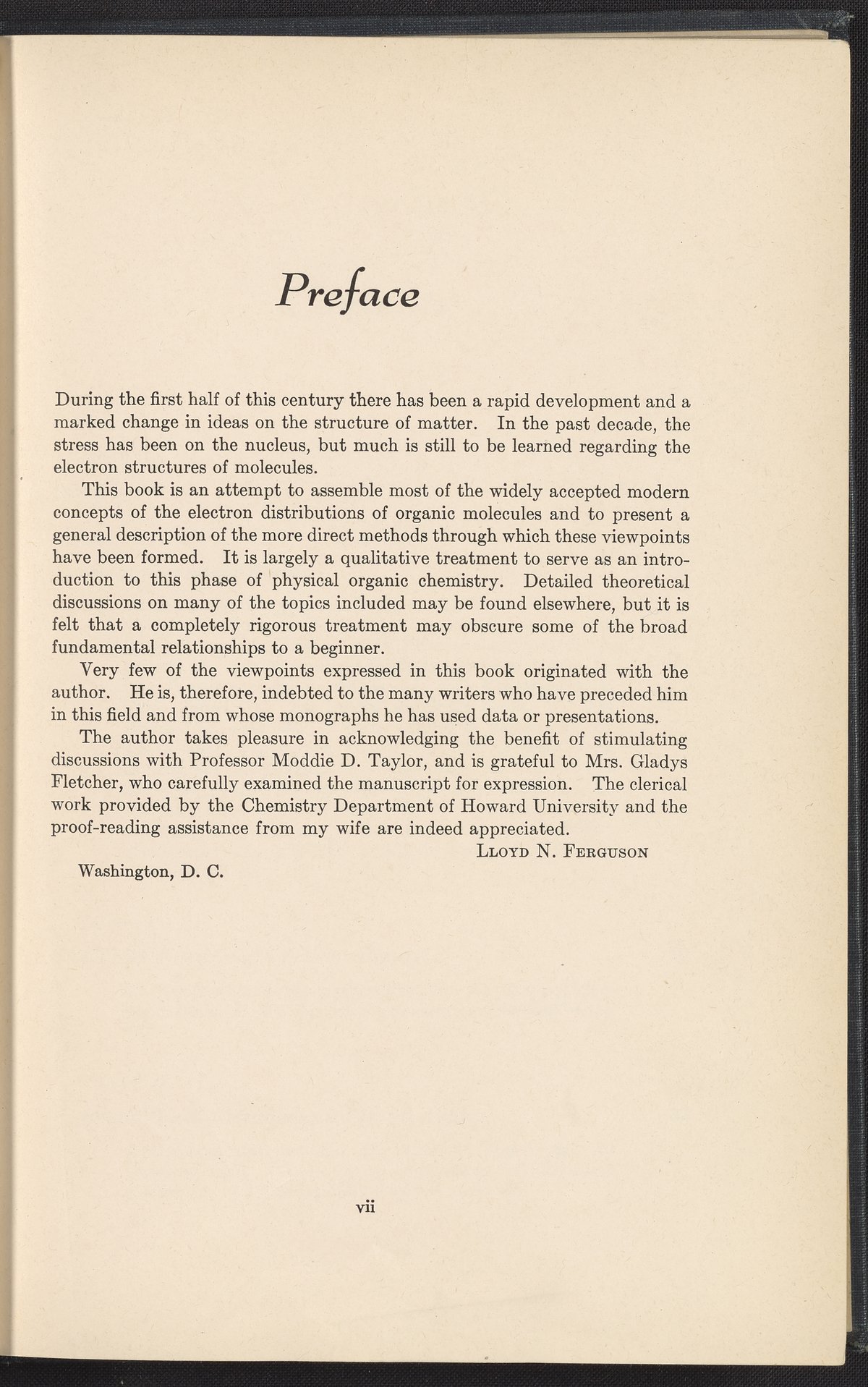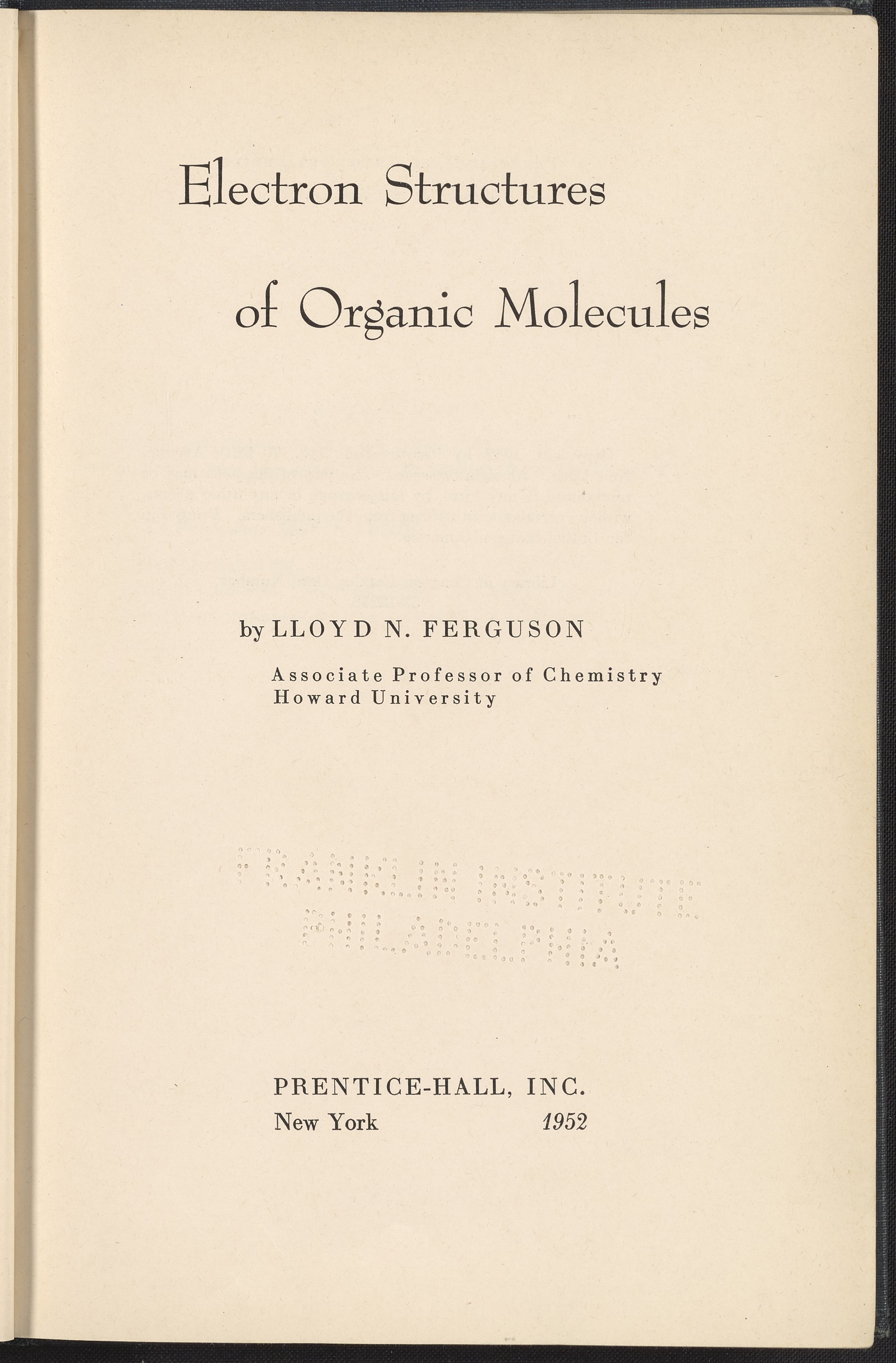 Small JPG1200 x 1706px — 587 KBFull-sized JPG2702 x 3841px — 2.6 MBOriginal fileTIFF — 2702 x 3841px — 29.8 MBWritten by Lloyd N. Ferguson (1918-2011), this work serves as a qualitative introduction to physical organic chemistry and attempts to shift contemporary discourse surrounding molecular structures from a focus on atomic nuclei to a holistic view of the electronic structure of molecules. According to Ferguson's preface, his book is "an attempt to assemble most of the widely accepted modern concepts of the electron distributions of organic molecules and to present a general description of the more direct methods through which these viewpoints have been formed."