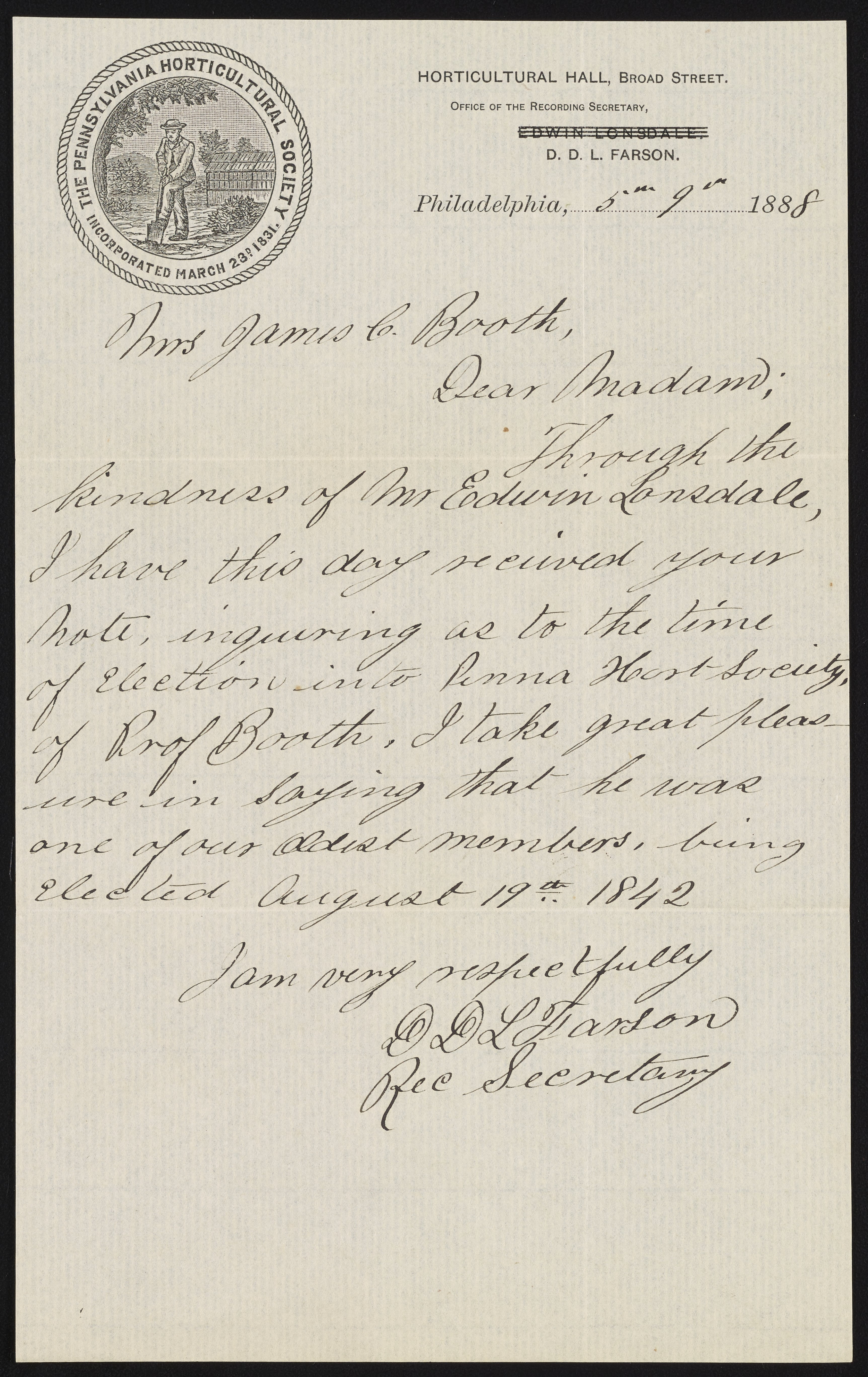 Pennsylvania Horticultural Society Secretary, Daniel D. L. Farson, writes to Margaret M. Booth née Cardeza, with information concerning the date of her husband, James Curtis Booth's (1810-1888), election to the Pennsylvania Horticultural Society.