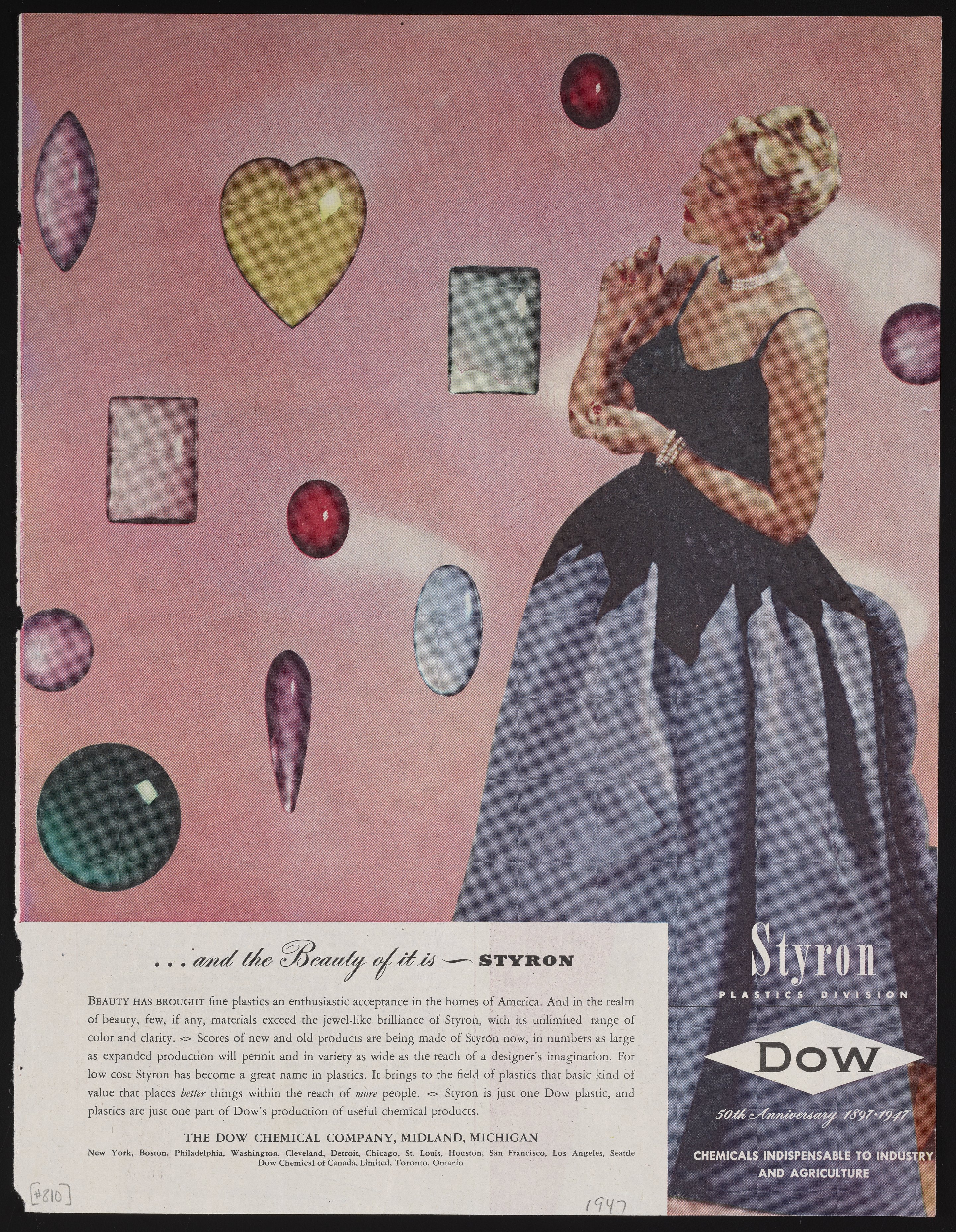 Dow Chemical Company. “...And the Beauty of It Is Styron,” February 8, 1947. Advertisements from the Dow Chemical Historical Collection, Box 9. Science History Institute. Philadelphia. https://digital.sciencehistory.org/works/25u0lg1.