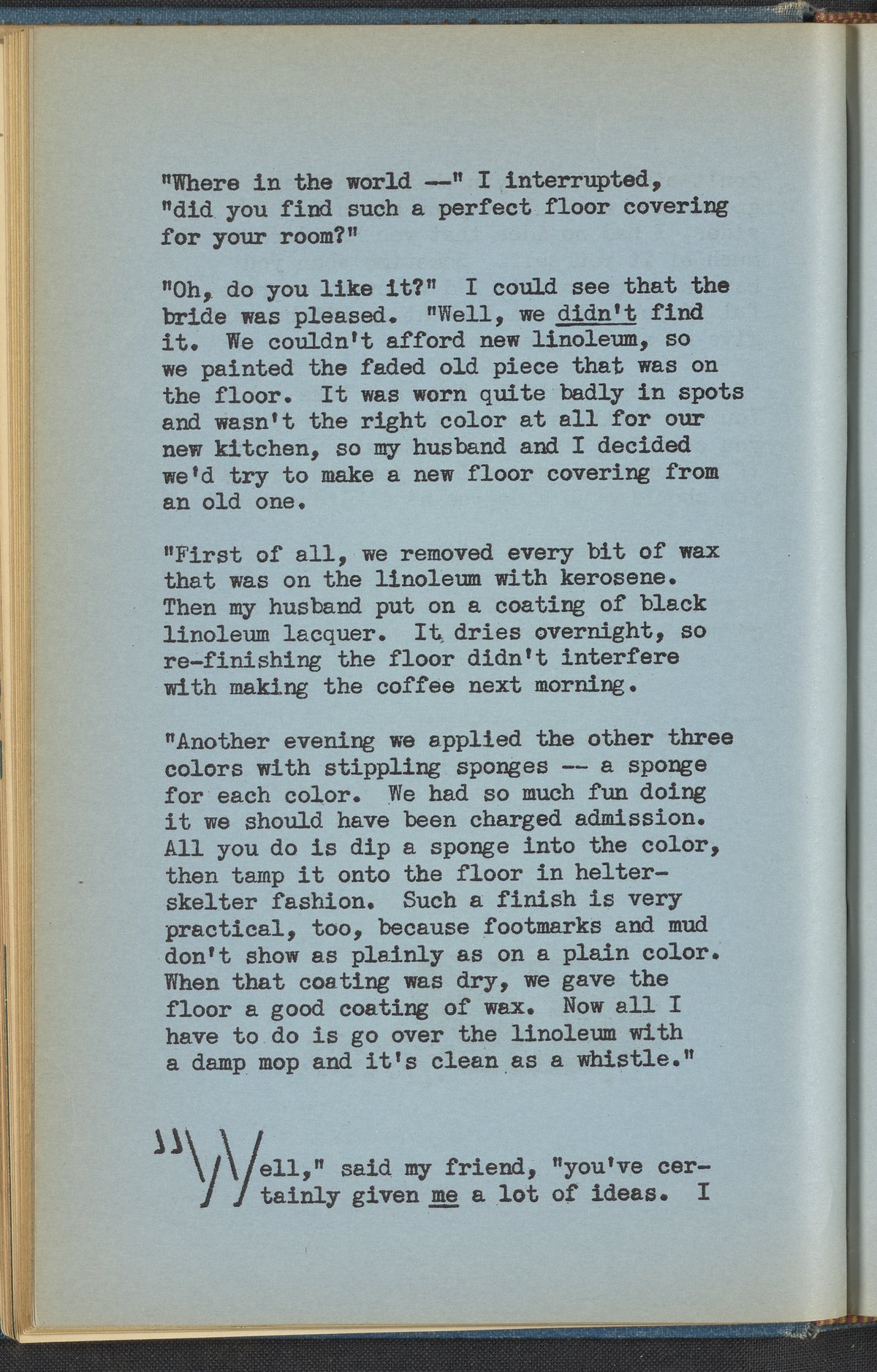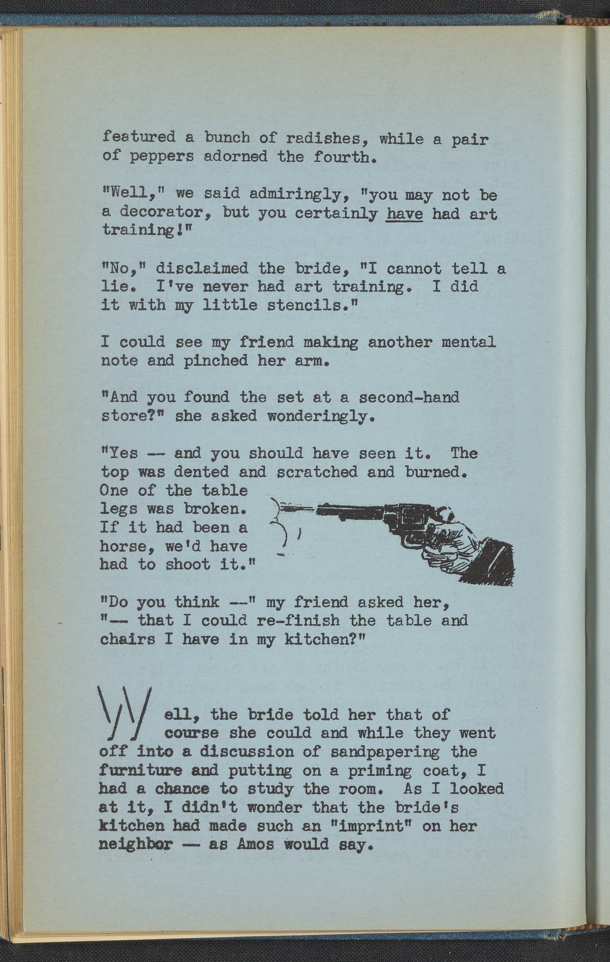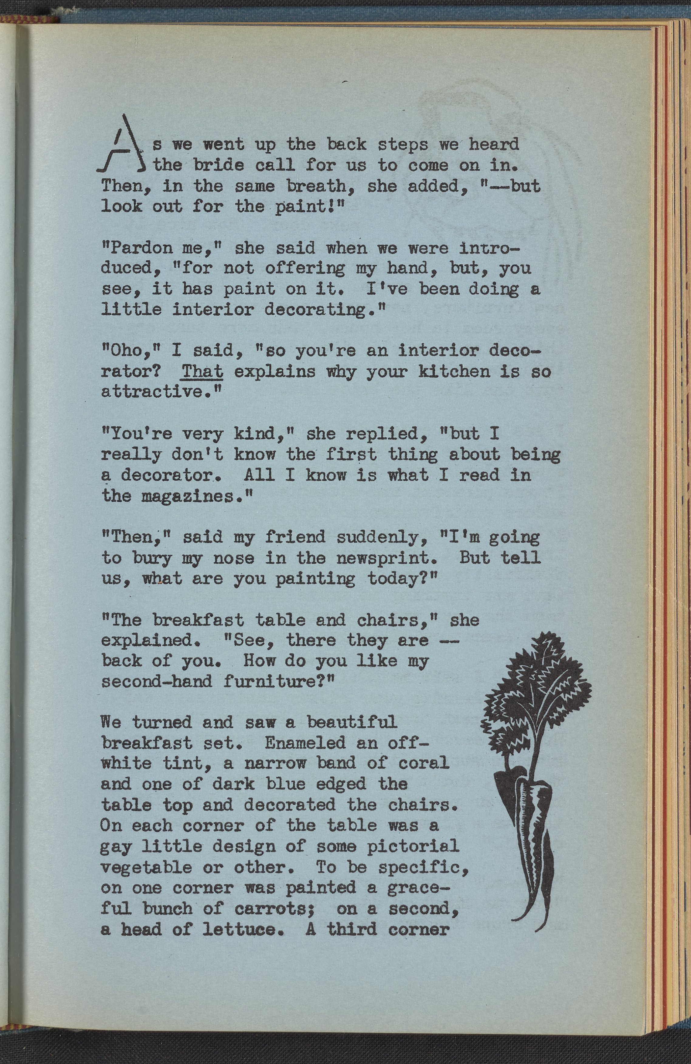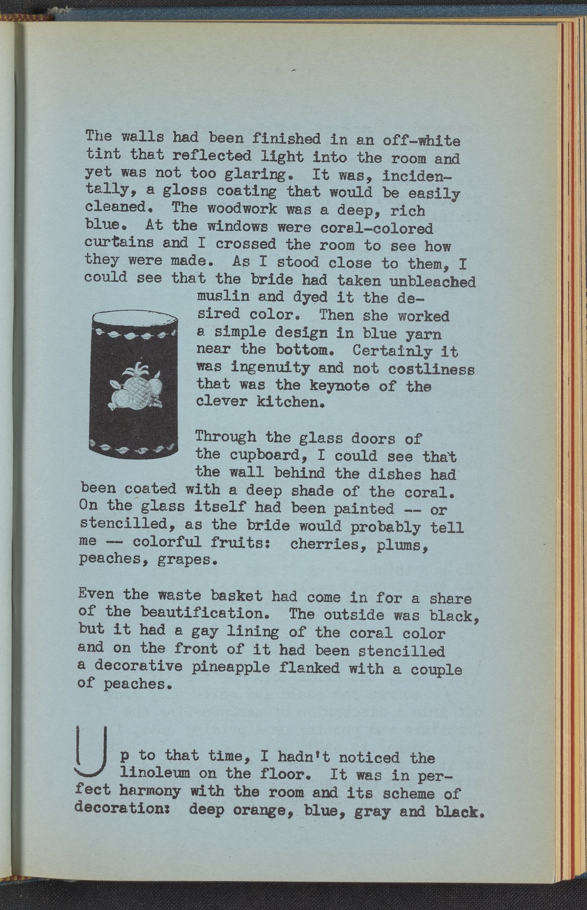 Booklet corresponding to a radio broadcast program created by the National Paint, Varnish, and Lacquer Association. The booklet includes dialogue between two neighbors, a young bride and an older woman. After learning that the young bride has decided to paint her kitchen, the older neighbor is inspired and decides it's time to spruce up her kitchen as well. Includes small stylized illustrations throughout and decorated covers.