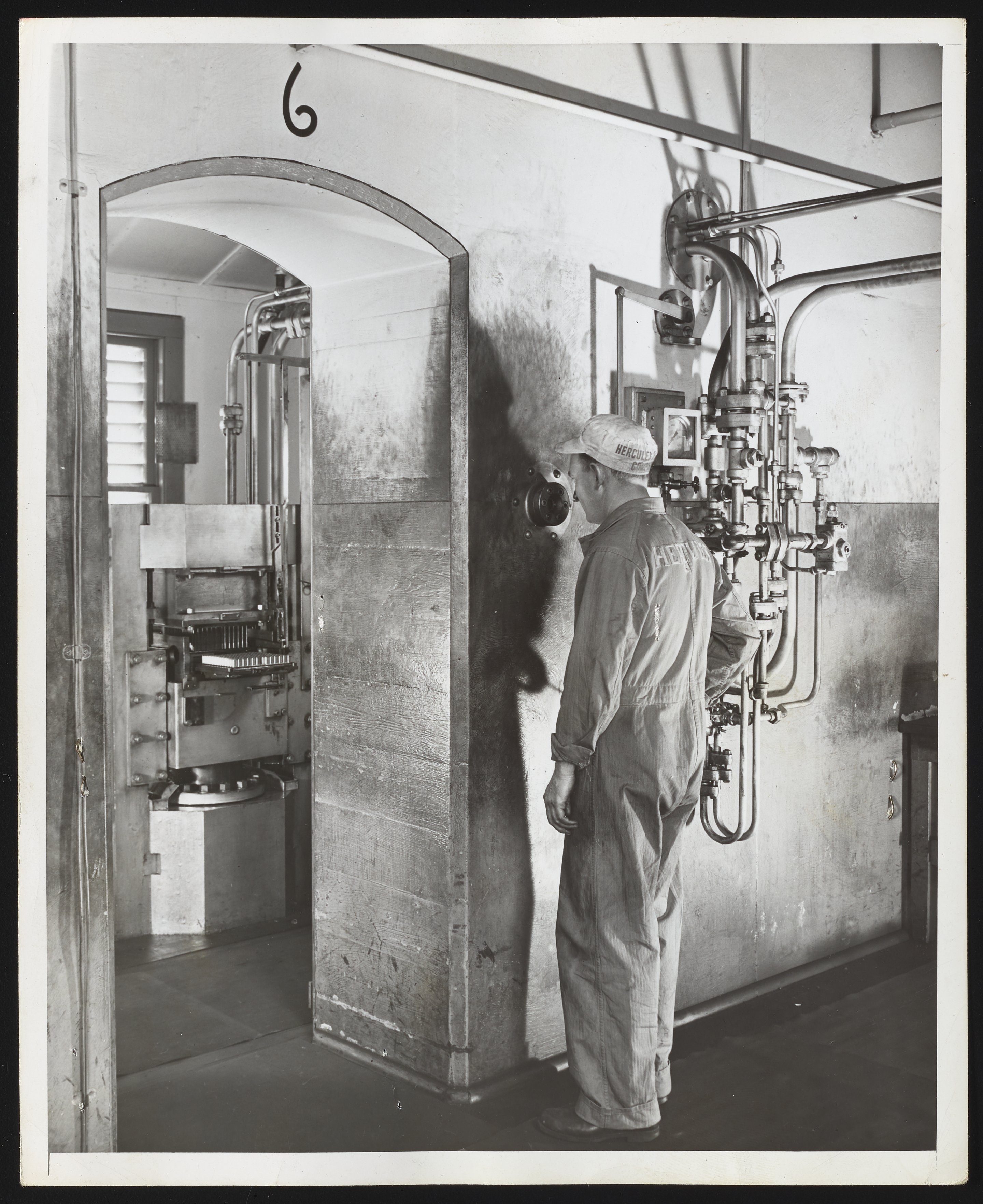 Jim Kennedy operating press machine at Hercules Port Ewen plant