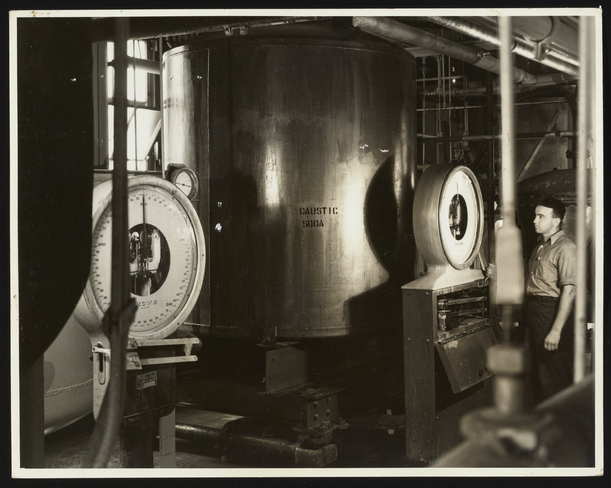 Hercules Incorporated. “Caustic Soda Weigh-Tanks at Hercules Hopewell Plant,” 1940–1949. Photographs from the Records & Ephemera of Hercules Incorporated, Box 1, Folder 35. Science History Institute. Philadelphia. https://digital.sciencehistory.org/works/2801pg98g.