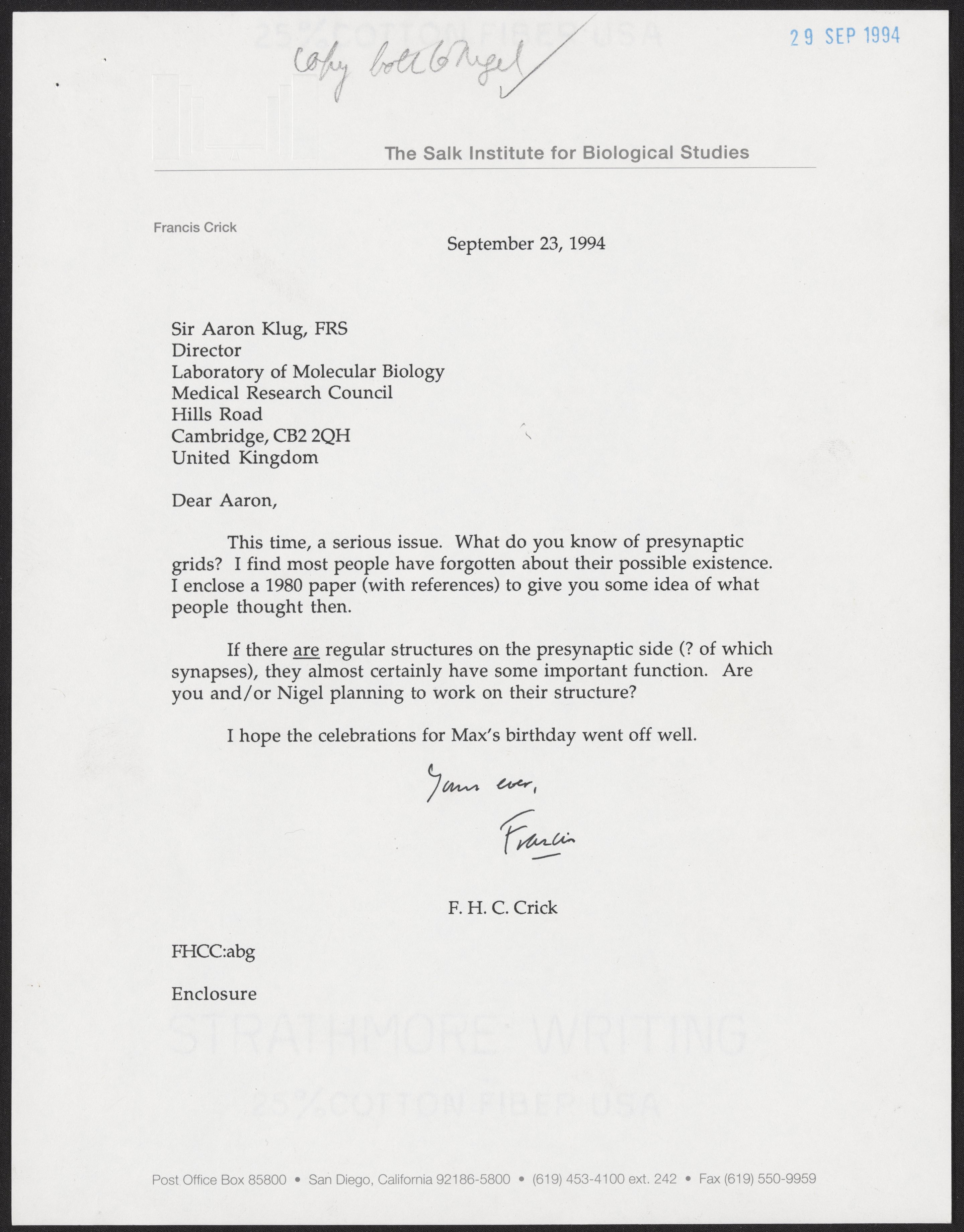 Letter from Francis Crick to Aaron Klug, September 23, 1994