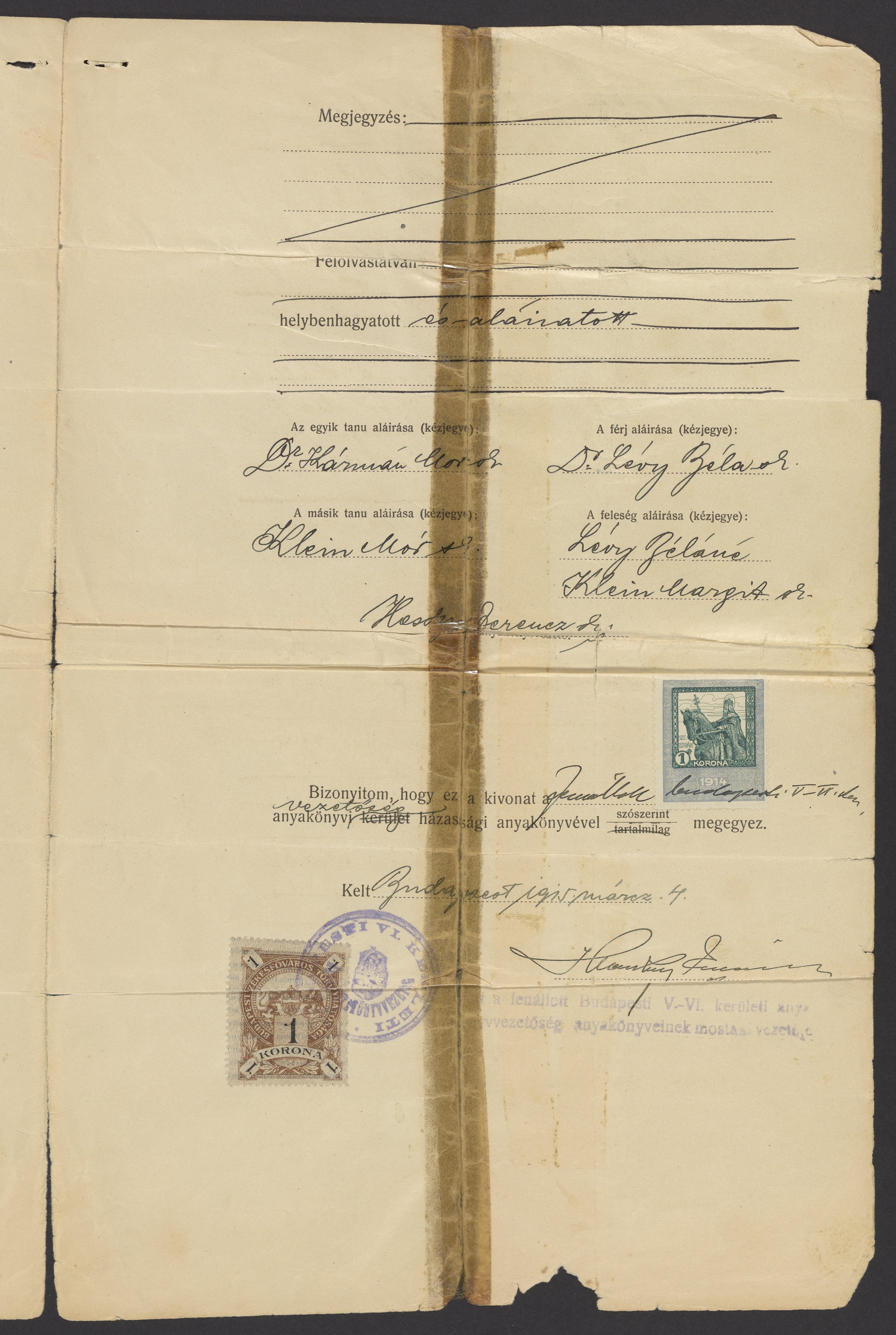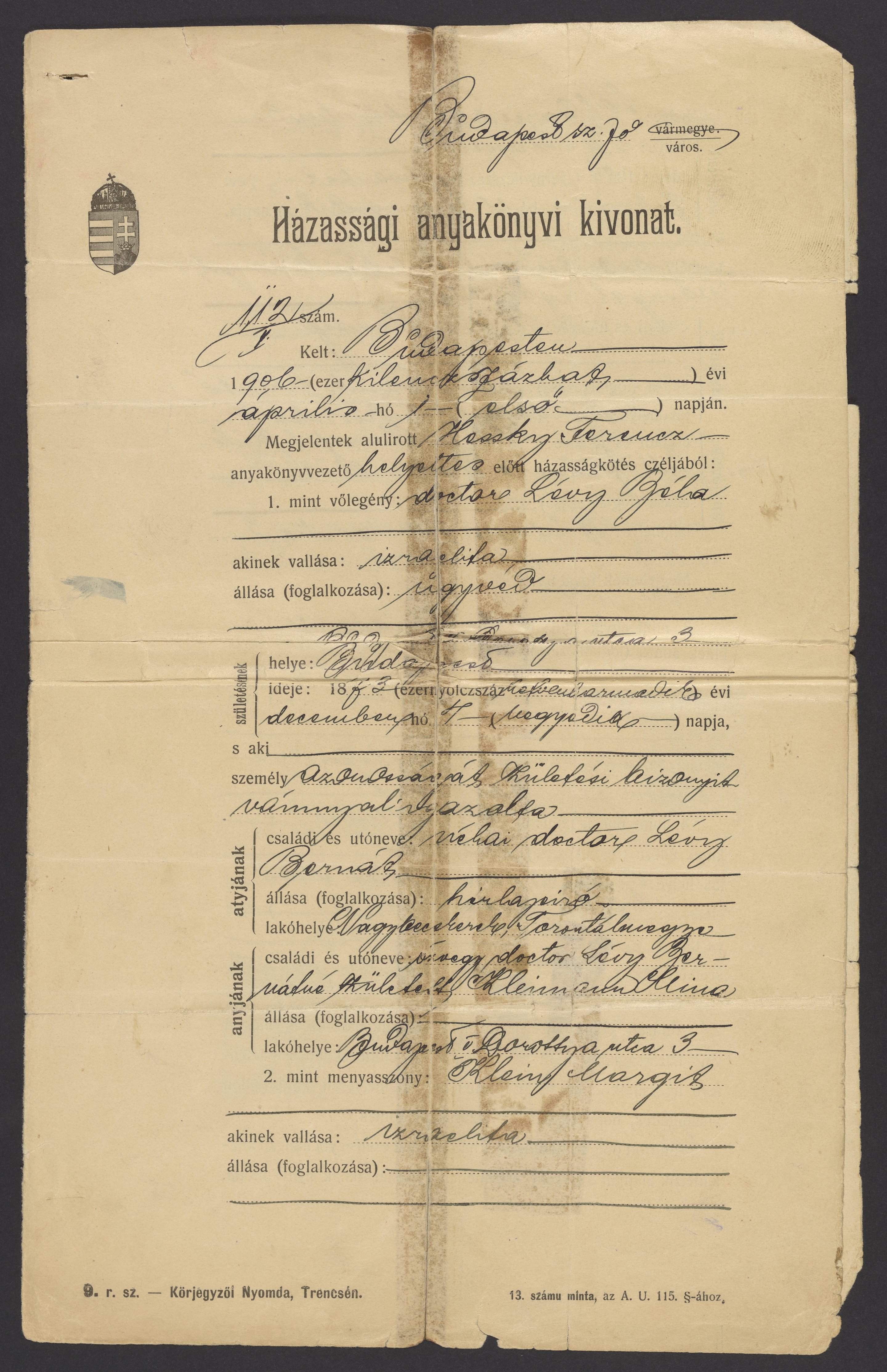 Hungarian marriage certificate of Albert B. Levy and Margit Klein