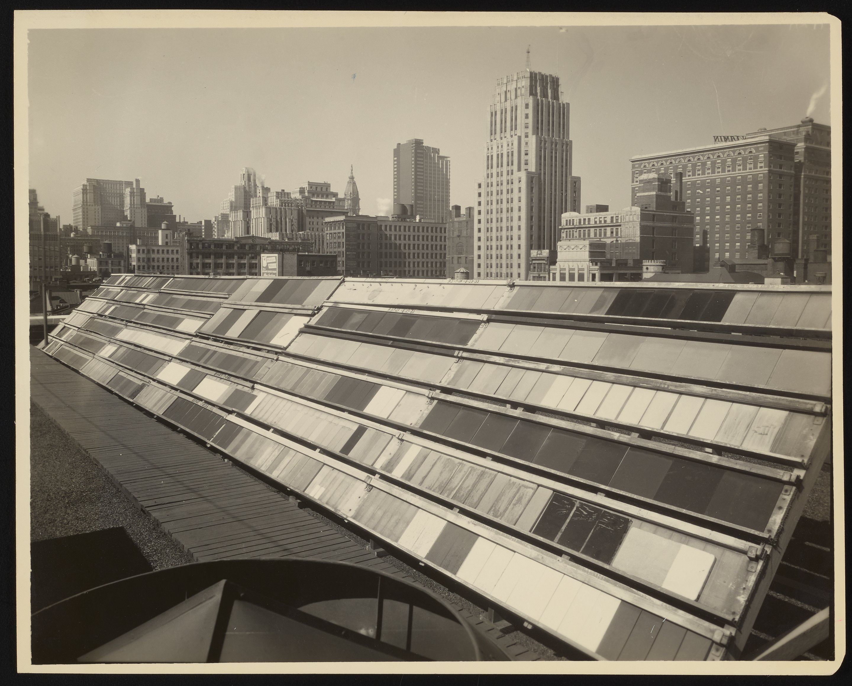 Small JPG1200 x 972px — 196 KBLarge JPG2880 x 2332px — 918 KBFull-sized JPG4197 x 3398px — 1.7 MBOriginal fileTIFF — 4197 x 3398px — 40.9 MBTwo views of exposure racks designed to test the weathering capabilities of varnishes and other products manufactured by the Rohm and Haas Company. The racks are positioned on the roof of the company's home office building located at West Washington Square in Philadelphia.