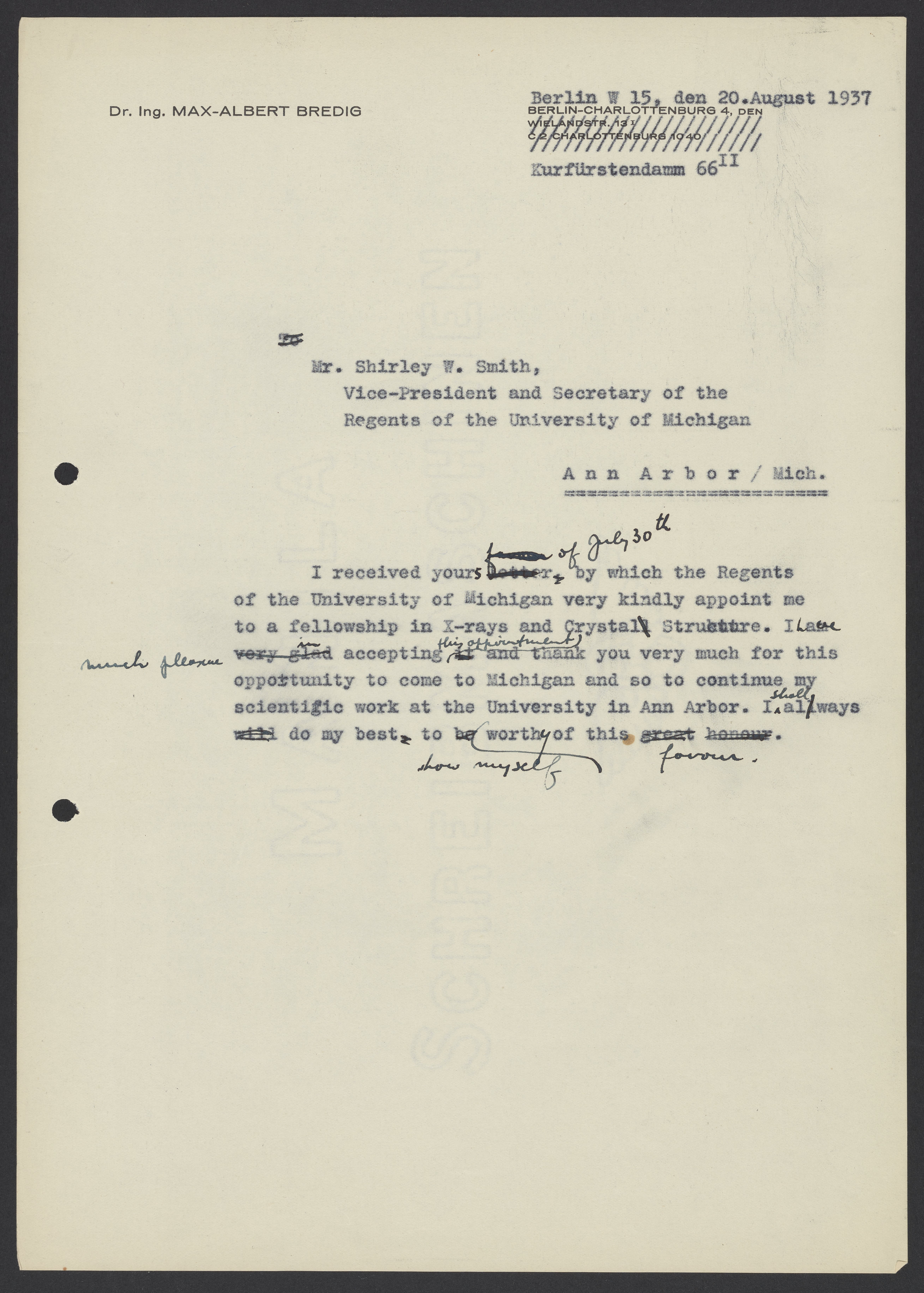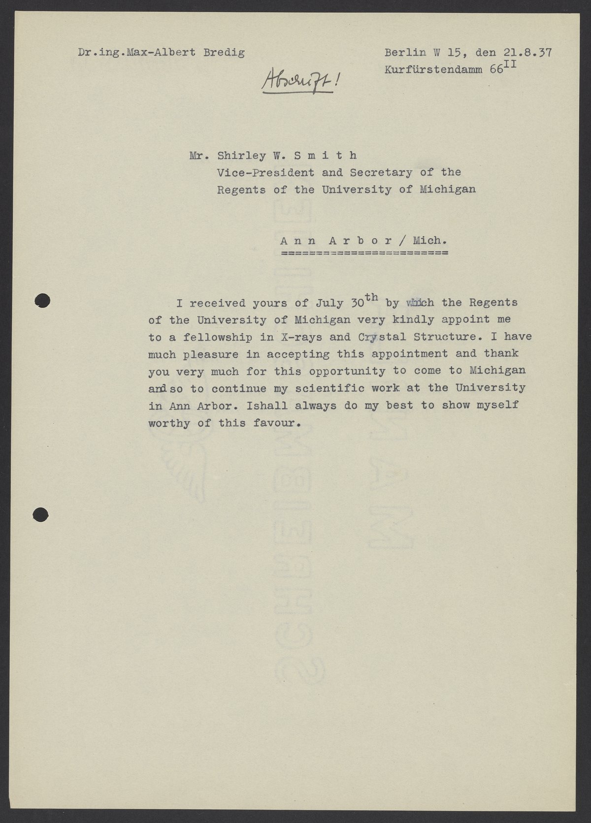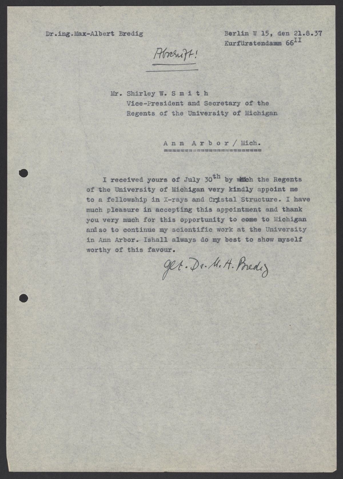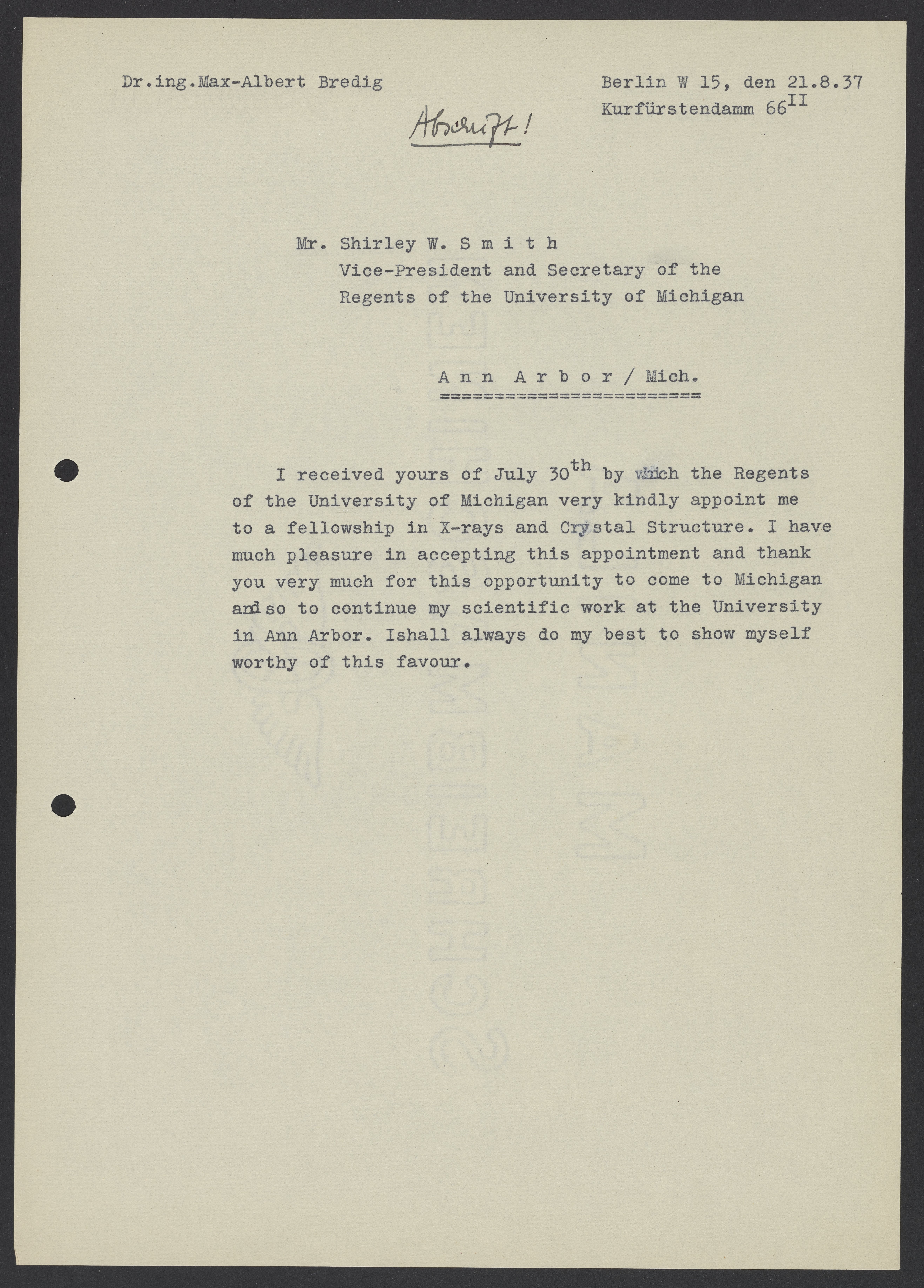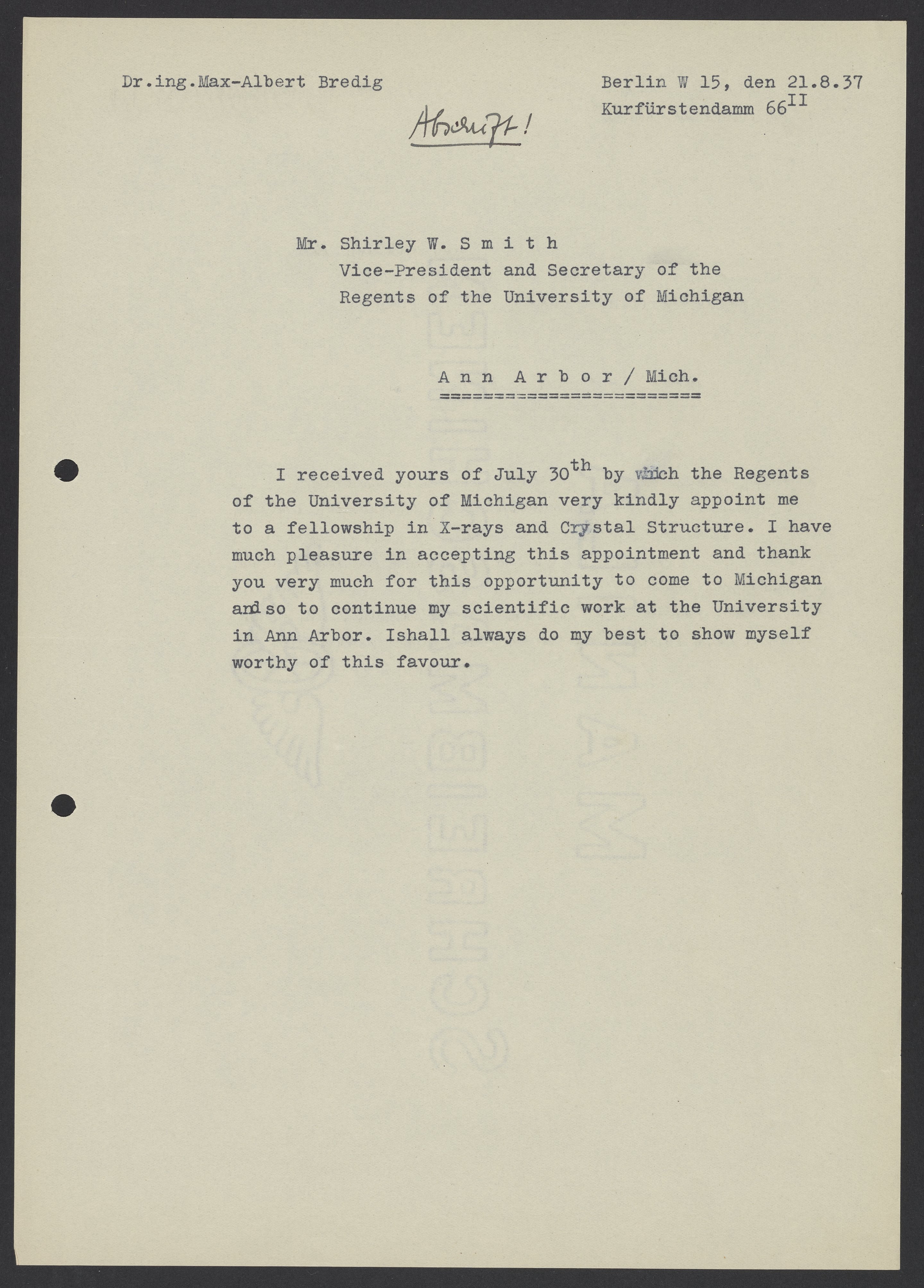 Letter from Max Bredig to Shirley W. Smith, August 21, 1937