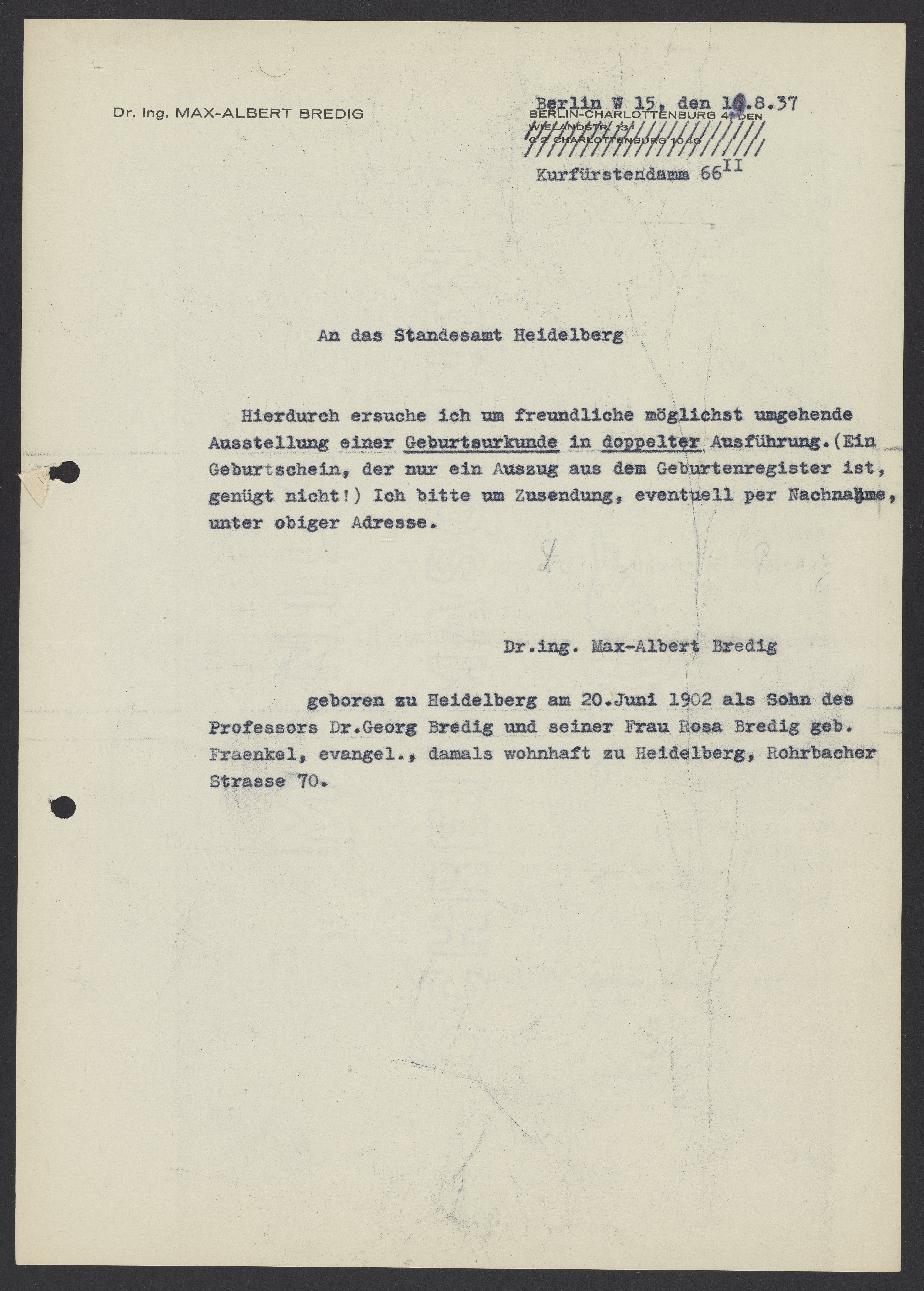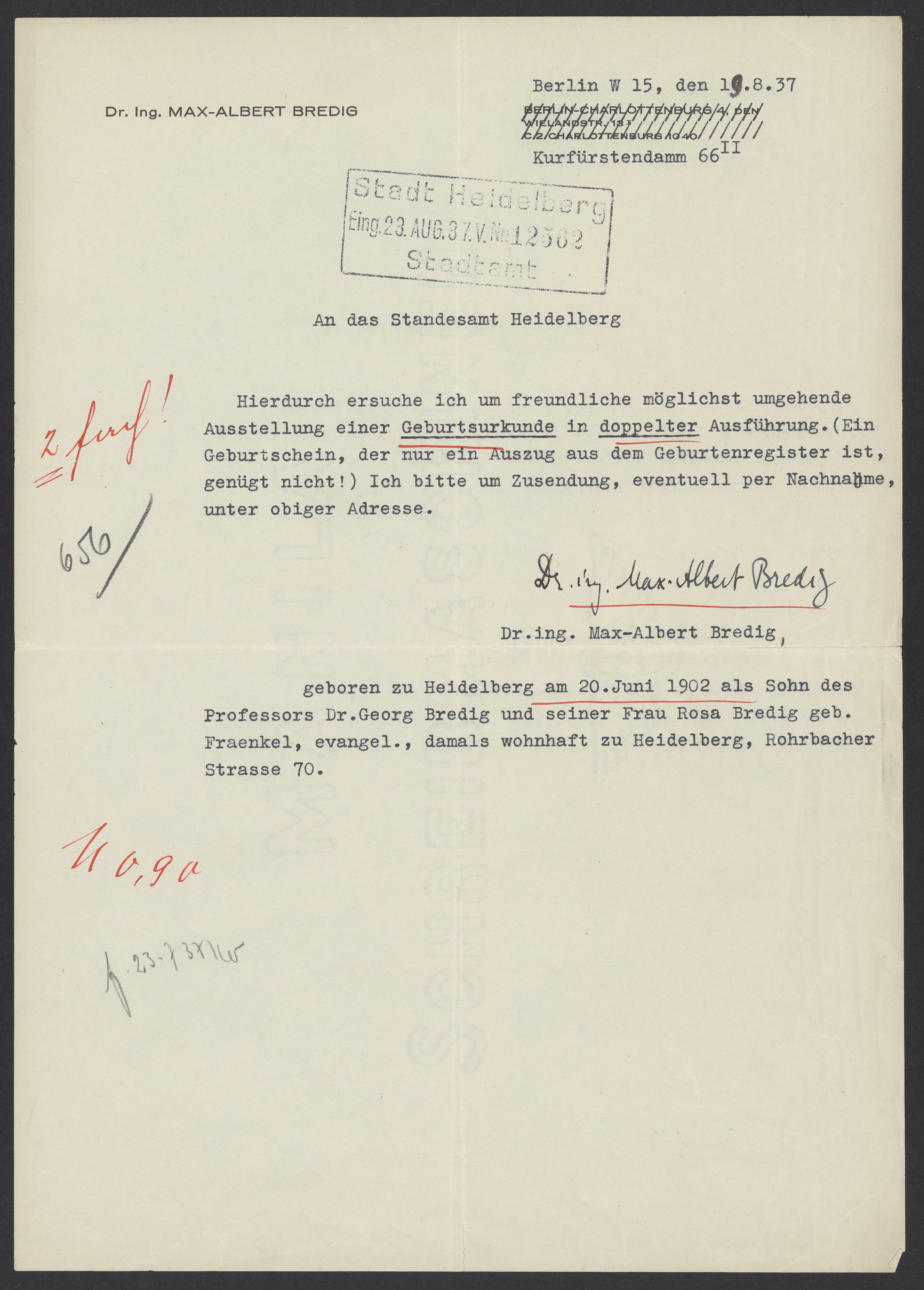 Letter from Max Bredig to the Registry Office of Heidelberg, August 19, 1937