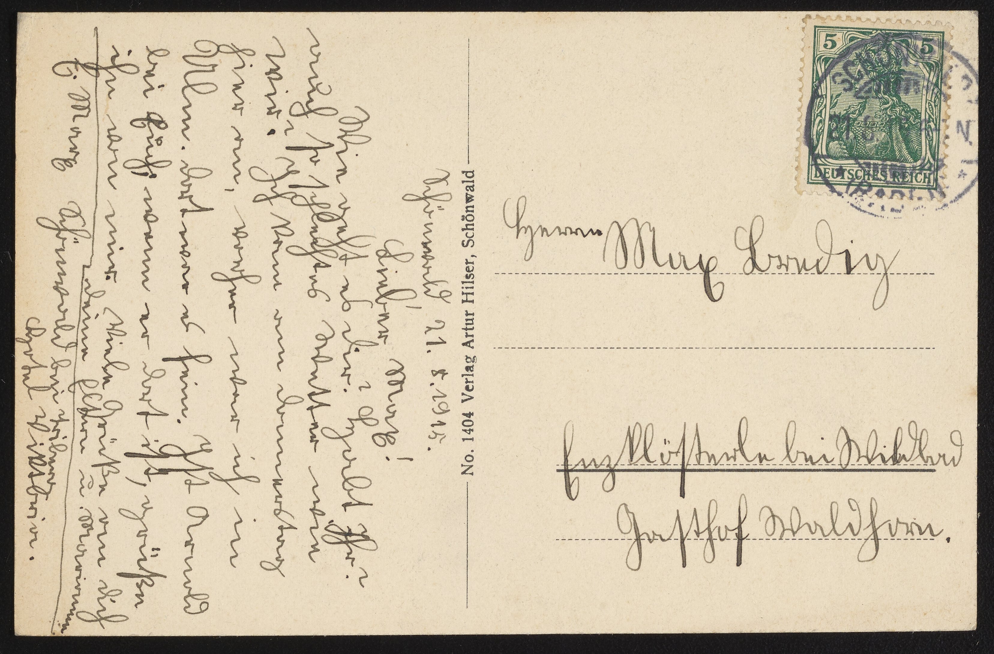 1915 postcard of Schönwald, Germany to Max Bredig