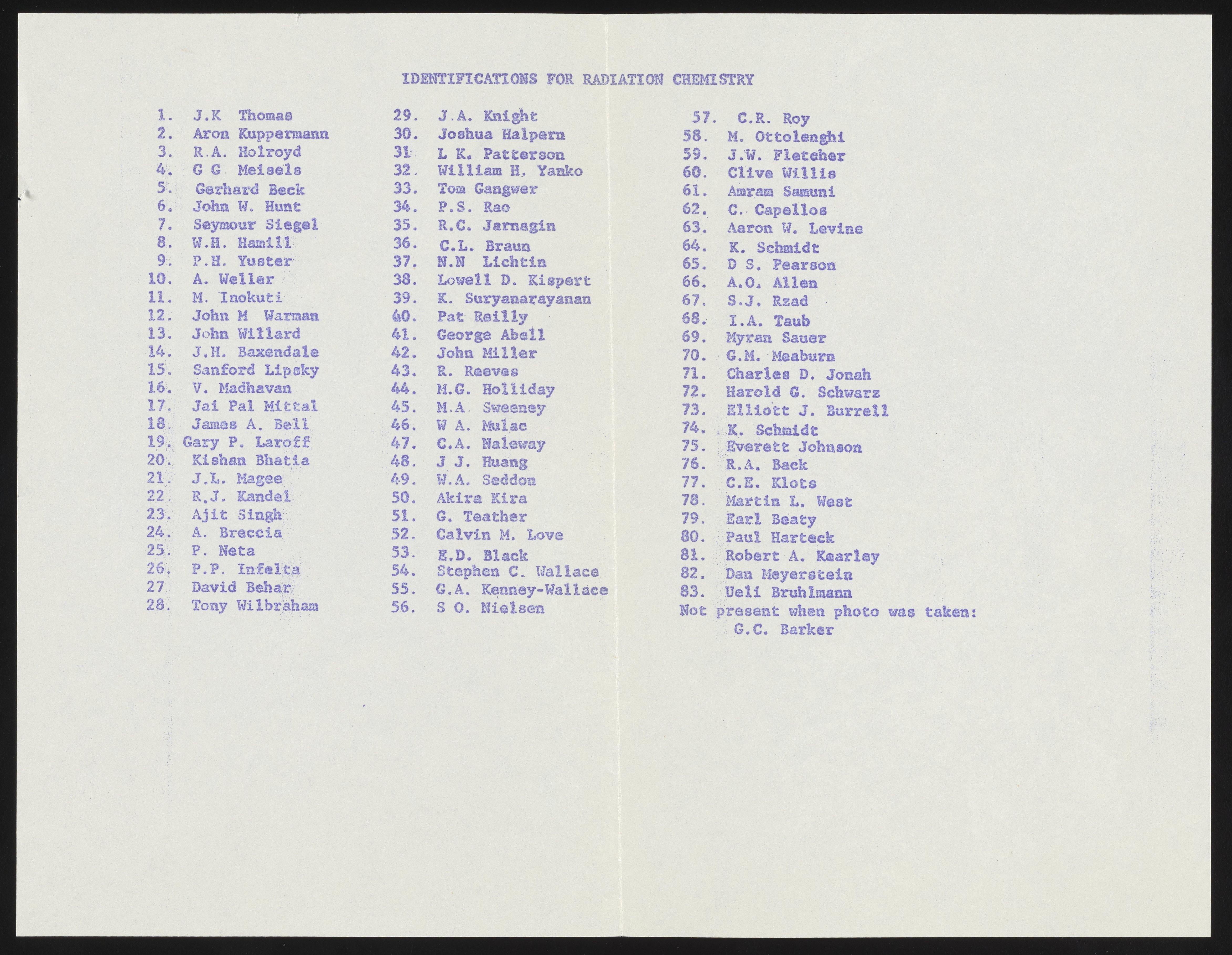 Small JPG1200 x 978px — 291 KBLarge JPG2880 x 2347px — 1.1 MBFull-sized JPG4223 x 3441px — 1.9 MBOriginal fileTIFF — 4223 x 3441px — 41.6 MBGroup photograph of attendees at the Gordon Research Conference on Radiation Chemistry held in New Hampton, New Hampshire in July 1972. Included with the photograph are a hand-drawn key and name list identifying the individuals depicted in the photo.