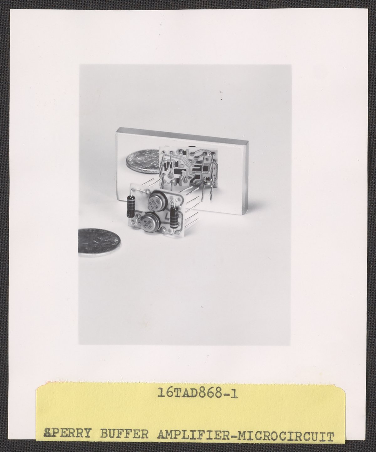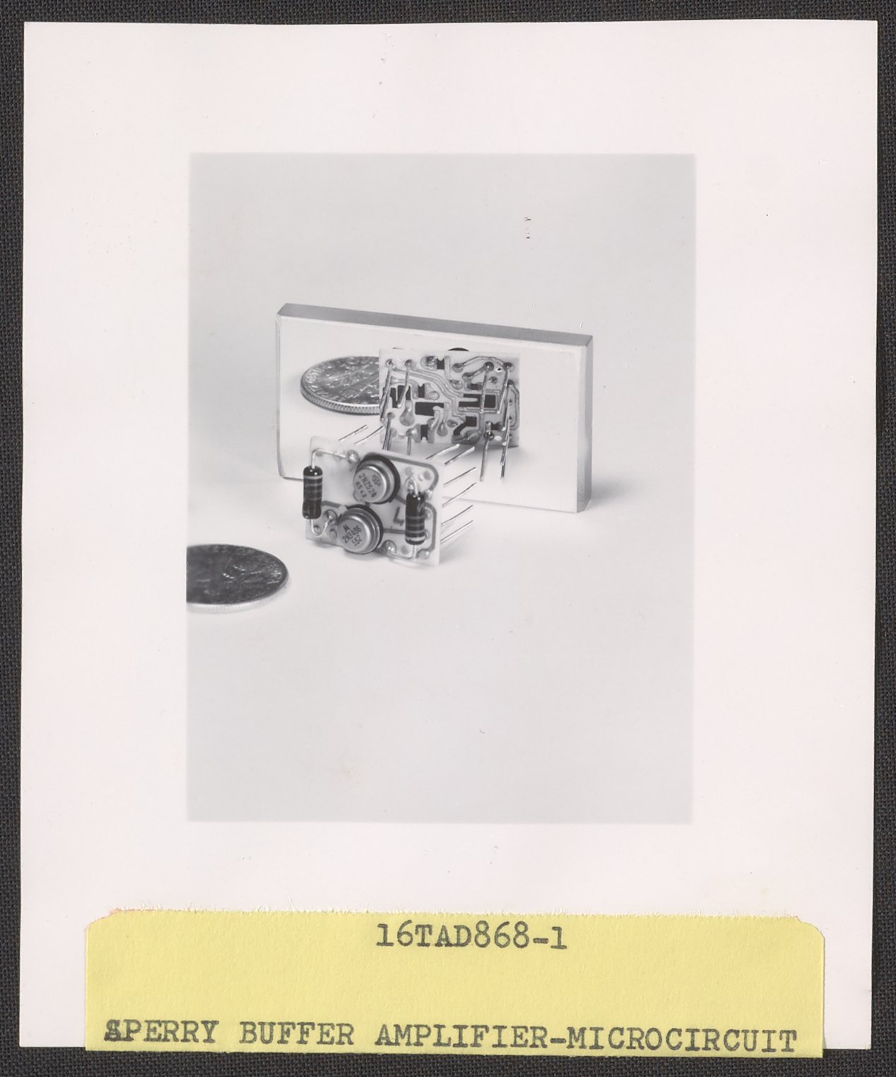 Dietrich, T. A. “Sperry Buffer Amplifier Microcircuit with a Mirror and Coin,” 1950–1969. Beckman Historical Collection, Box 85. Science History Institute. Philadelphia. https://digital.sciencehistory.org/works/2b88qc45x.